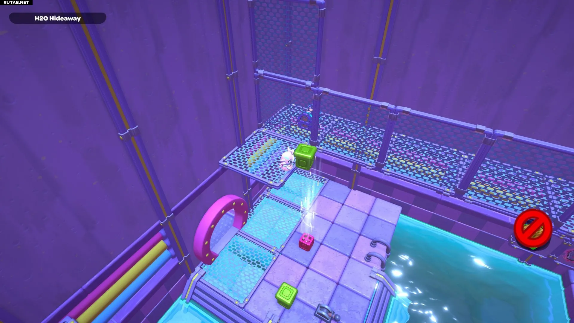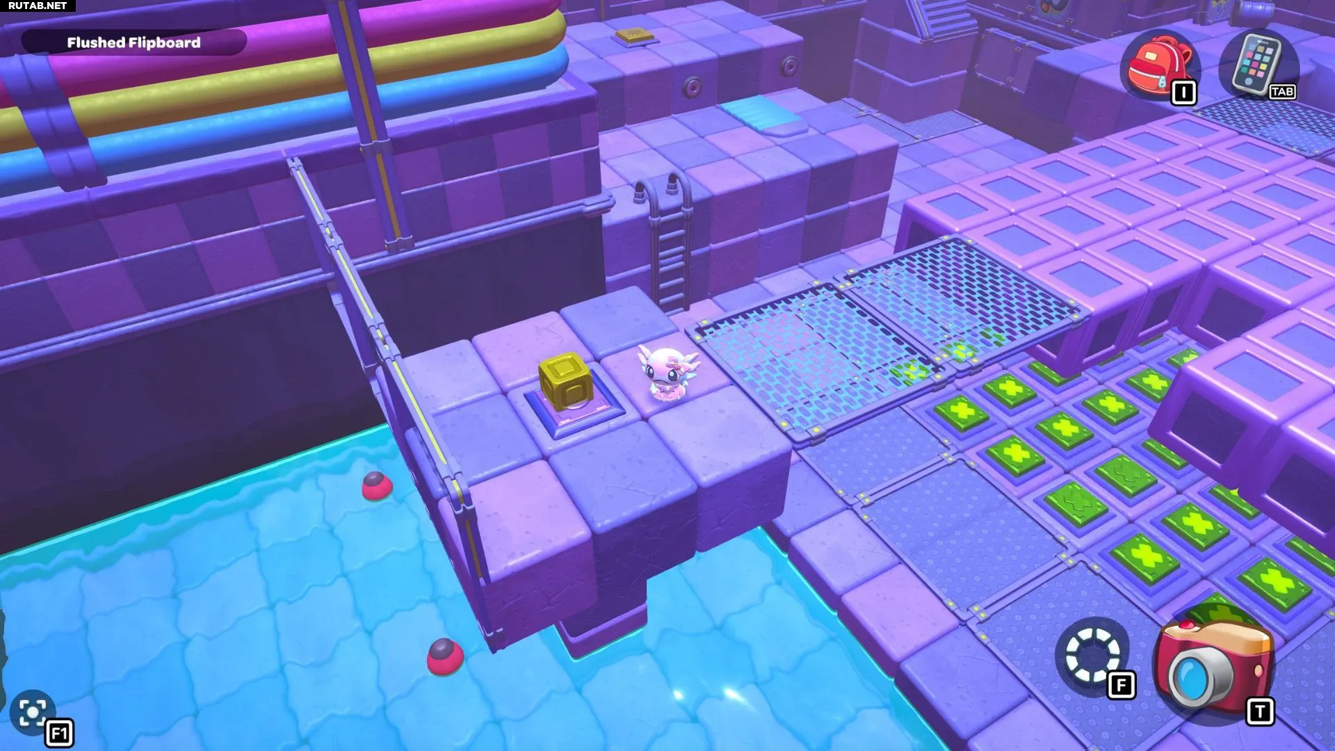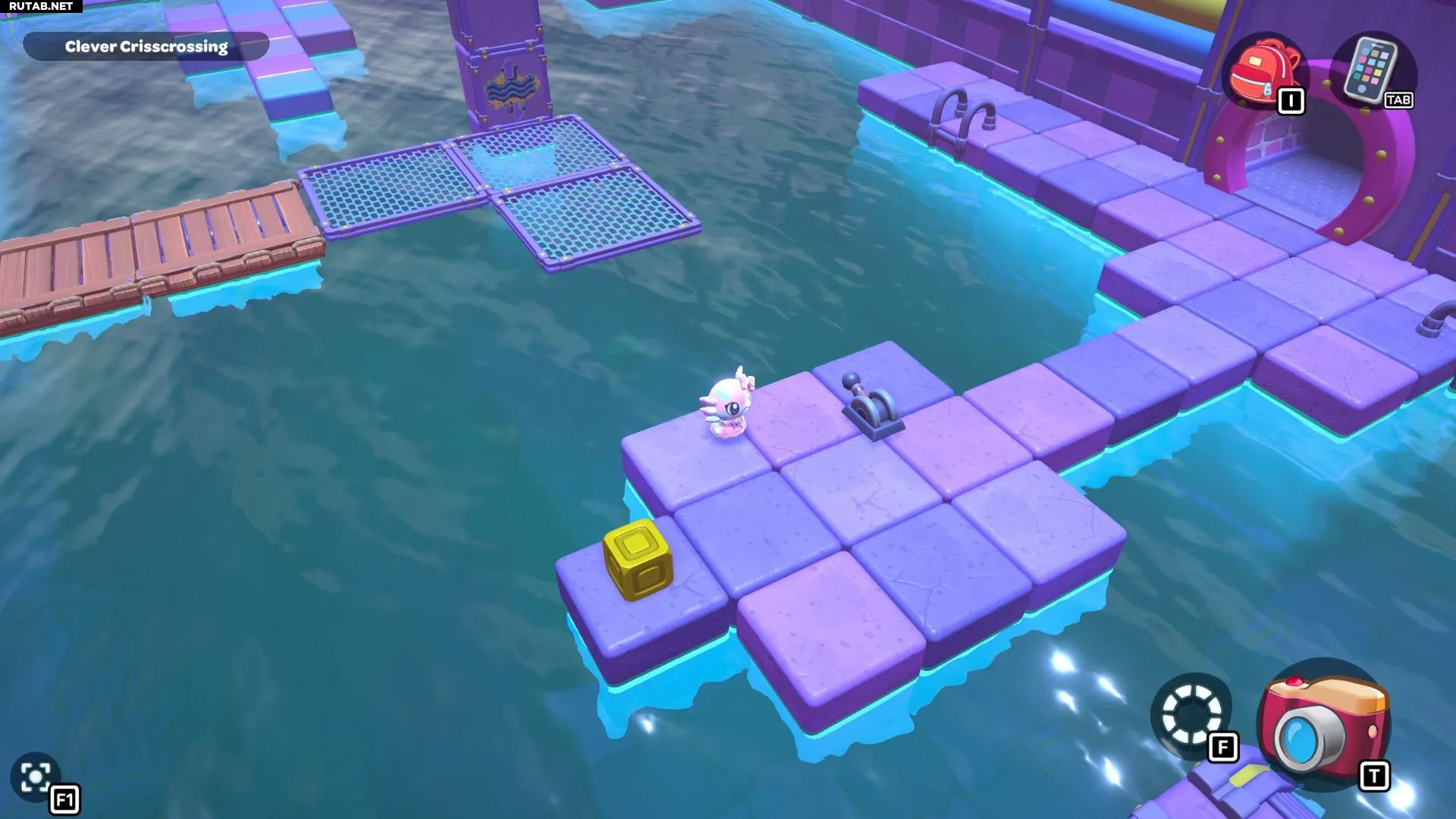 Проплывите обратно в левый угол комнаты и возьмите красный куб. Пройдите с ним по первой части моста, затем оставьте его на платформе перед высокой платформой, на которой стоит золотой куб на зелёном переключателе.
