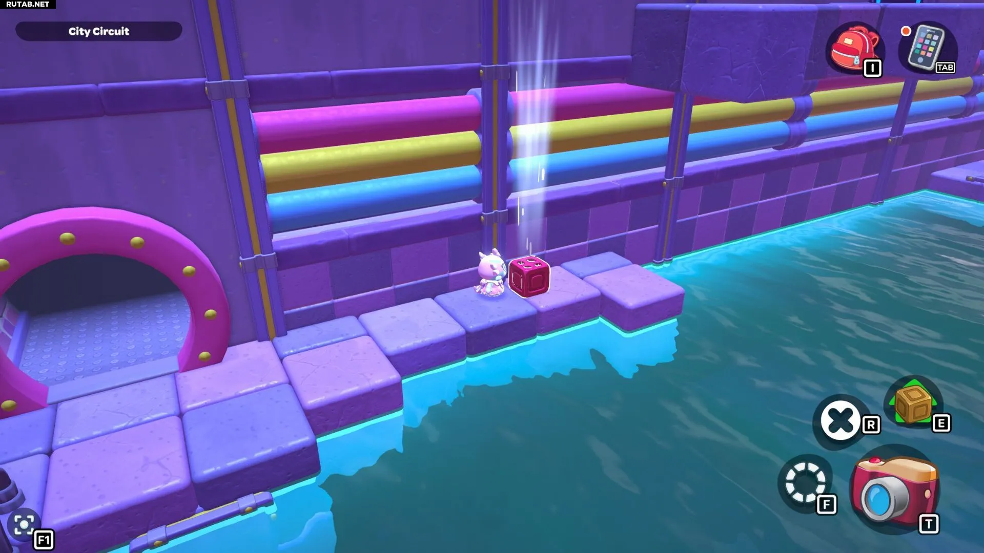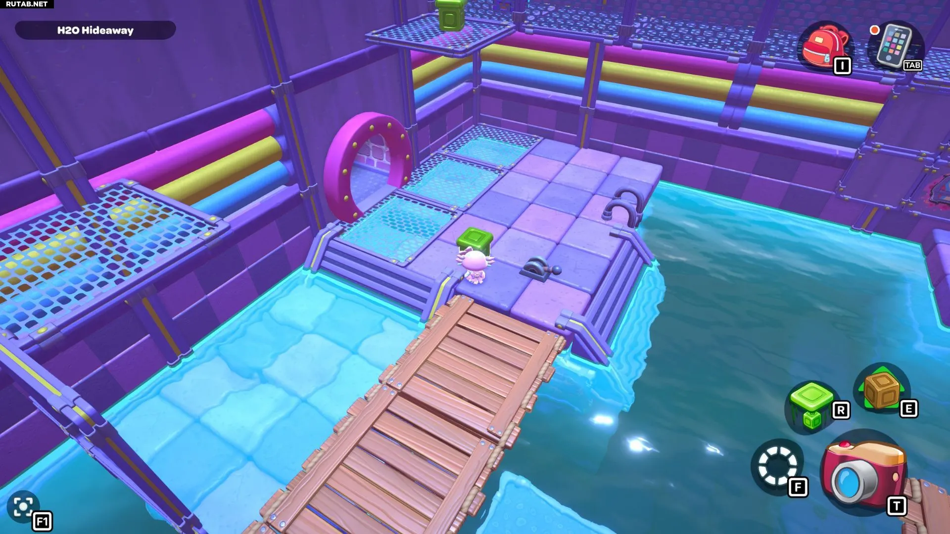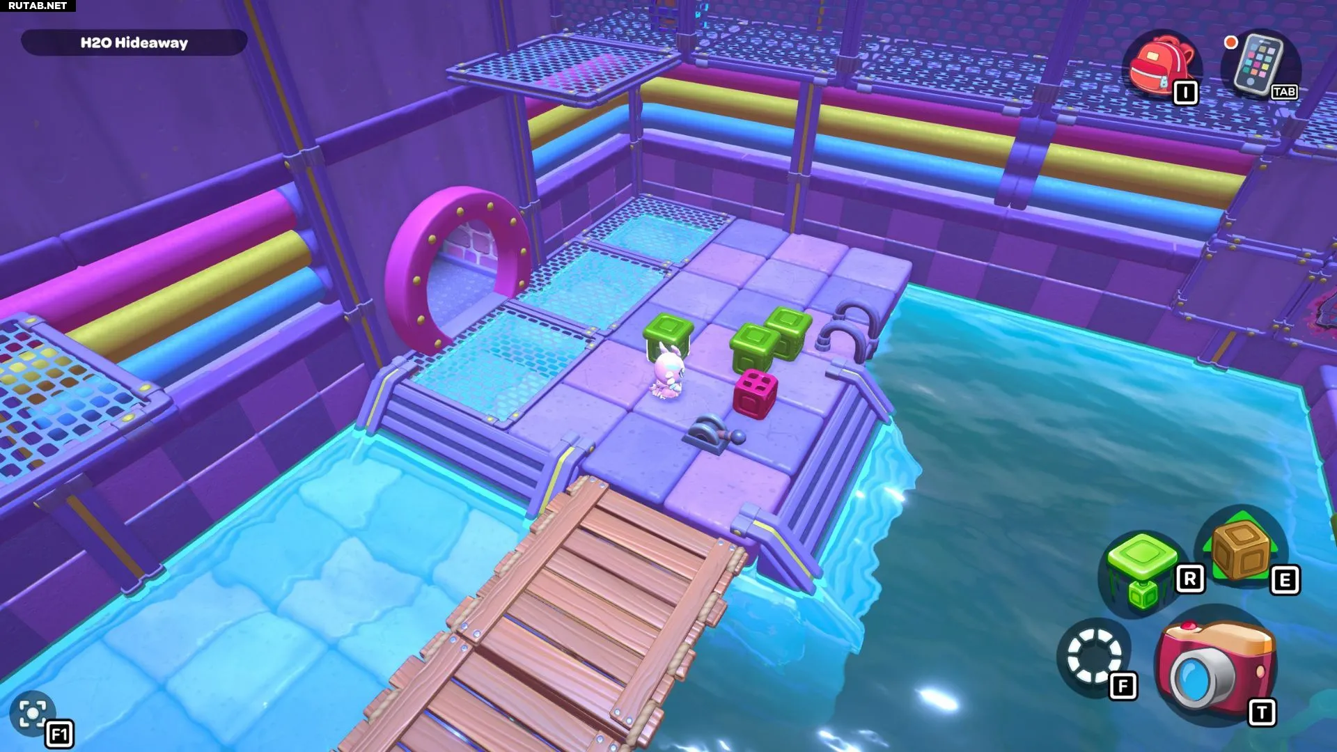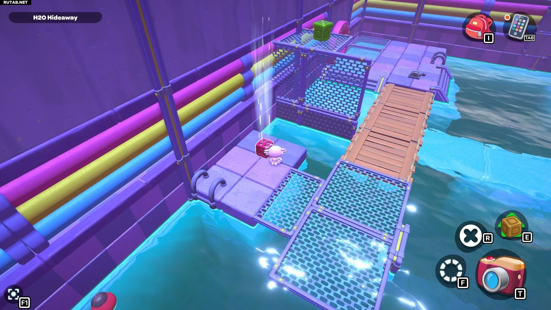 Проплывите обратно в левый угол комнаты и возьмите красный куб. Пройдите с ним по первой части моста, затем оставьте его на платформе перед высокой платформой, на которой стоит золотой куб на зелёном переключателе.