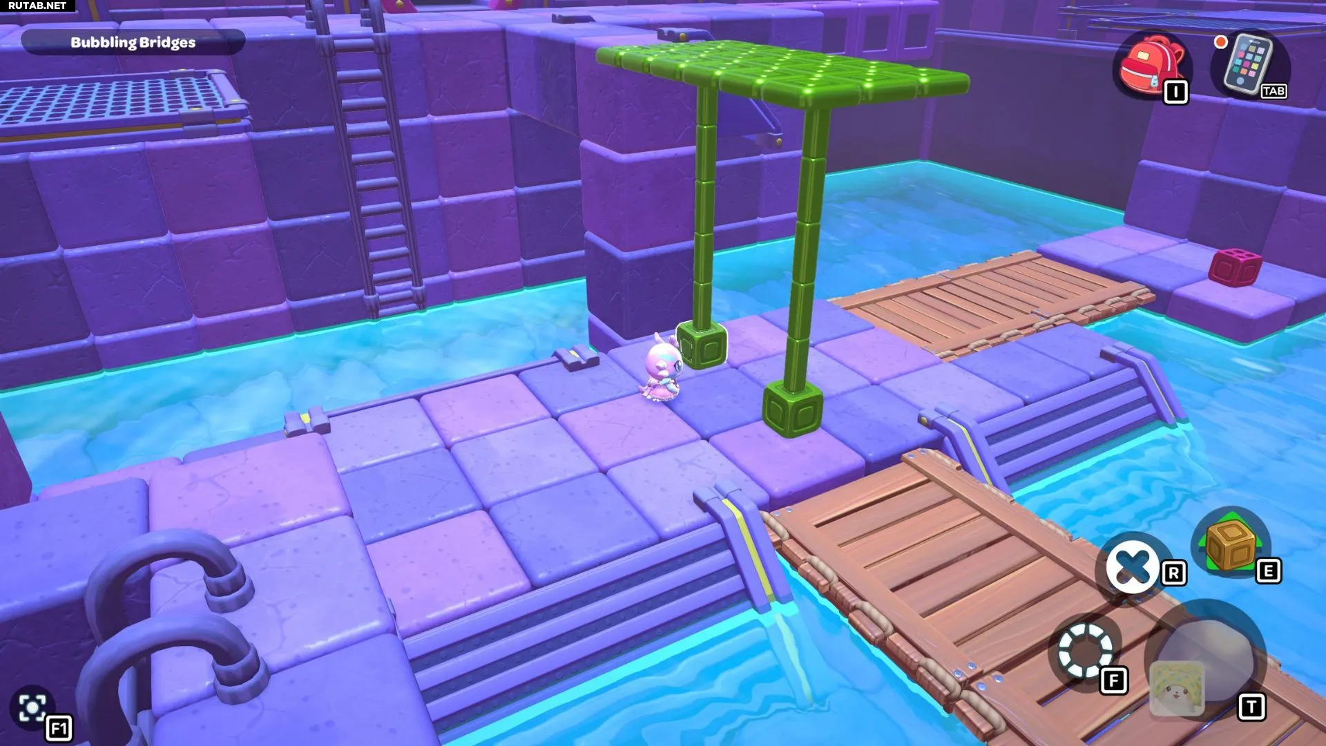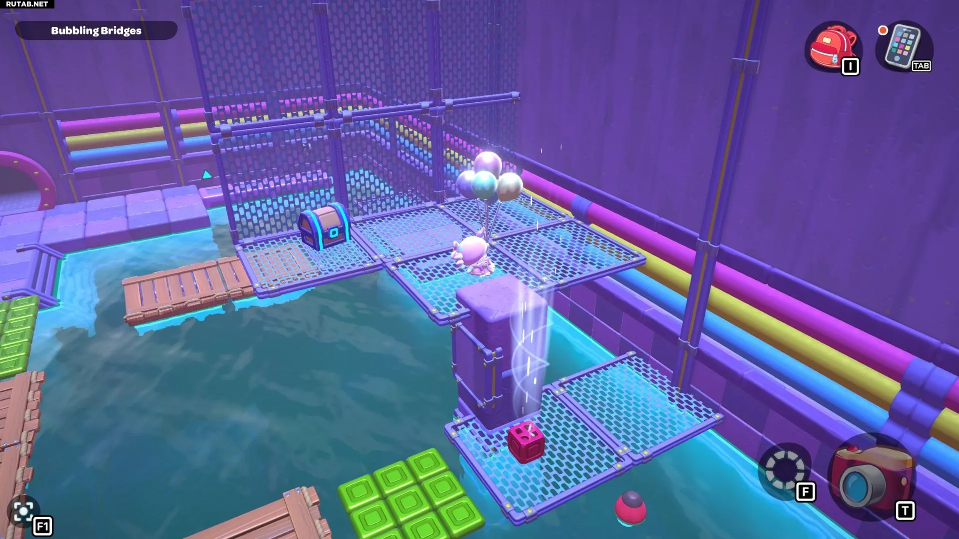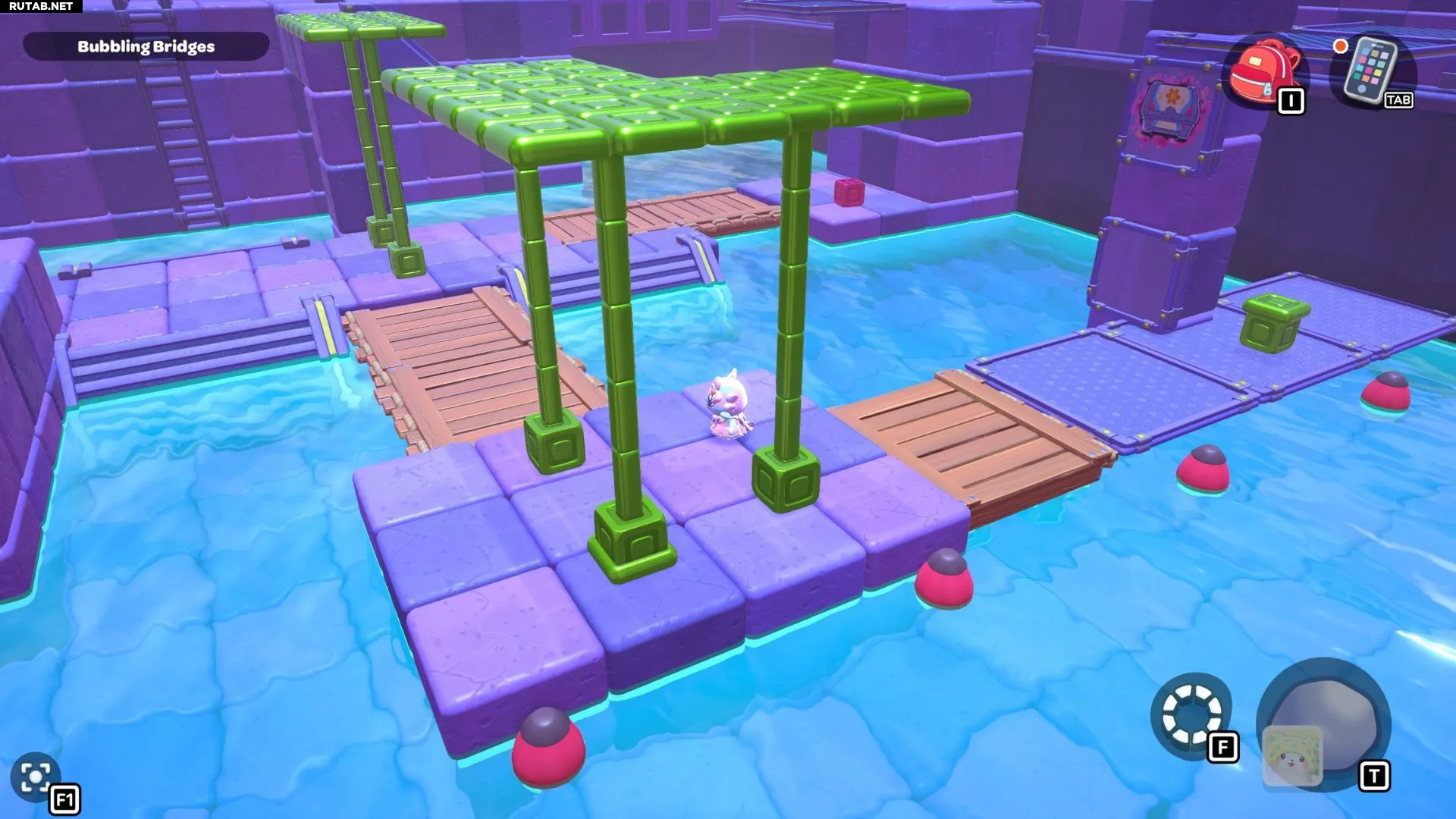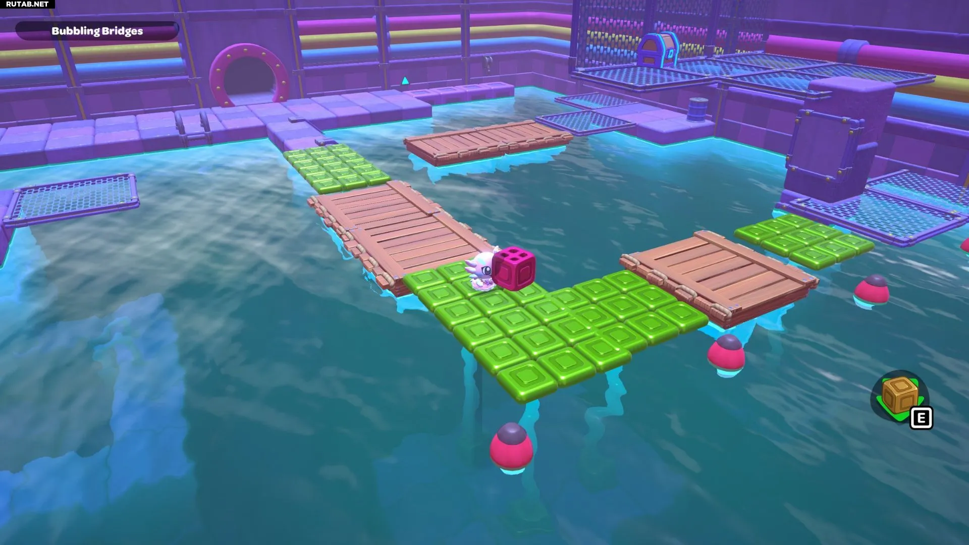 Комната-головоломка «Пузырящиеся мосты» — это дверь слева в северо-восточном углу канализации Городка. Решение этой головоломки заключается в создании серии мостов с помощью зелёных кубов в комнате. Вам нужно будет использовать эти мосты, чтобы переместить красный куб и подлететь к сундуку комнаты.
