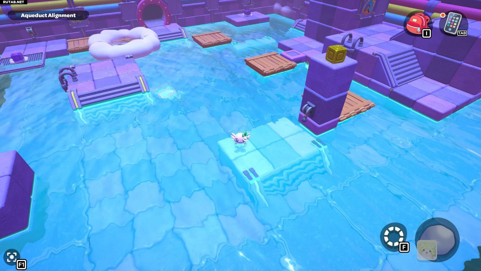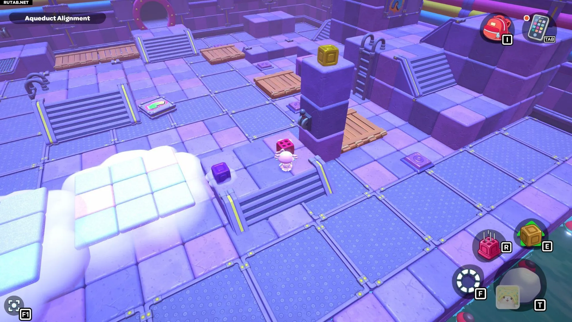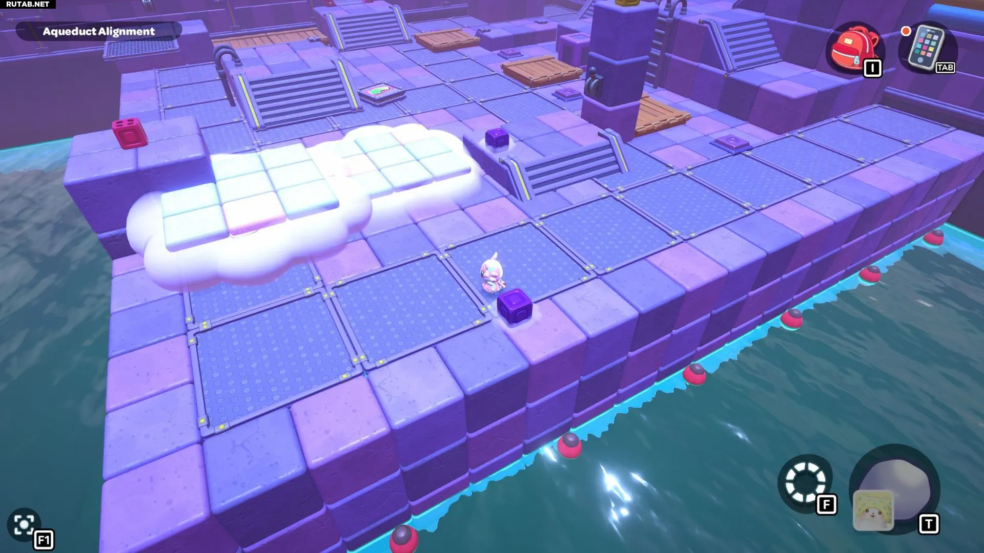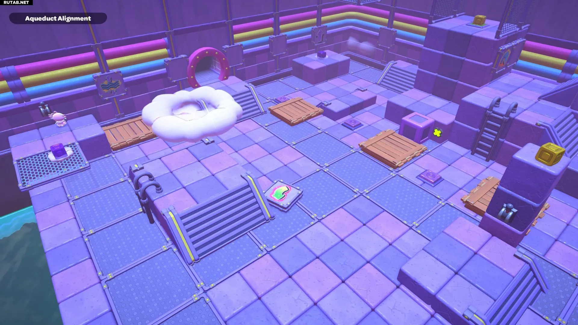 Вернитесь к одному из рычагов в комнате и опустите уровень воды. Возьмите фиолетовый куб с самого левого переключателя и отнесите его на центральную платформу с рычагом. Поверните куб так, чтобы его облако оказалось над разрывом в созданном вами пути. Взаимодействуйте с кубом, чтобы создать облачные платформы, затем снова поднимите уровень воды.