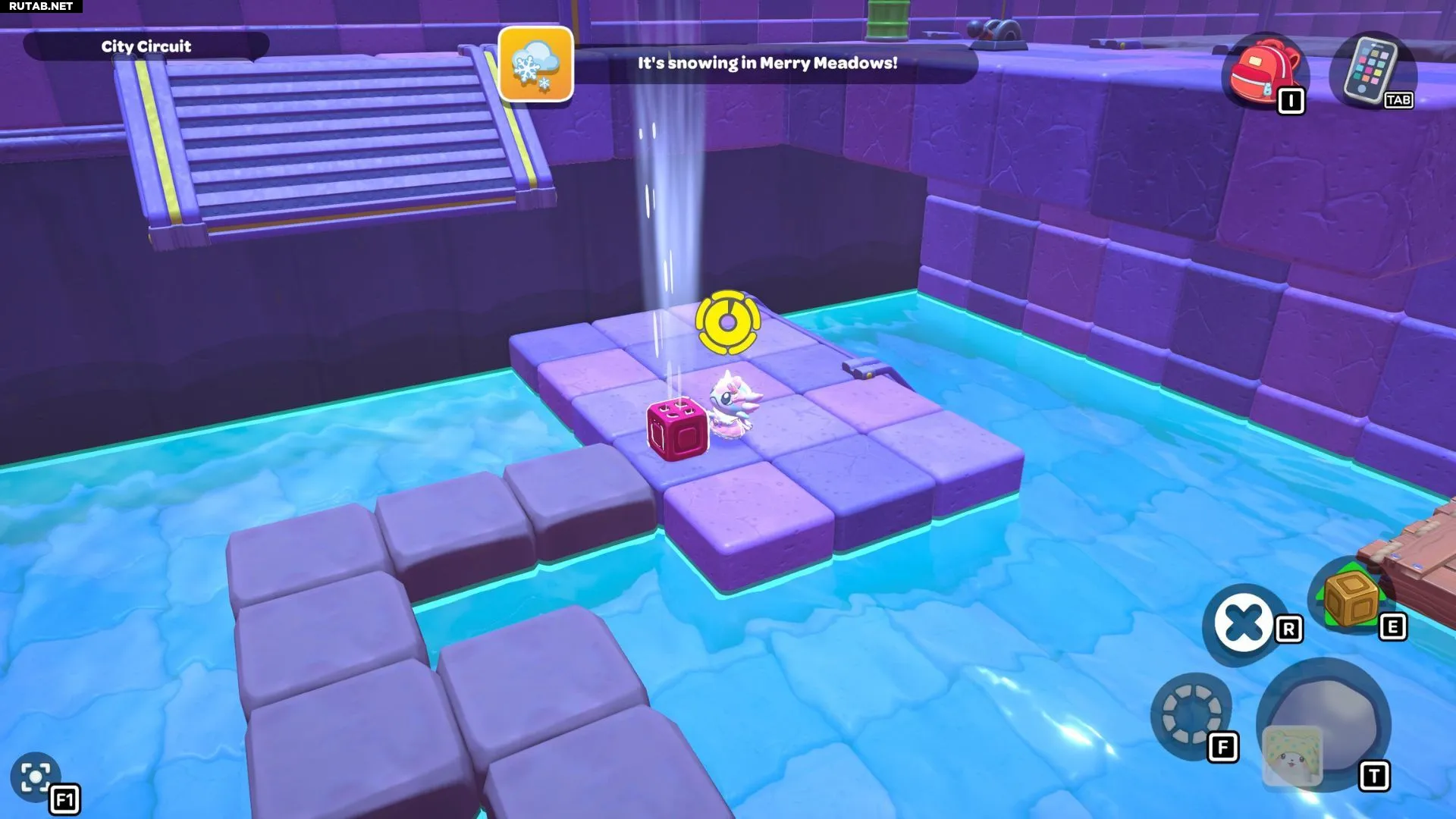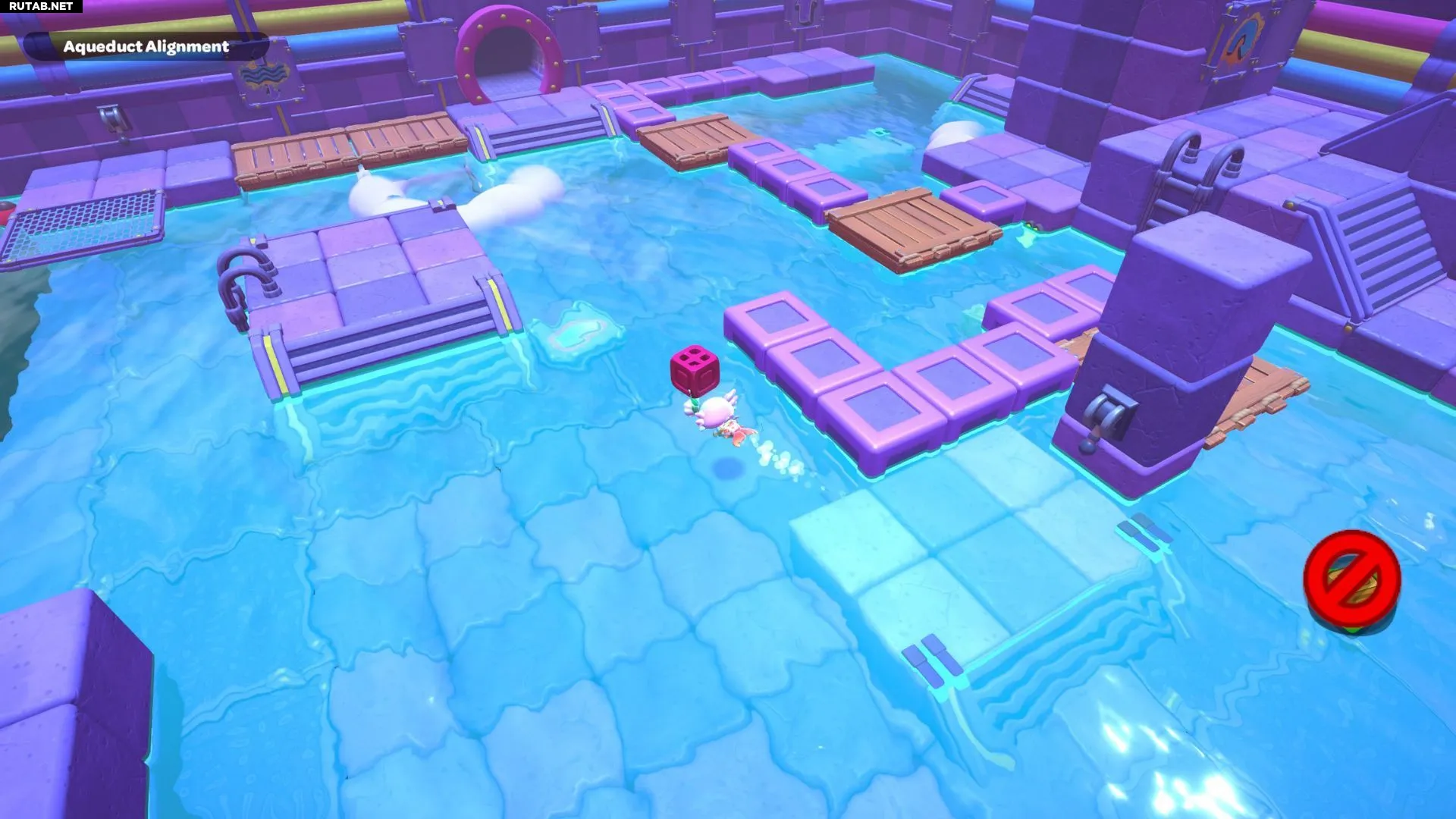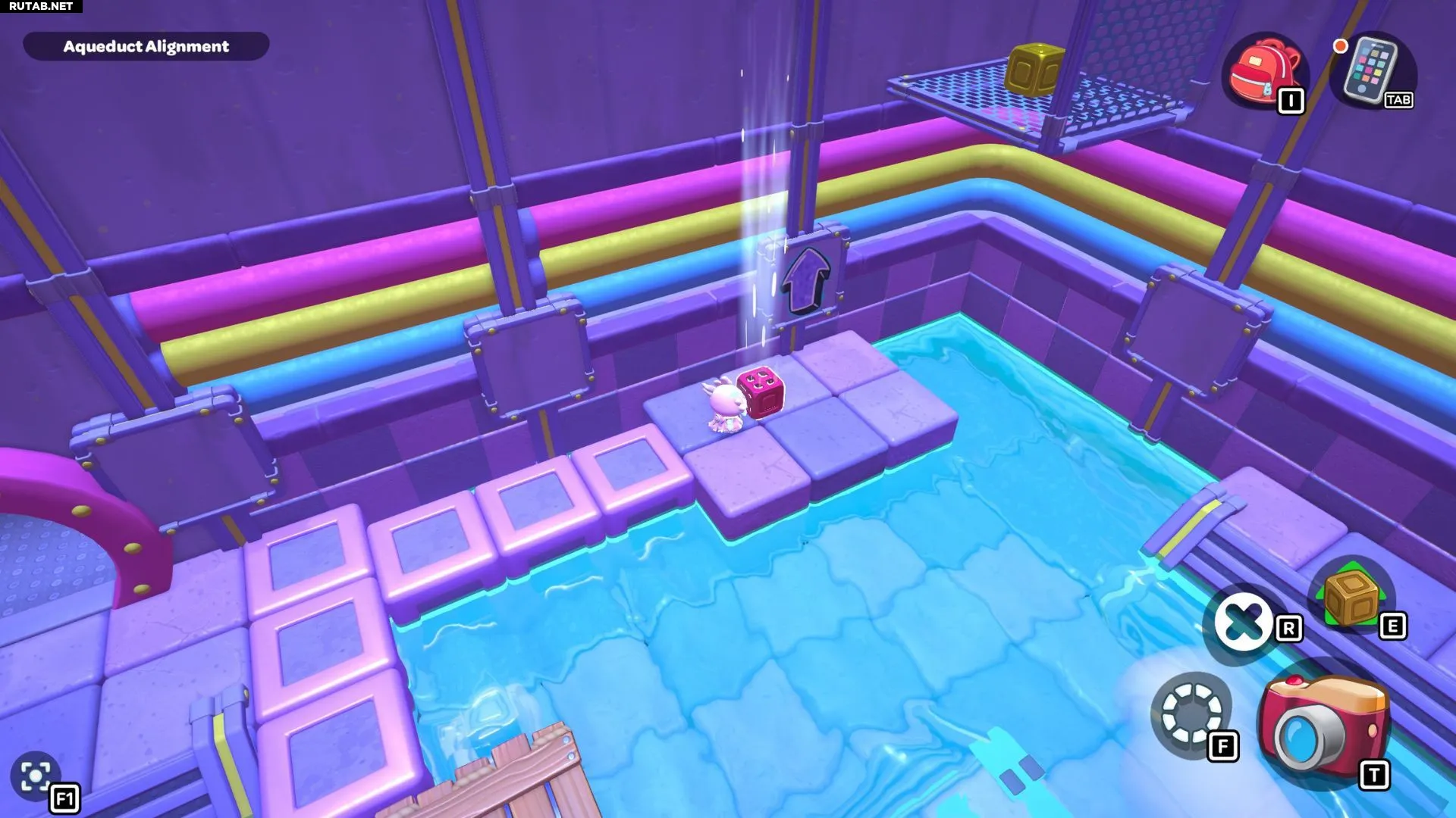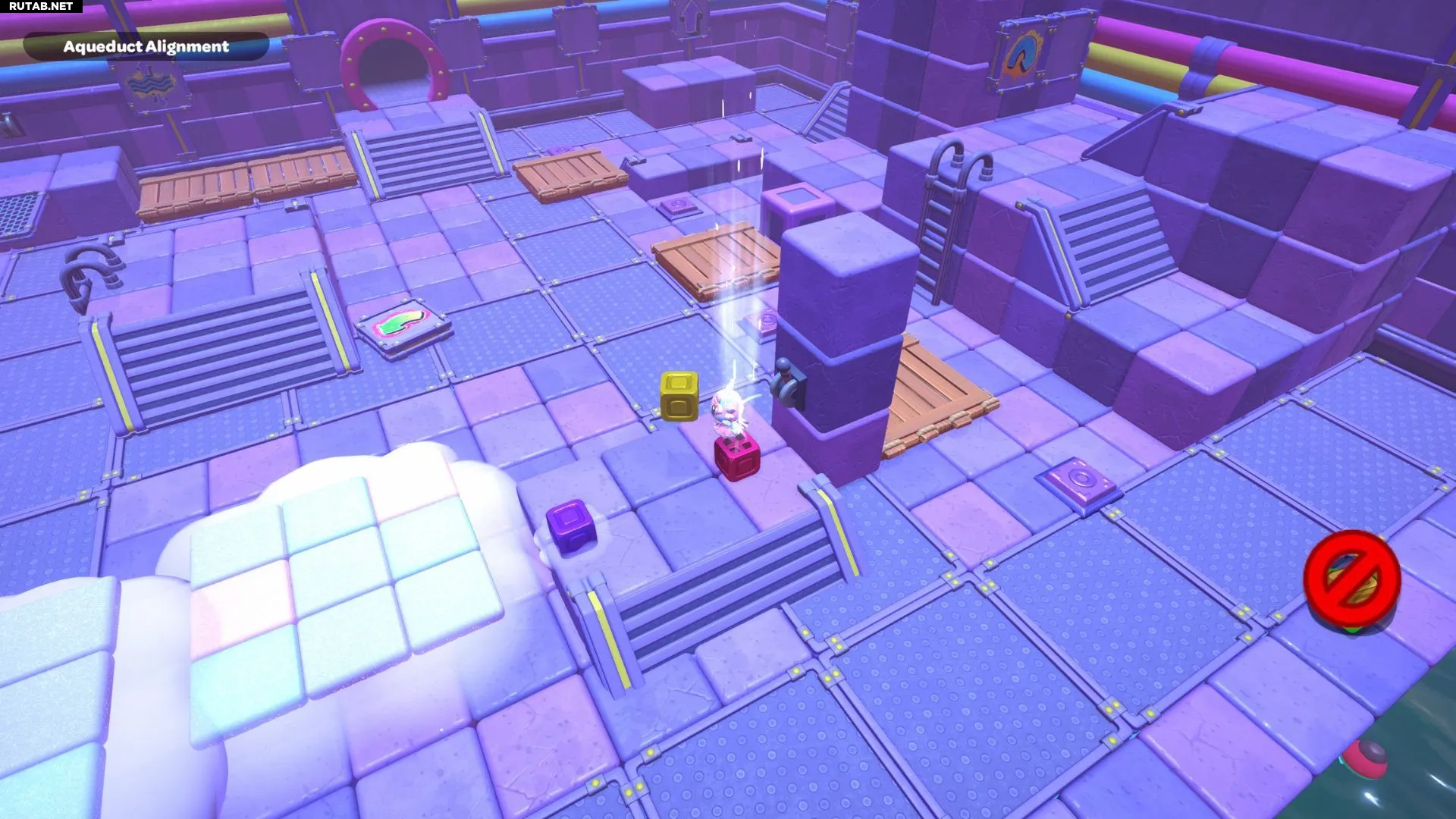 Вернитесь к одному из рычагов в комнате и опустите уровень воды. Возьмите фиолетовый куб с самого левого переключателя и отнесите его на центральную платформу с рычагом. Поверните куб так, чтобы его облако оказалось над разрывом в созданном вами пути. Взаимодействуйте с кубом, чтобы создать облачные платформы, затем снова поднимите уровень воды.