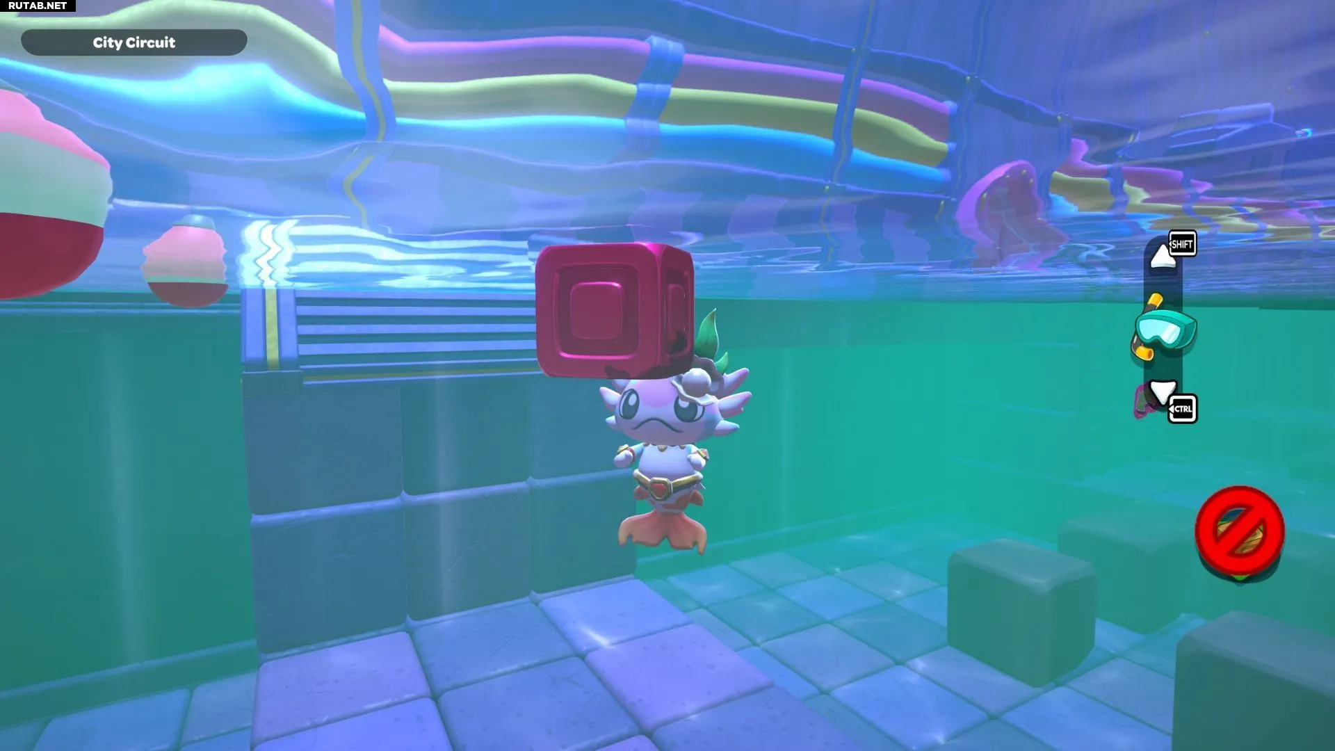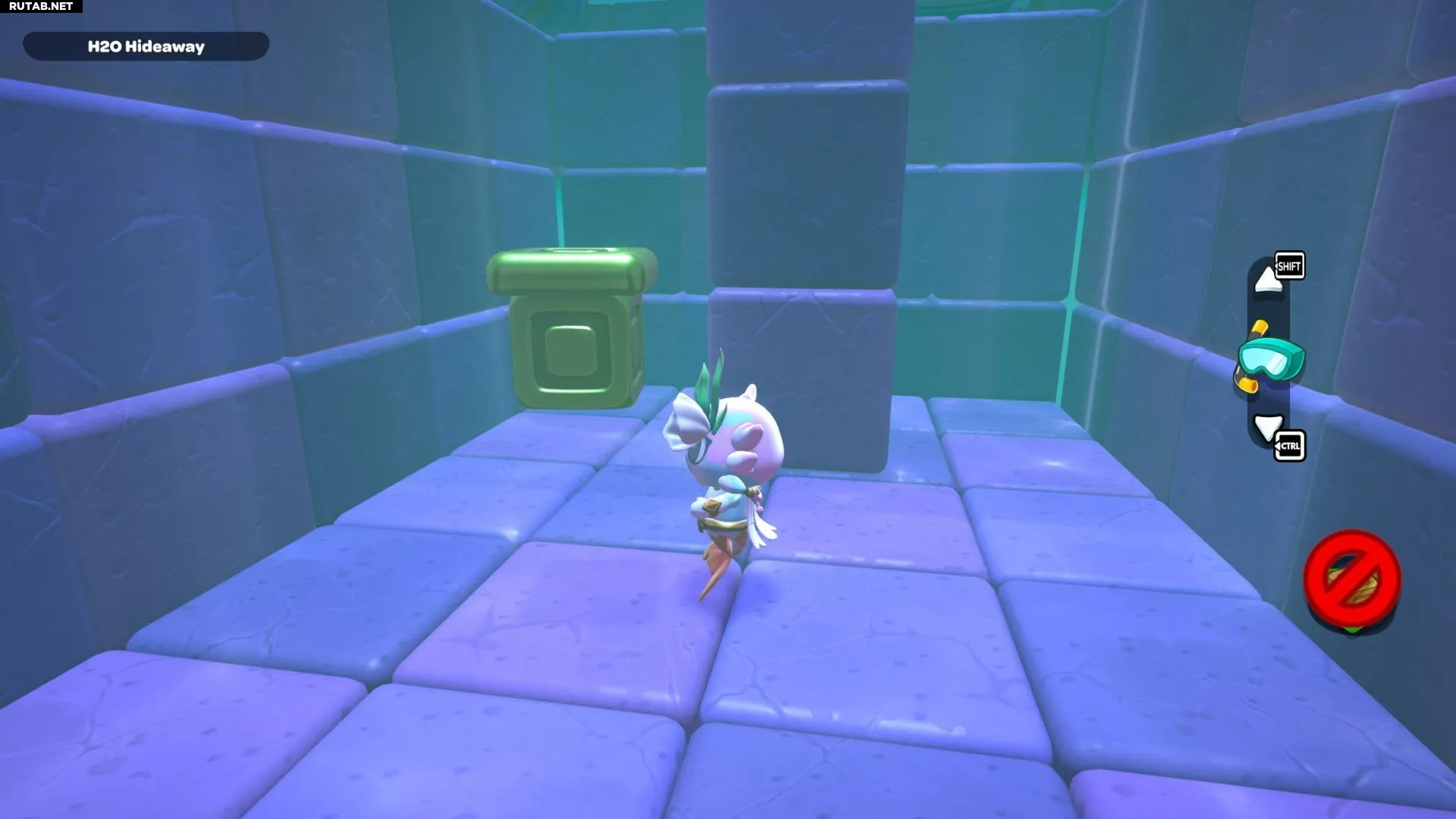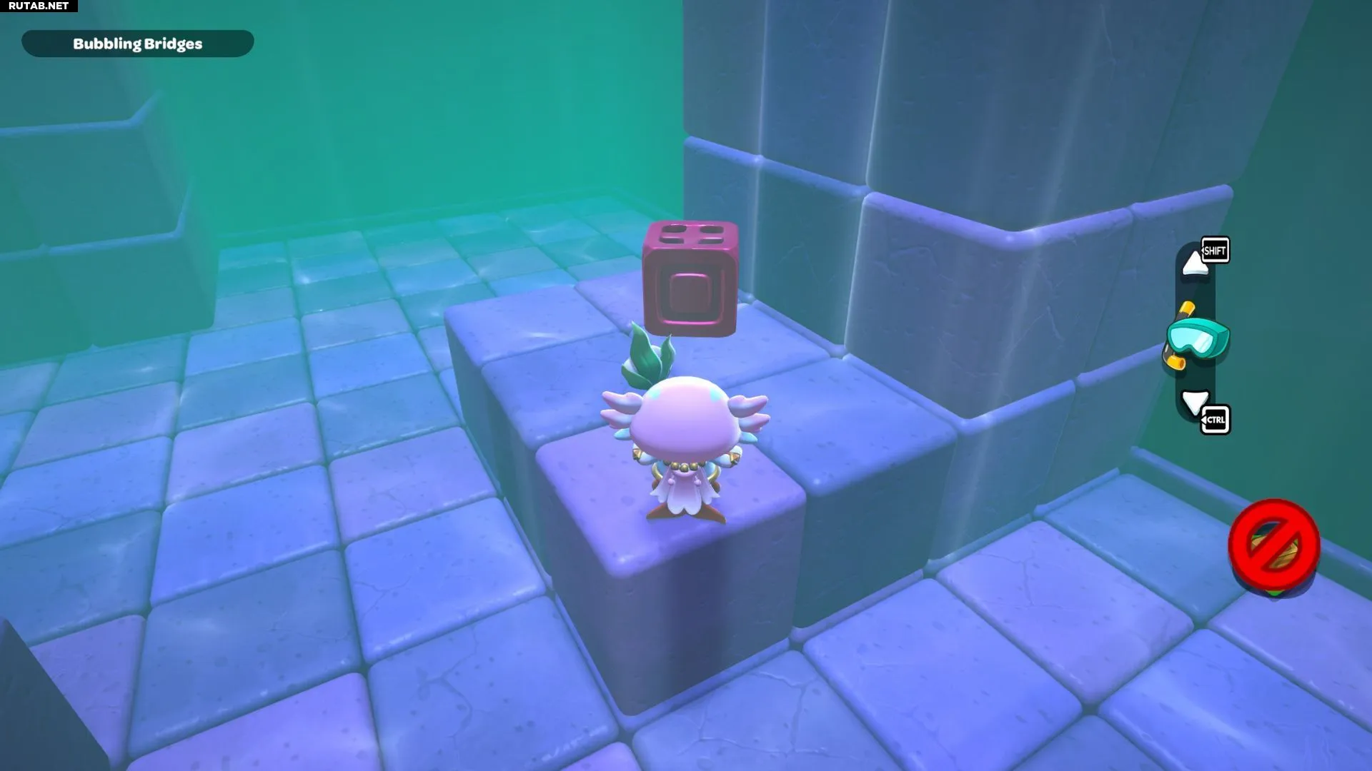 Пройдите по созданному пути с красным кубом, пока не окажетесь на платформе под сундуком. Поставьте красный куб, активируйте его и подлетите на верхнюю платформу. Открыв сундук, вы получите Шляпу «Морская водоросль».