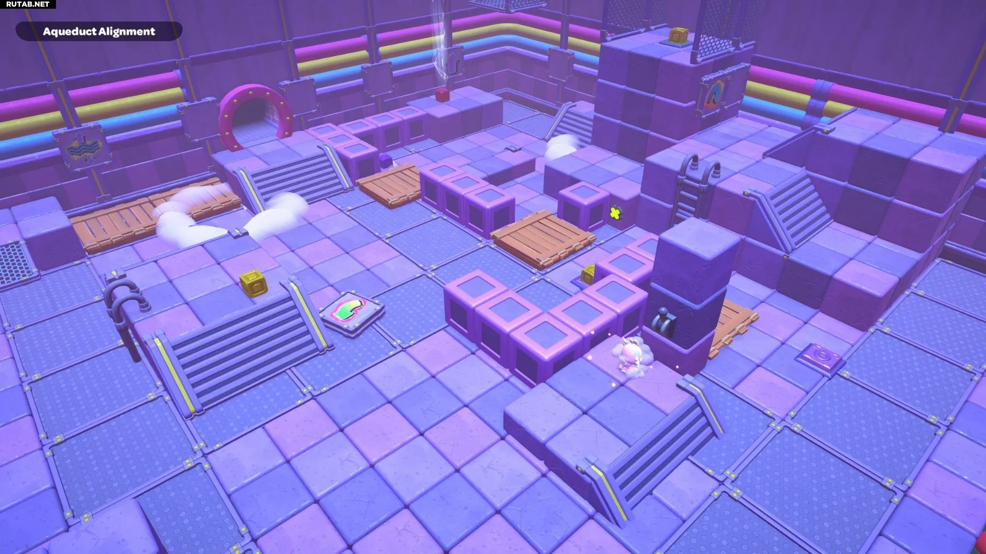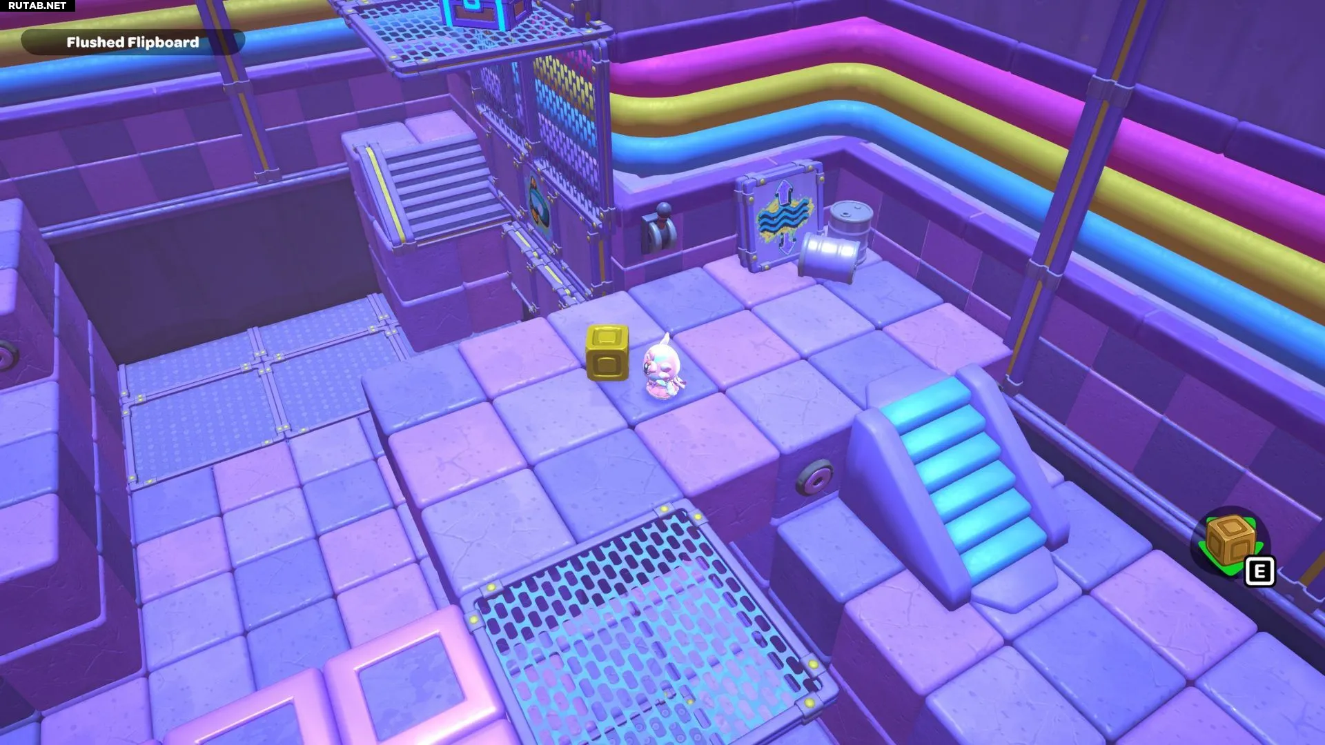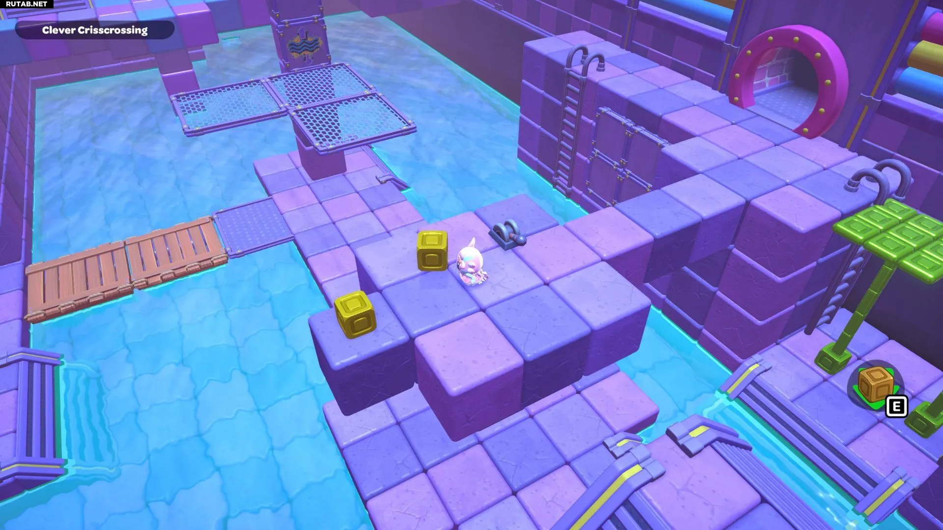 Дойдите до платформы на южном конце комнаты и поставьте коробку на фиолетовый переключатель. Это приведёт к тому, что в комнате появятся две новые лестницы.