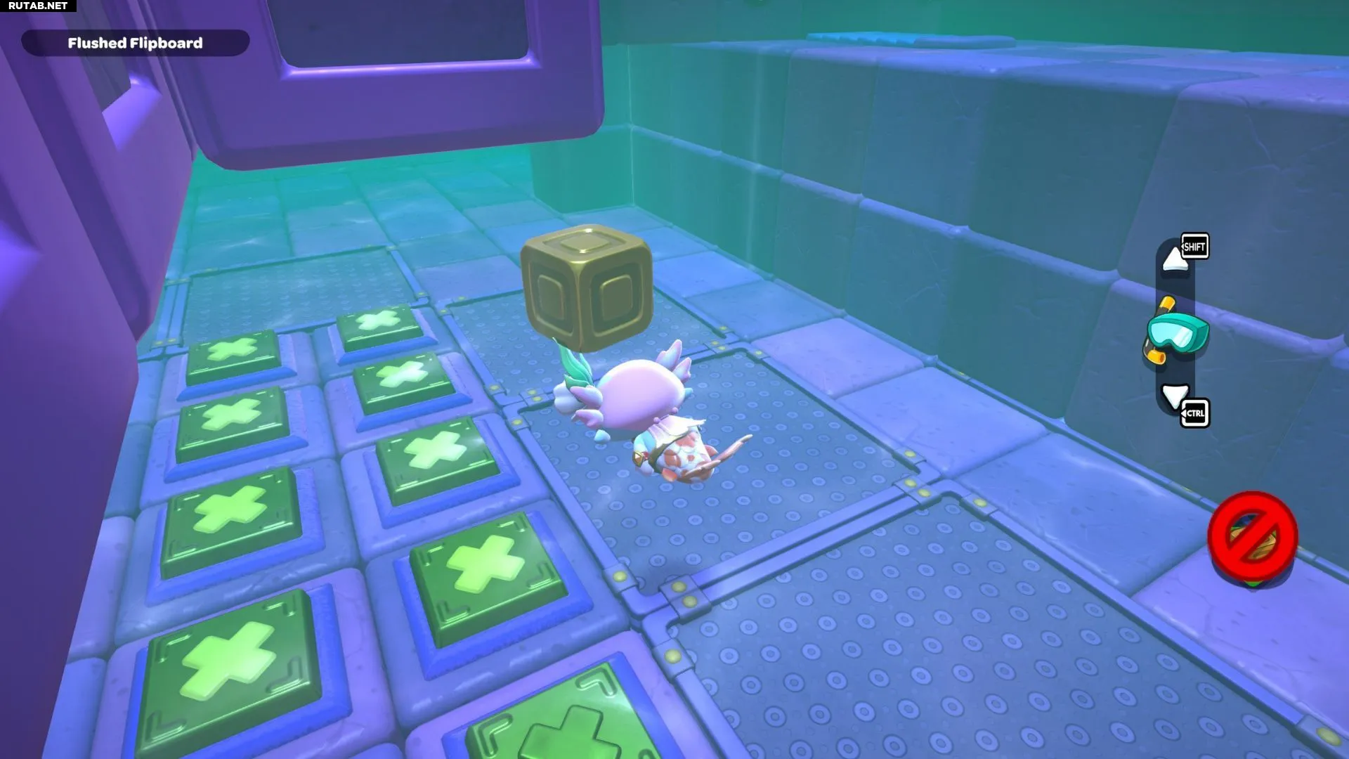 Войдя в комнату, вы увидите большой участок пола, покрытый зелёными панелями с крестиками. Над панелями, которые подсвечены, парят фиолетовые кубы.
