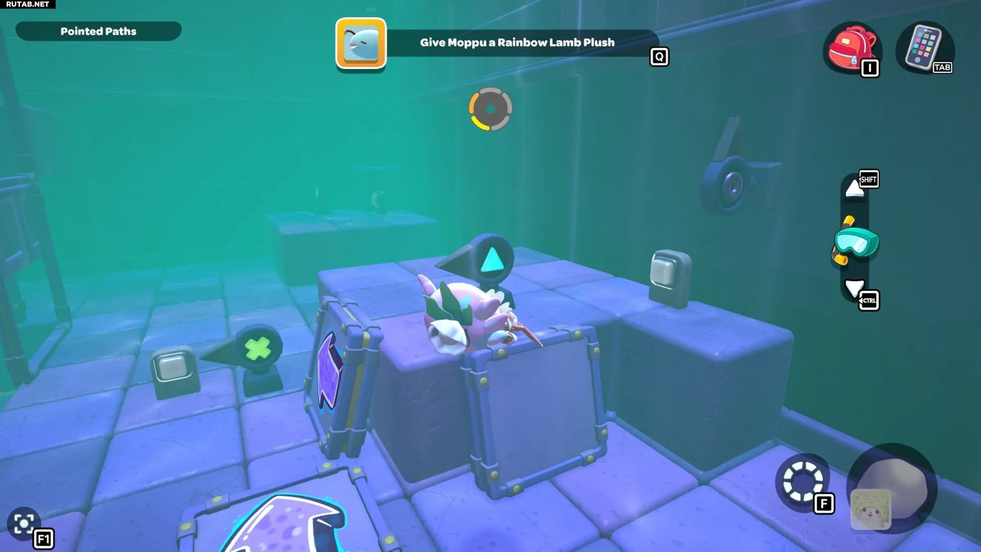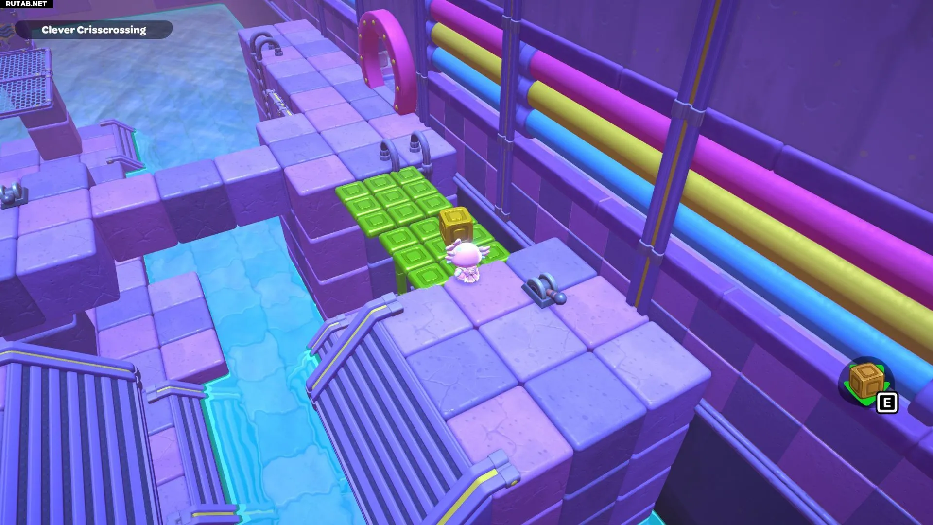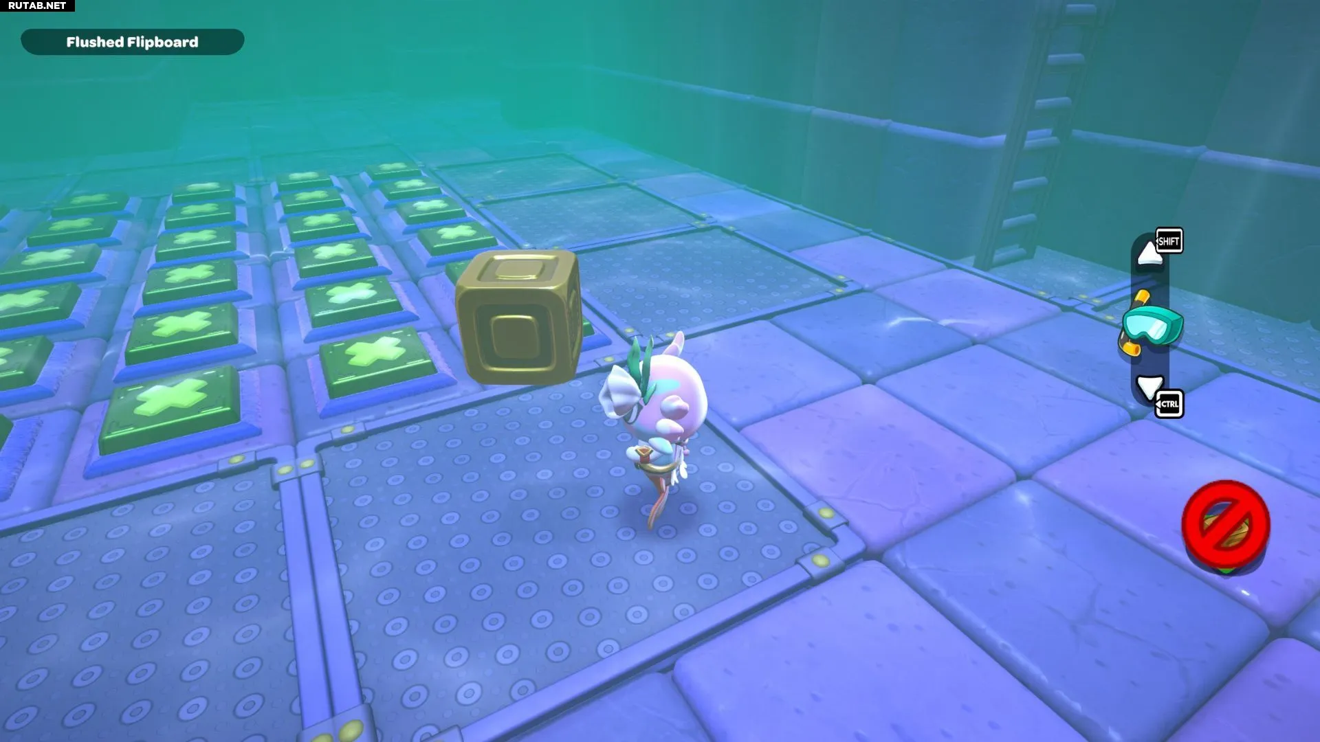 Второй куб вы найдёте под водой перед платформой с кнопкой-треугольником. Перепрыгните по пути на эту платформу, затем нырните перед ней, чтобы найти куб. Возьмите его и поставьте на лестницу рядом с другим кубом. Теперь вы можете снова потянуть рычаг, чтобы опустить воду.