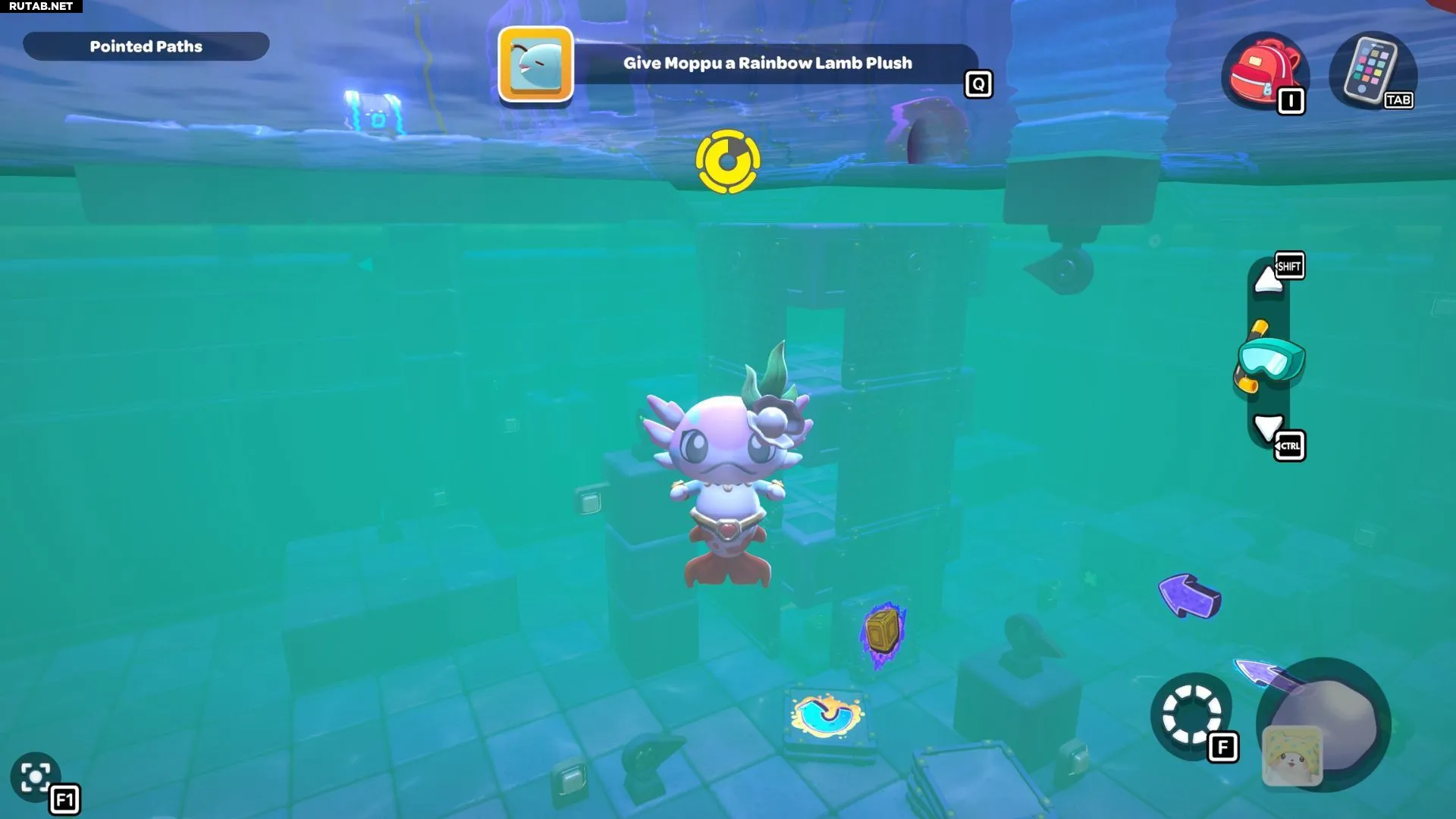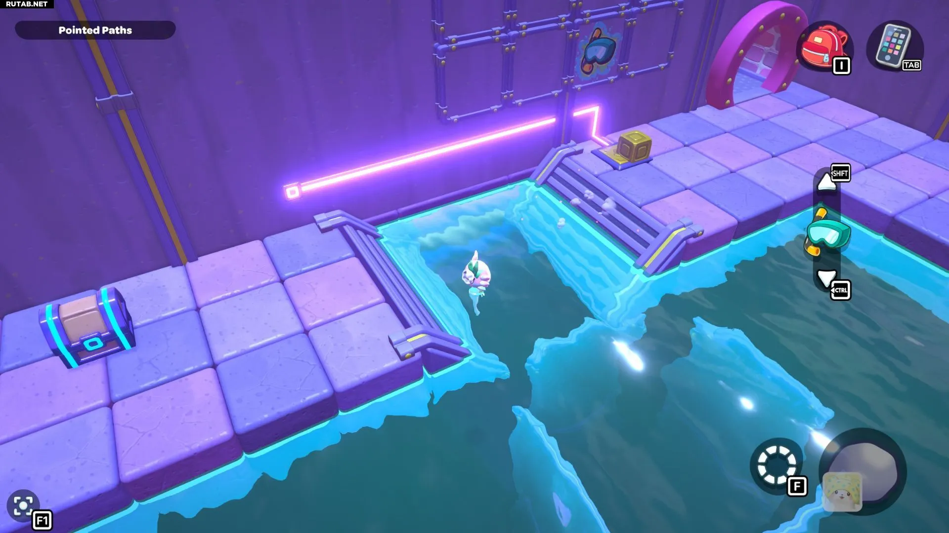 Нырните в воду перед лестницей, чтобы поднять красный куб. Отнесите его к правому краю этой платформы и активируйте. Поднимитесь на более высокий уступ, чтобы открыть скрытый сундук, содержащий 20 палочек.