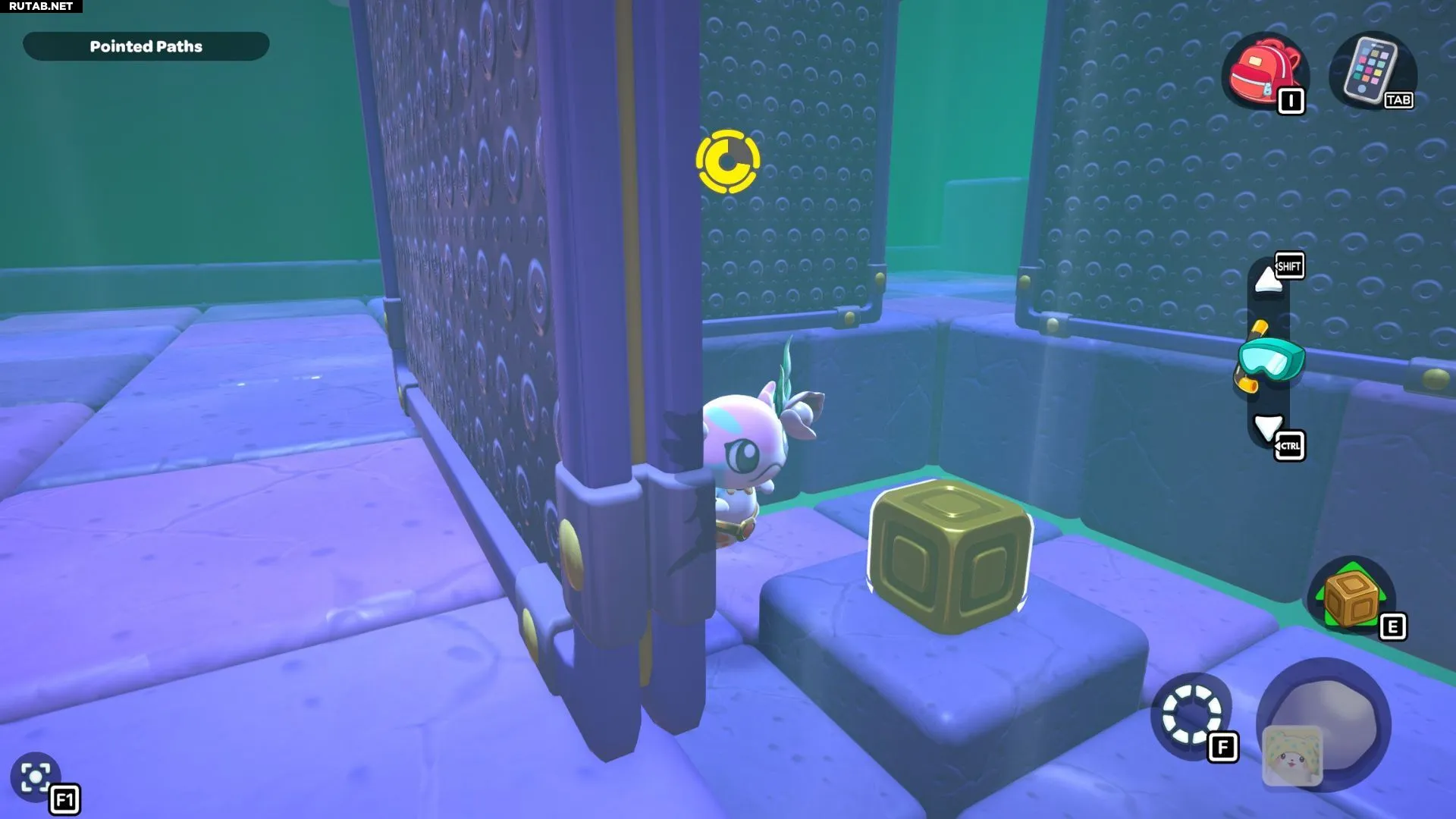 После того как все указатели будут правильно повёрнуты, вы сможете проплыть к панелям в центре комнаты и взять куб. Отнесите куб к двери и поставьте его на золотой переключатель. Это откроет путь к сундуку комнаты, в котором находится Платье «Мусорный бак».