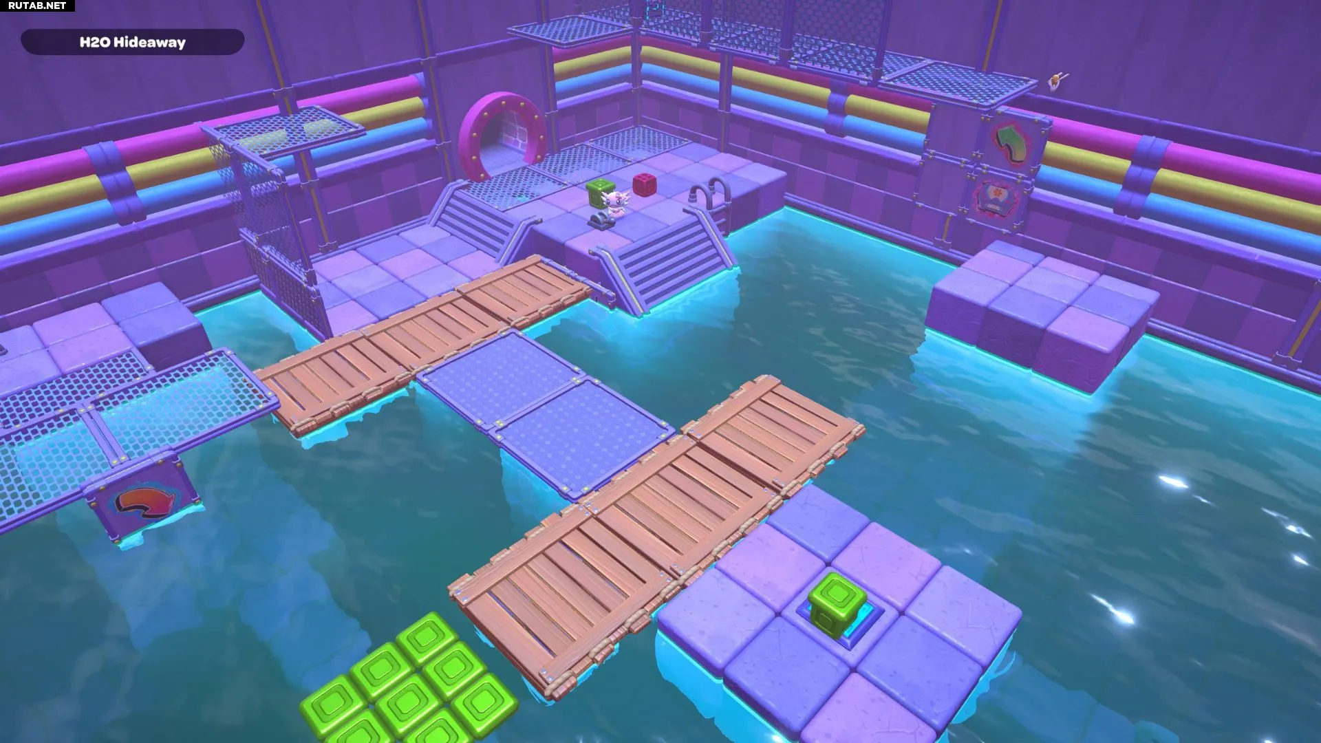 Начните головоломку с того, что потяните рычаг в центре комнаты, чтобы опустить уровень воды. Как только вода уйдёт, спрыгните на пол комнаты. Вы должны увидеть два зелёных куба на полу: один ближе к центру комнаты, а другой — с левой стороны деревянных платформ.