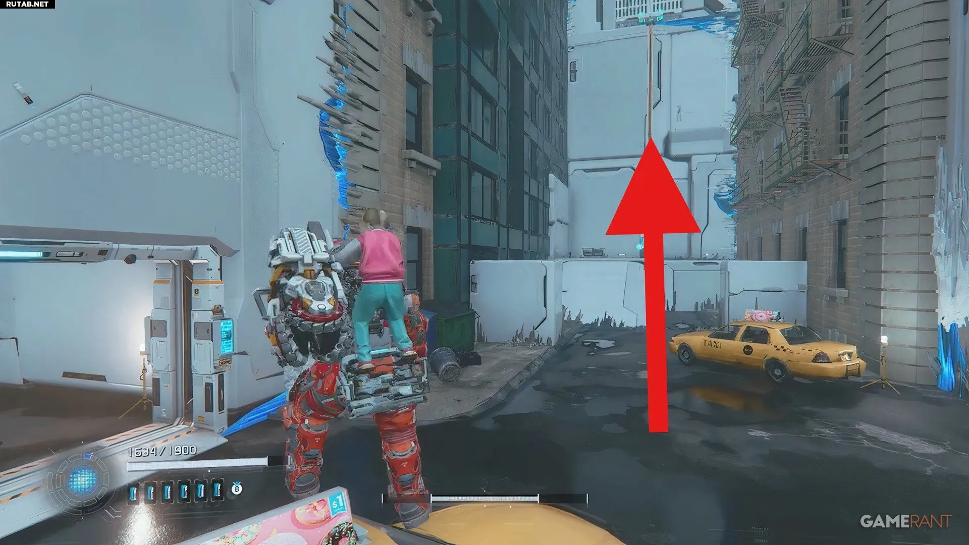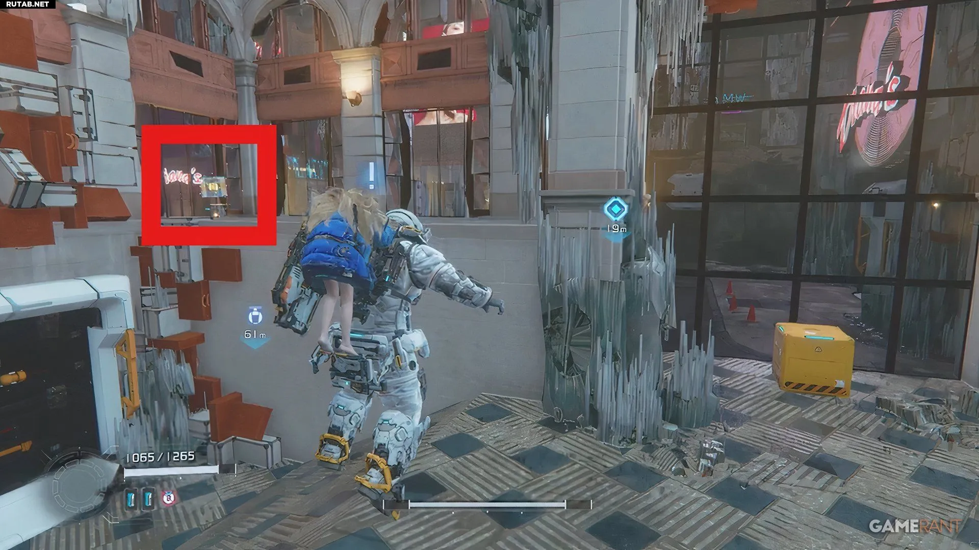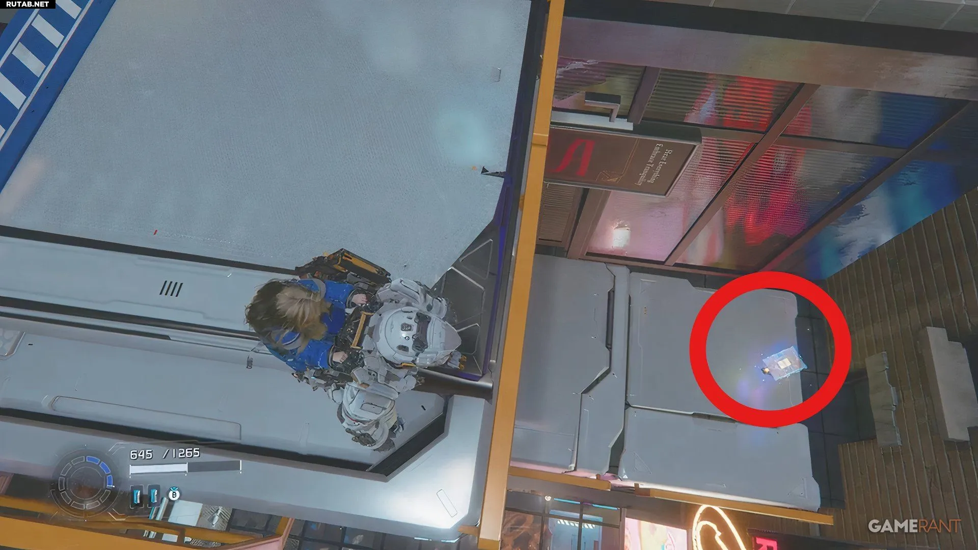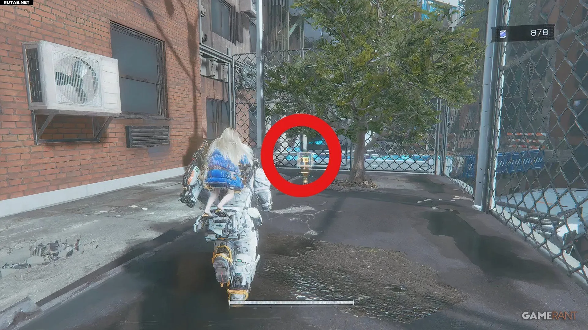 Когда вы попадёте на открытую площадь, напоминающую Таймс-сквер, спрыгните вниз и сразу развернитесь лицом к точке выхода. Компонент для улучшения будет слева под строительными лесами.