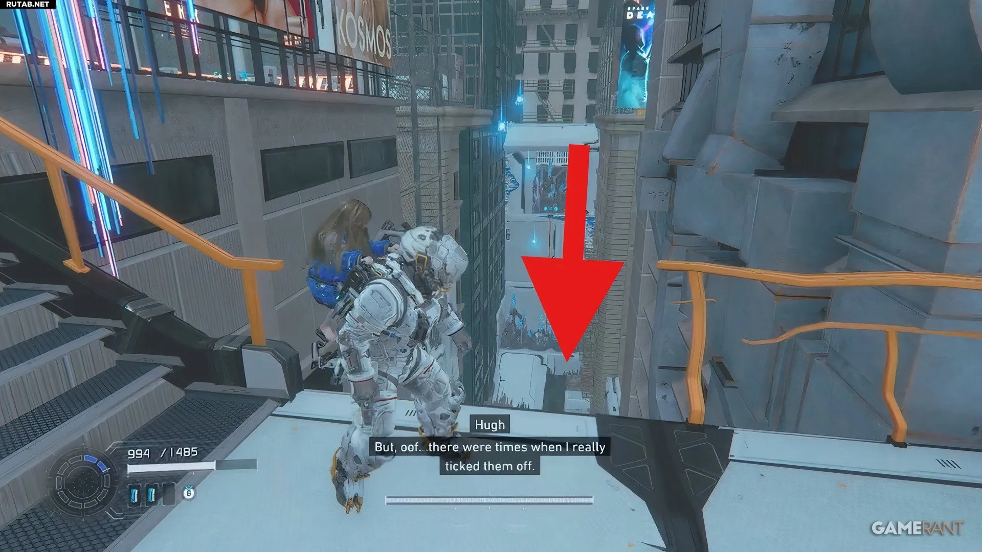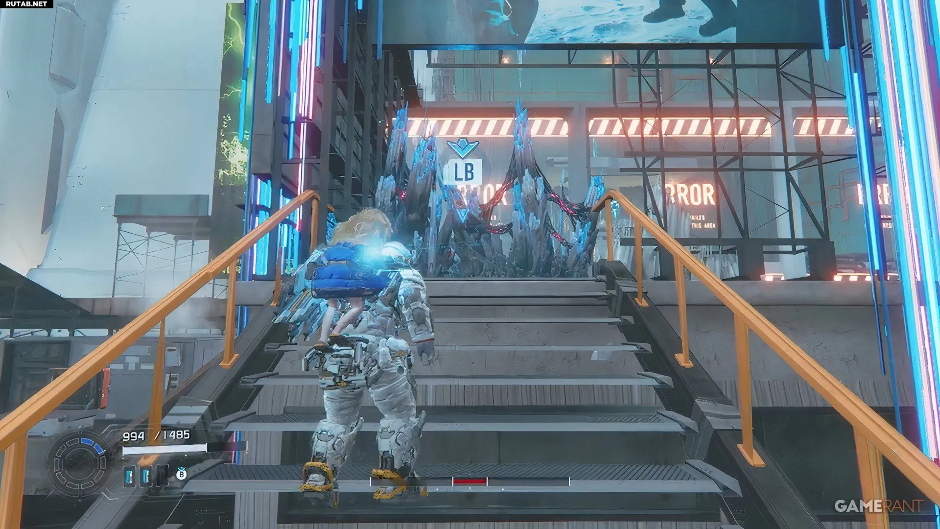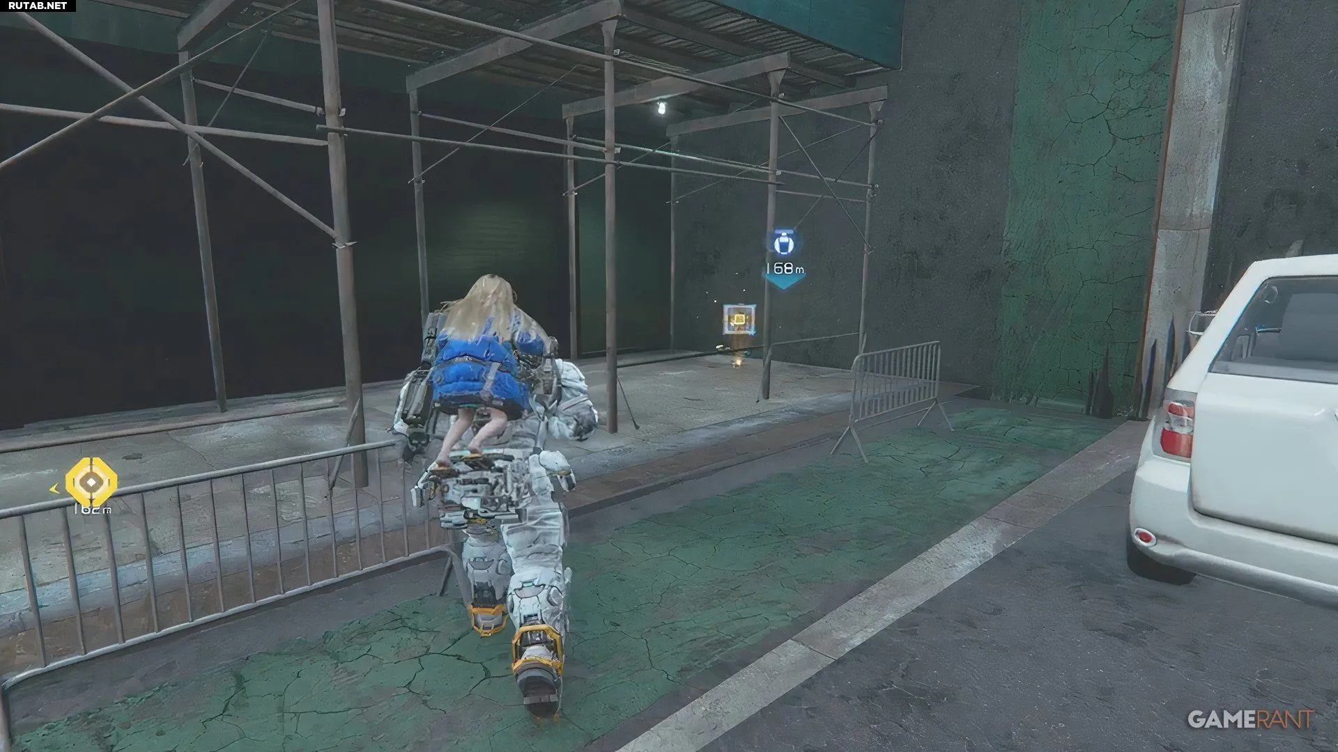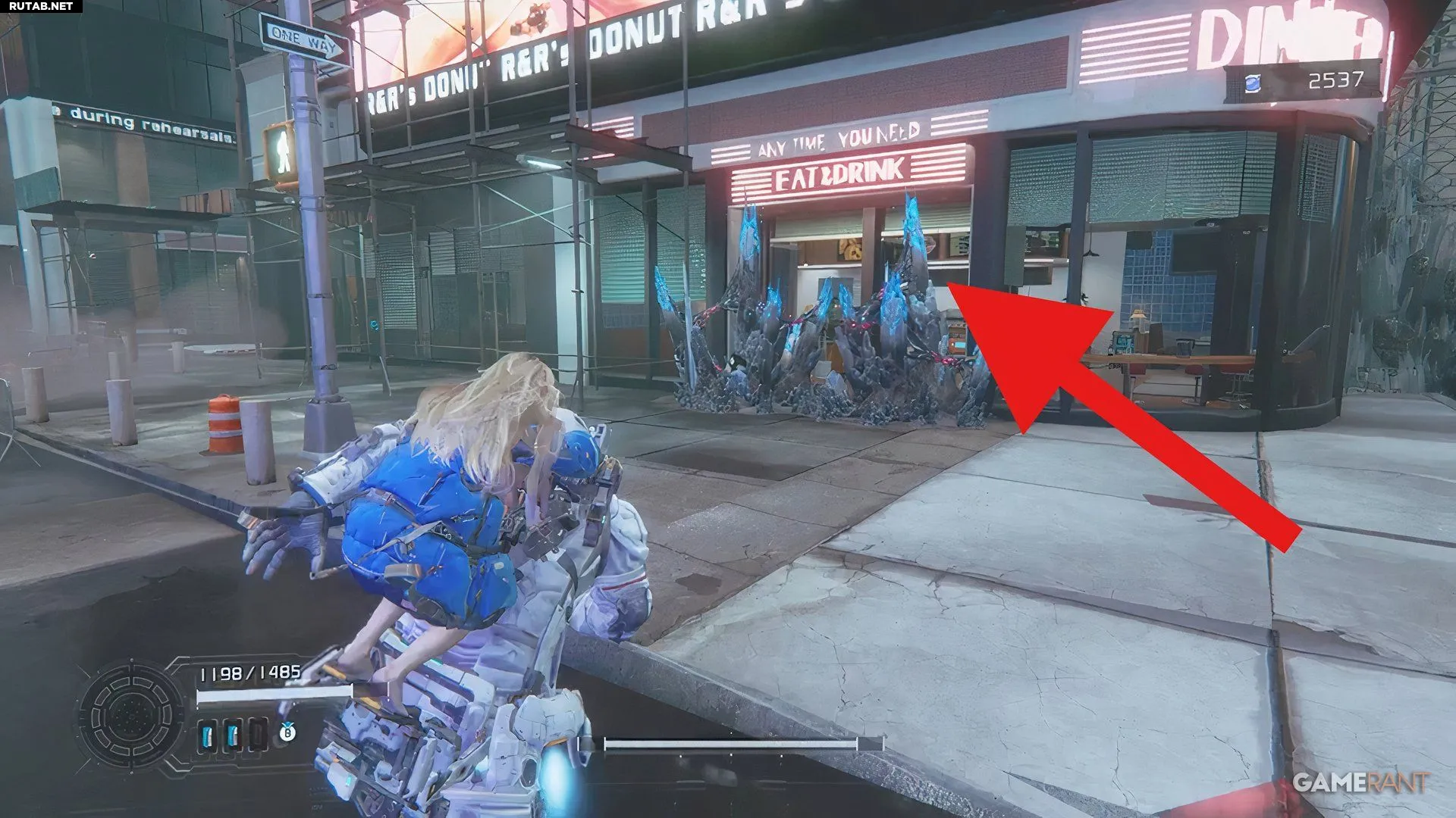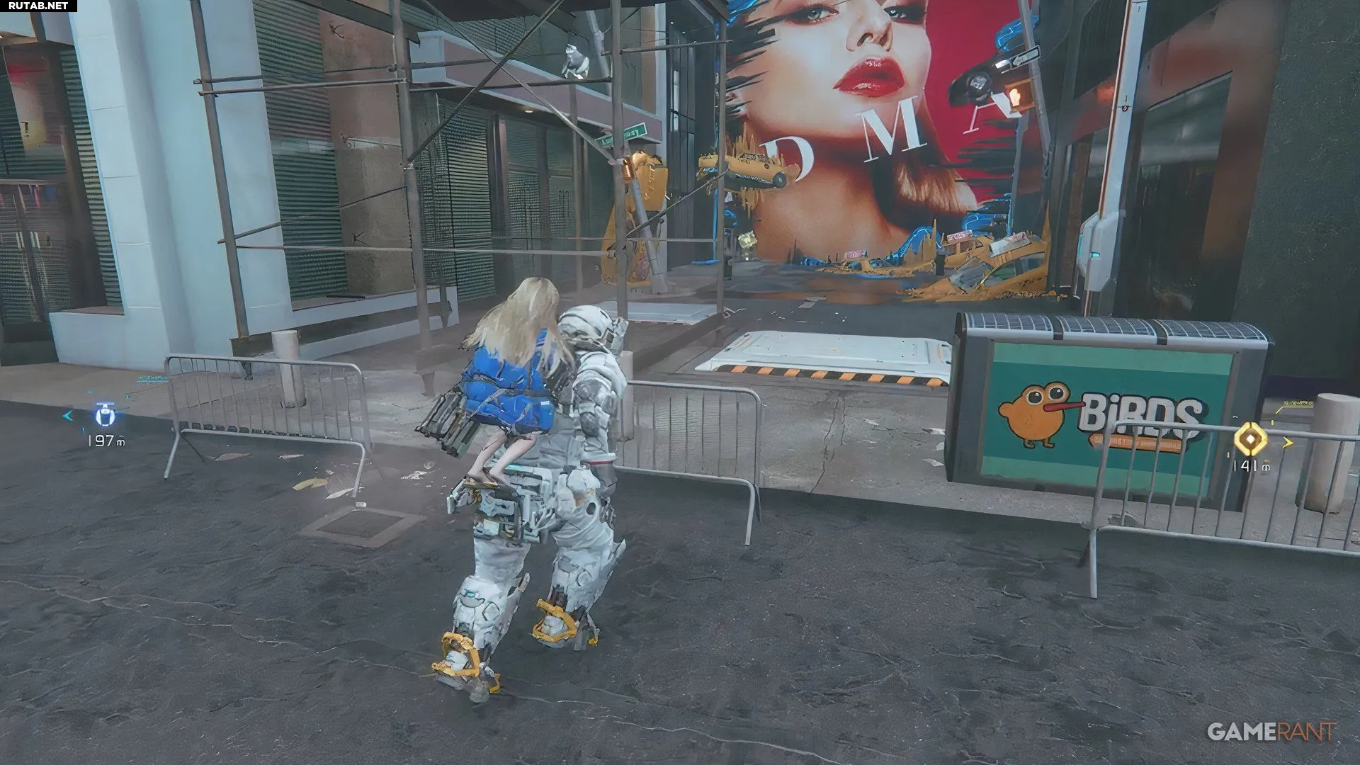 Когда вы попадёте на открытую площадь, напоминающую Таймс-сквер, спрыгните вниз и сразу развернитесь лицом к точке выхода. Компонент для улучшения будет слева под строительными лесами.