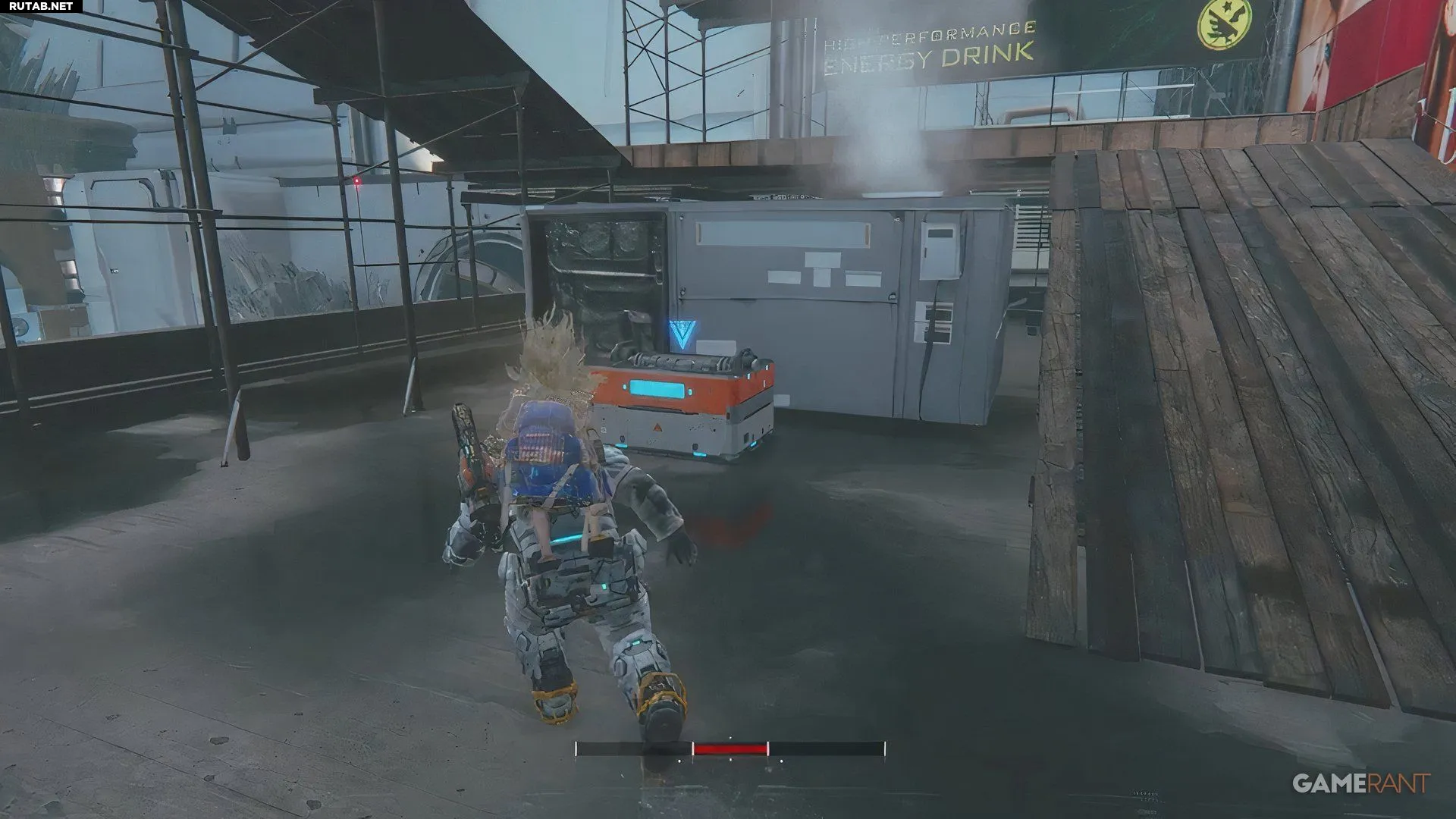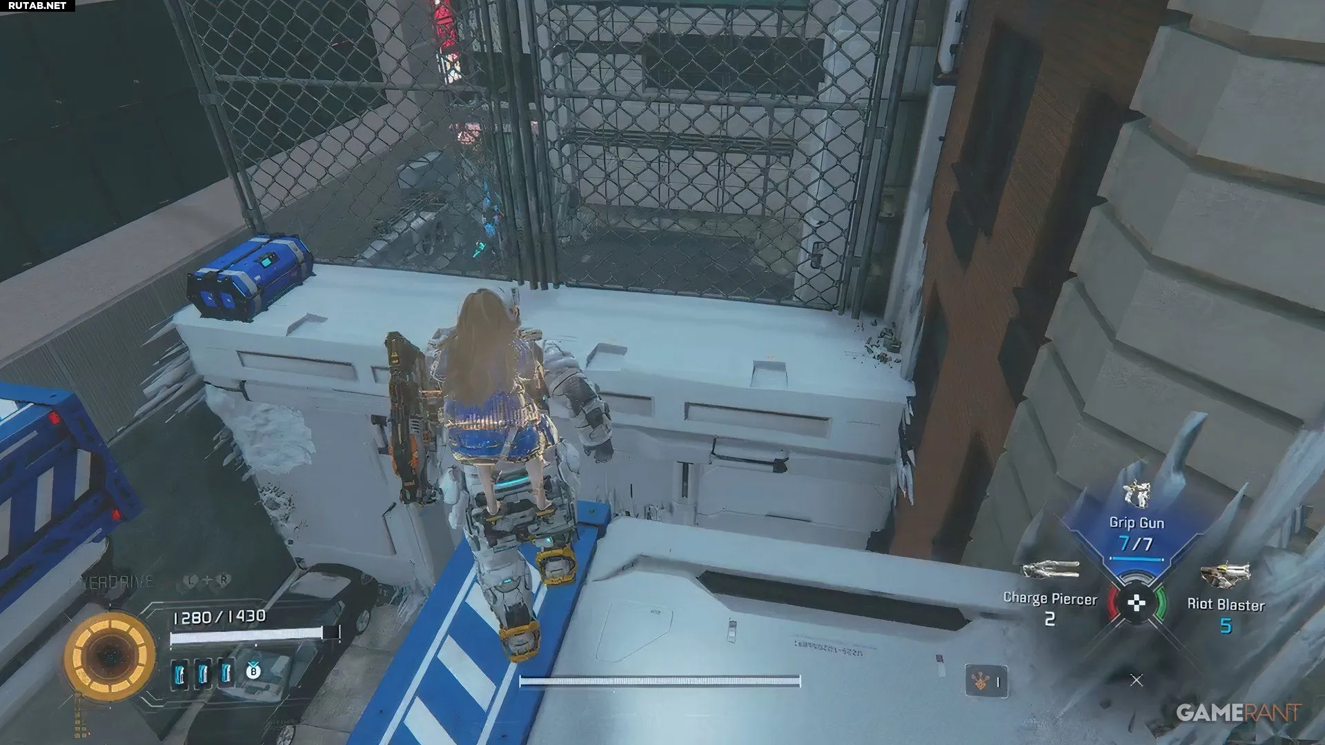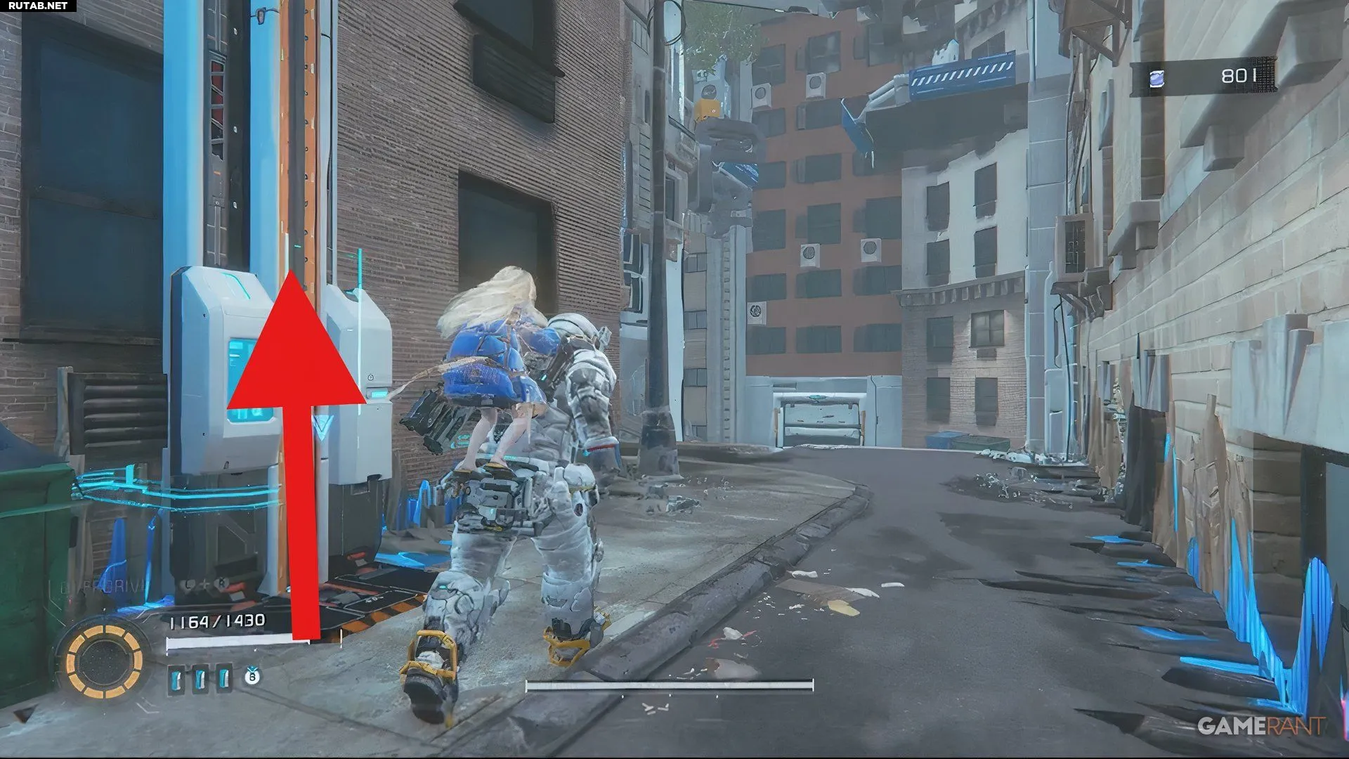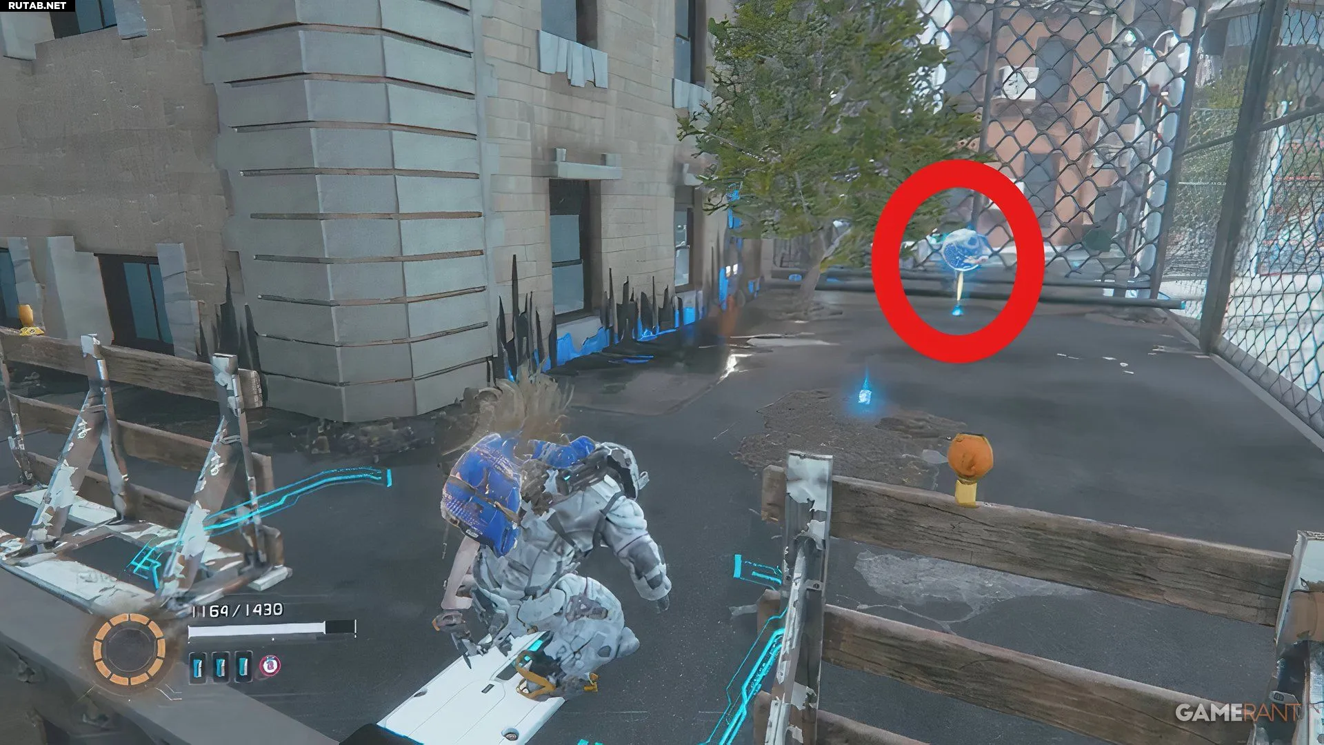 После перехода по мосту в зону Бокового переулка вы спуститесь вниз и затем войдёте в ворота, получив оружие «Зарядный пробойник». Победите нескольких врагов, затем взломайте панель, чтобы поднять платформу. Запрыгните на неё, перепрыгните на пару платформ, и вы увидите синий контейнер рядом с высокой сетчатым забором.