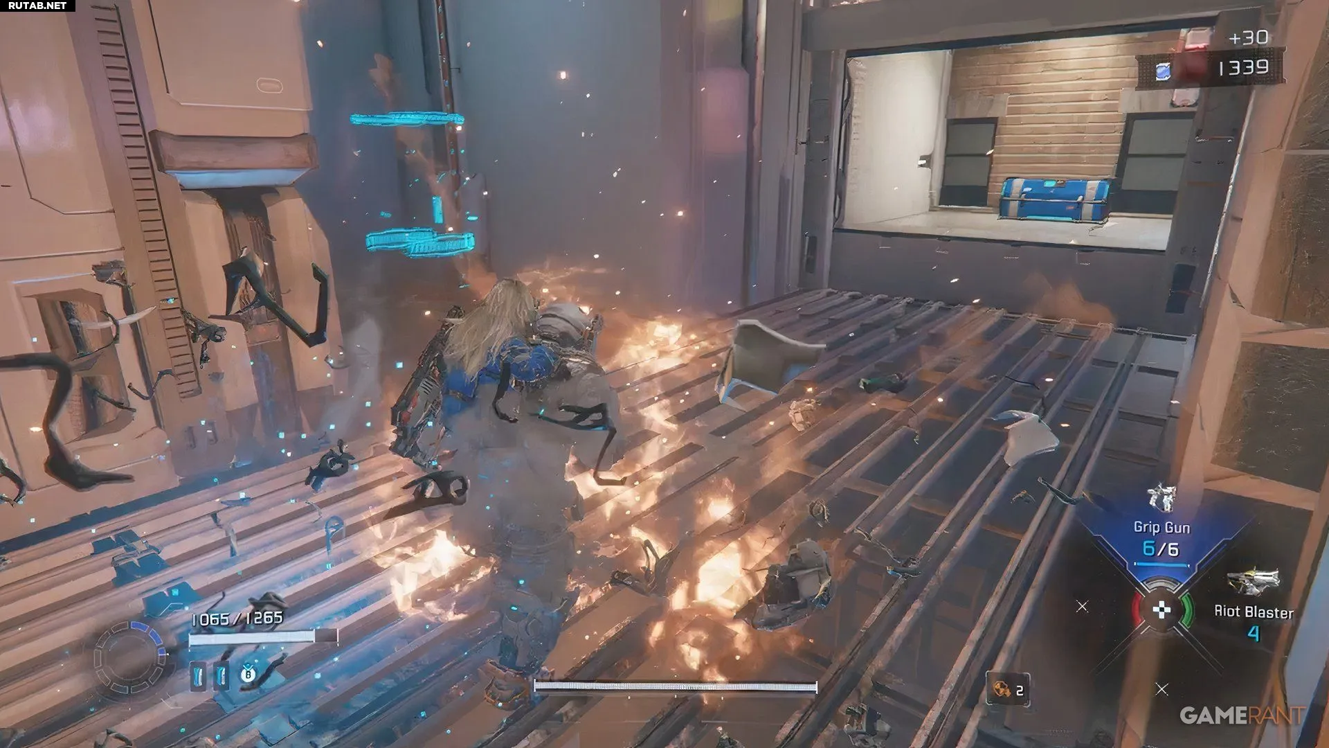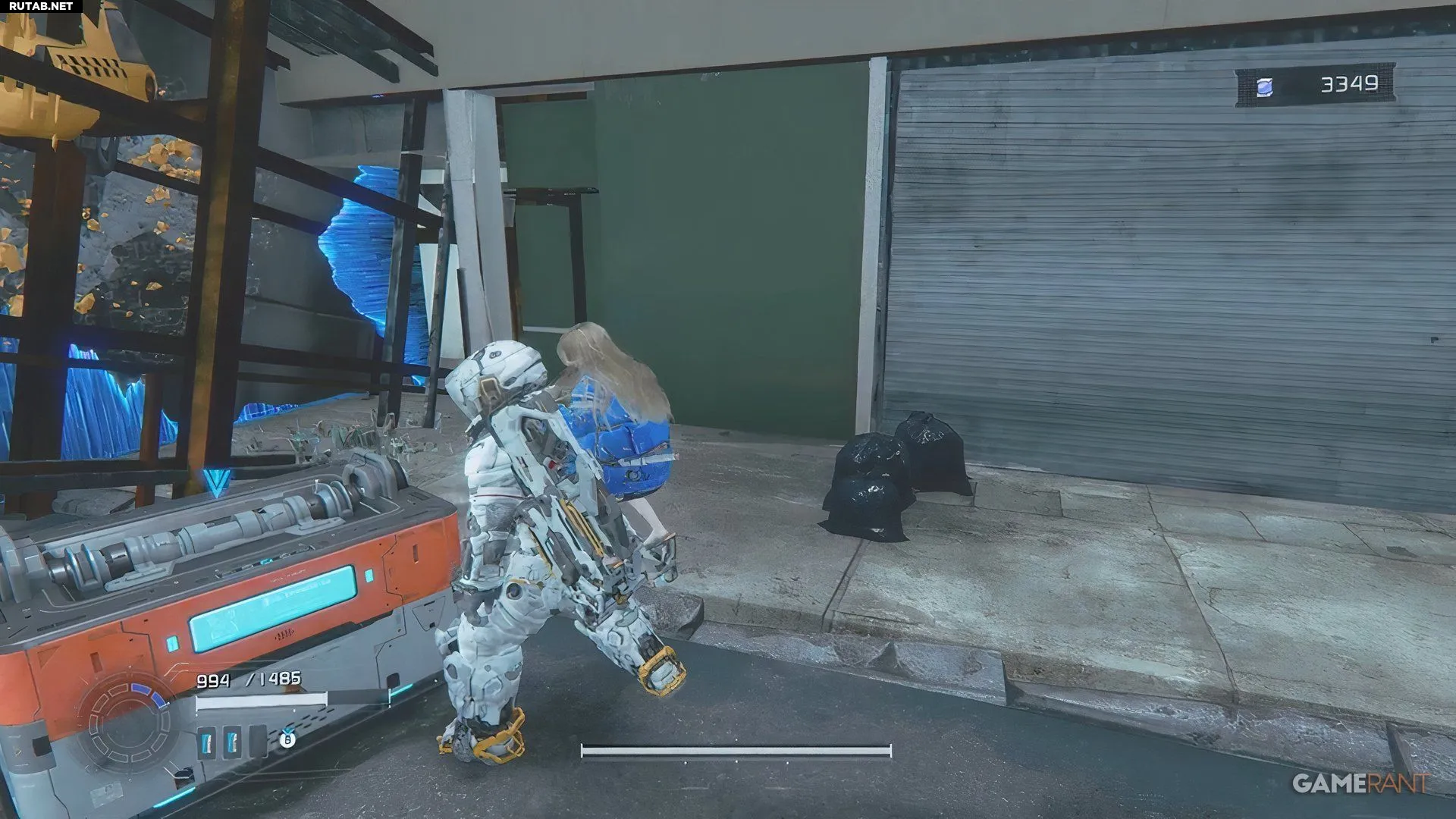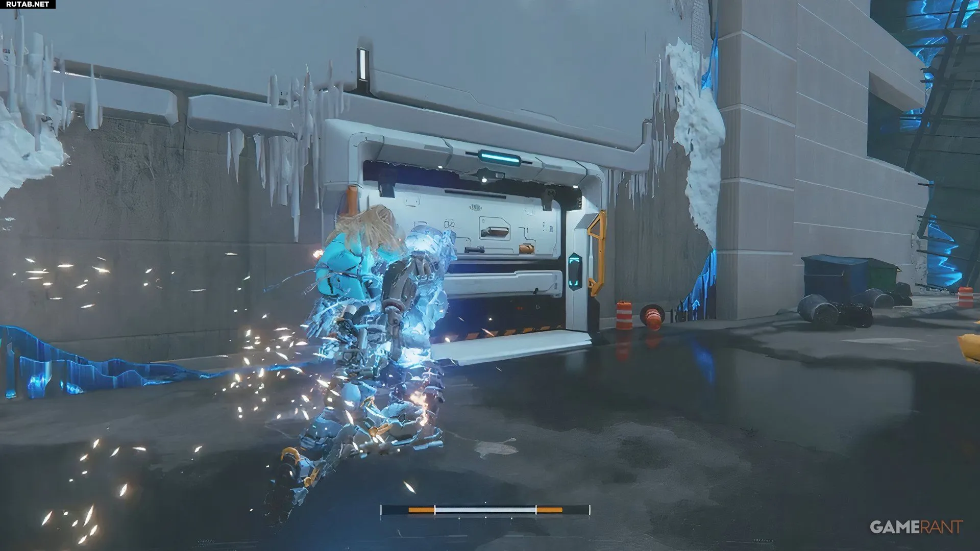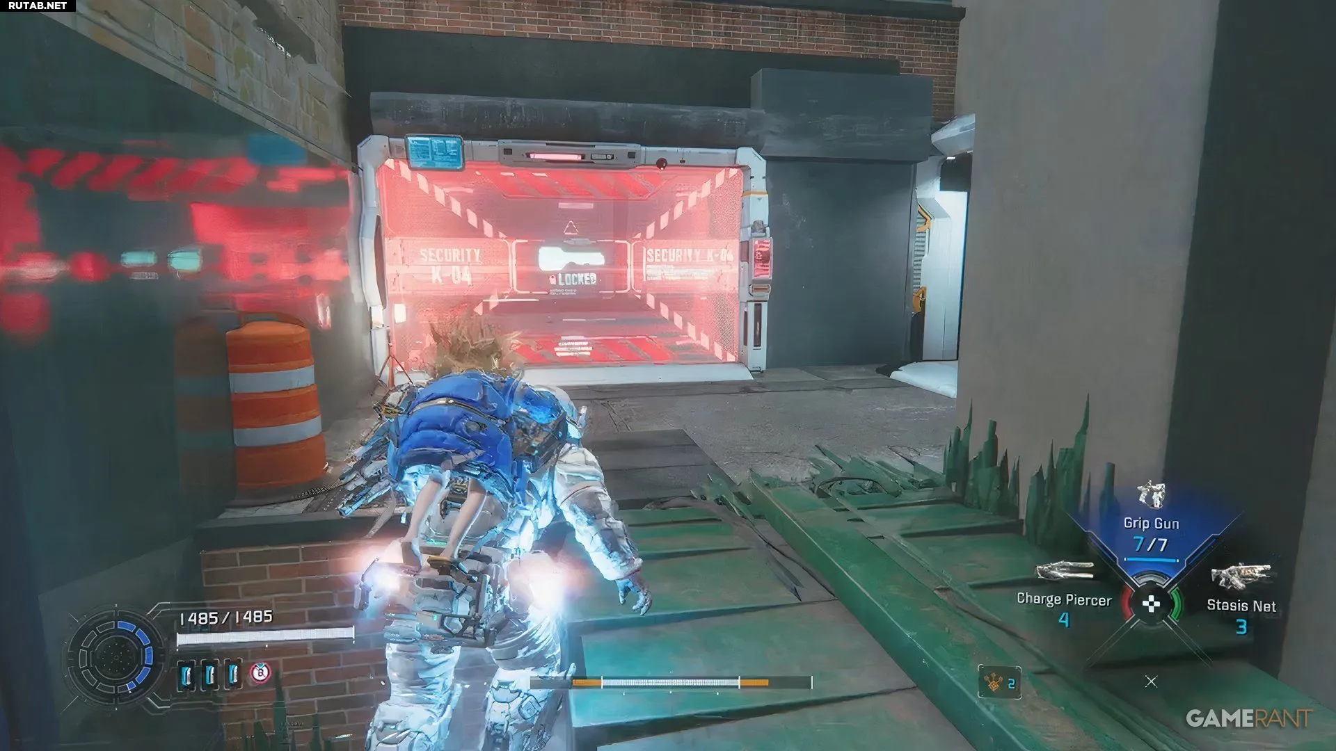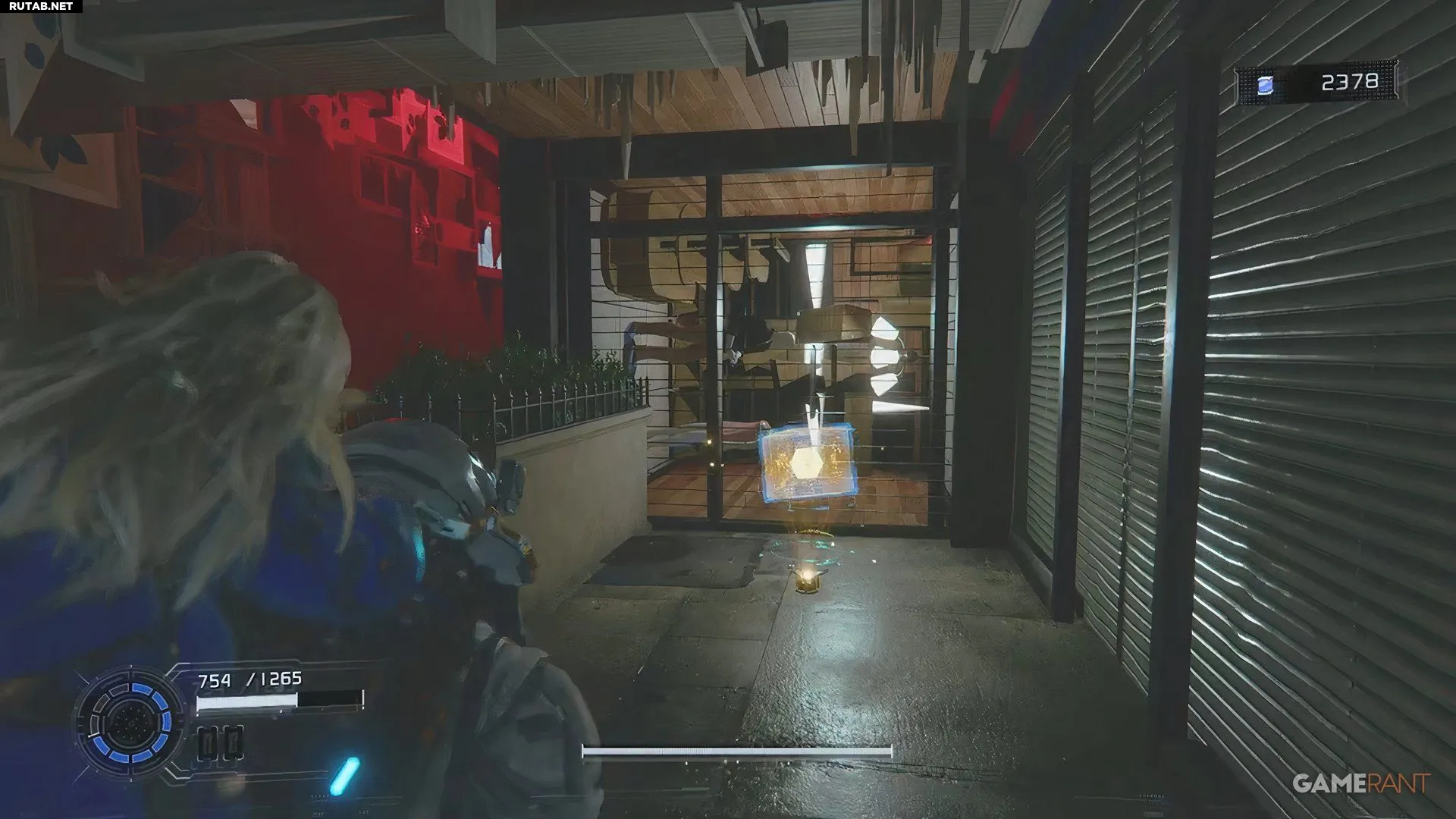 После перехода по мосту в зону Бокового переулка вы спуститесь вниз и затем войдёте в ворота, получив оружие «Зарядный пробойник». Победите нескольких врагов, затем взломайте панель, чтобы поднять платформу. Запрыгните на неё, перепрыгните на пару платформ, и вы увидите синий контейнер рядом с высокой сетчатым забором.