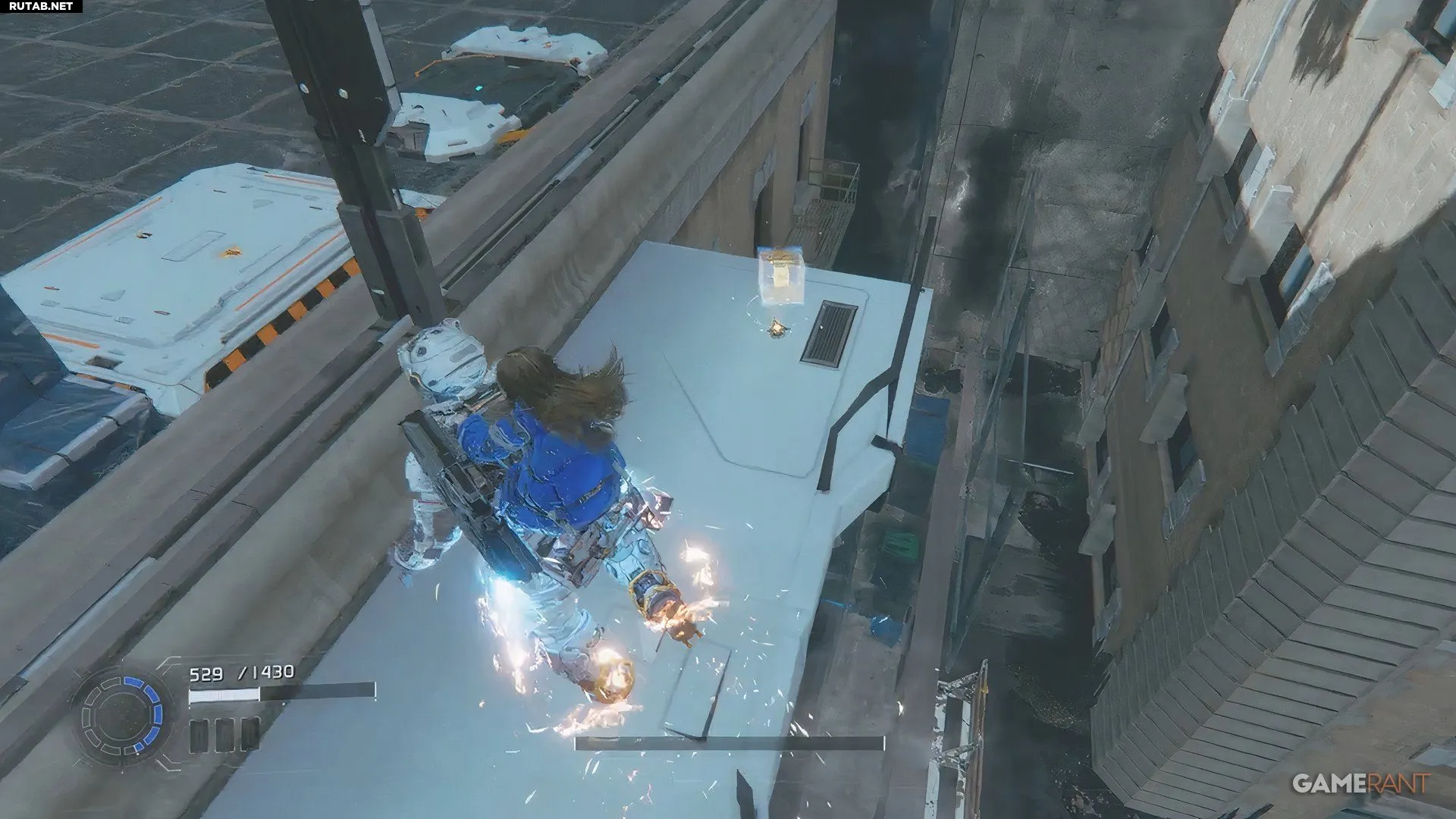 Активировав Маяк на вершине башни в Боковом переулке, спрыгните на соседнюю платформу, ведущую к зиплайну. Прежде чем подниматься, посмотрите направо, чтобы найти компонент для улучшения.