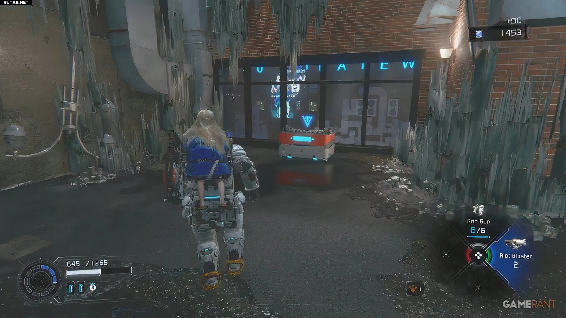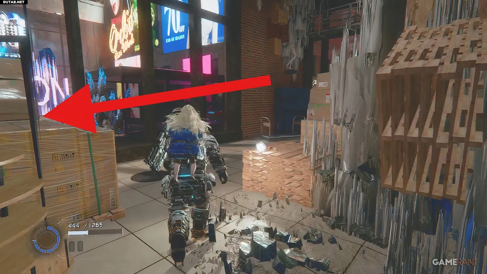 Если вы войдёте в Торговый район через его выход на первом этаже (со стороны Входа на Испытательный Полигон), вы быстро найдёте ворота в Красную зону. Используйте красный ключ от ворот, победите волну роботов внутри и получите сундук с чистым лунумом.