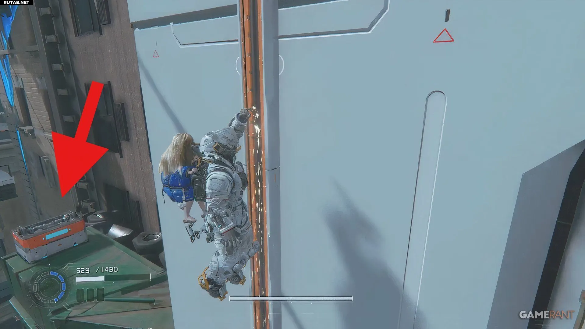 Как только вы заберёте первый сейф, вы окажетесь снаружи на уступе. Поверните налево, чтобы найти компонент для улучшения на нижней платформе, на которую можно спрыгнуть.