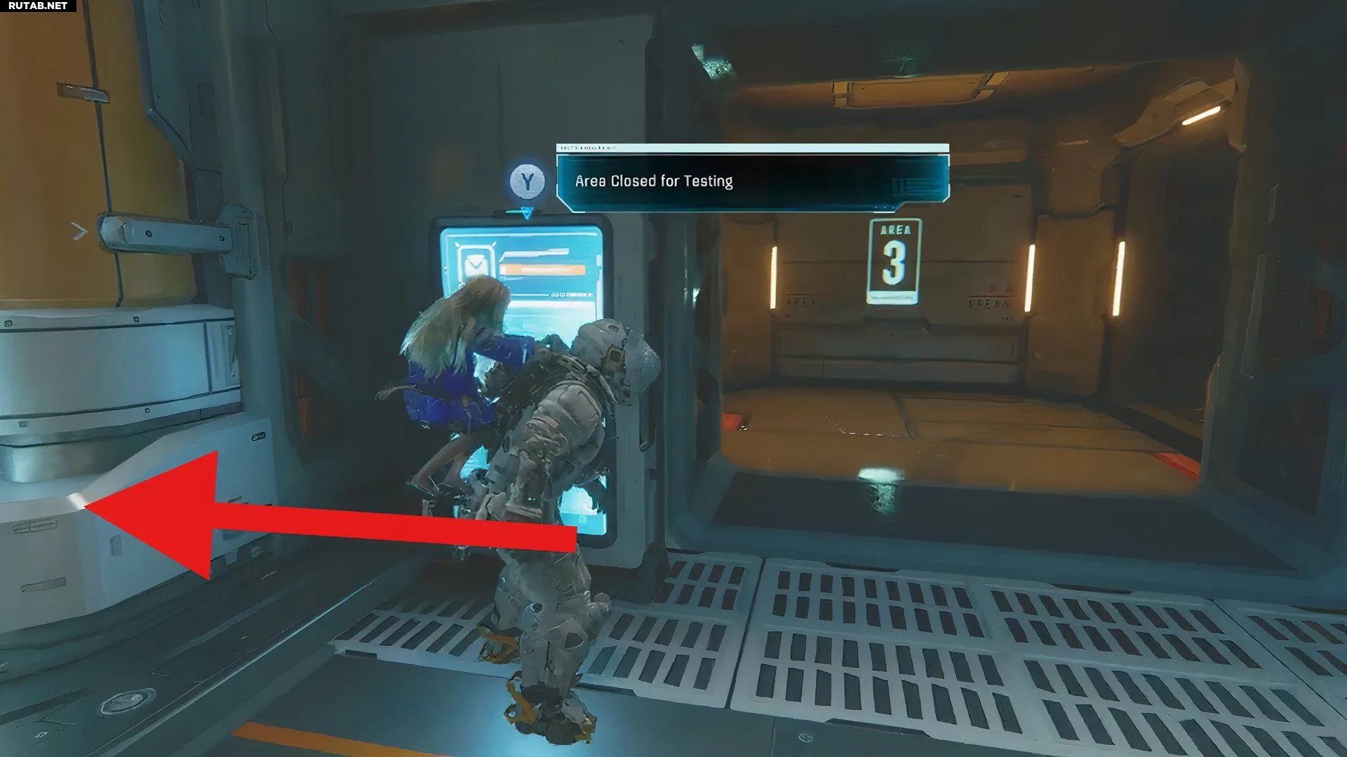 Проходя по коридору после вывески «Зона закрыта для испытаний», вы увидите дверной проём в правой стене. За ним находятся документ и компонент для улучшения.