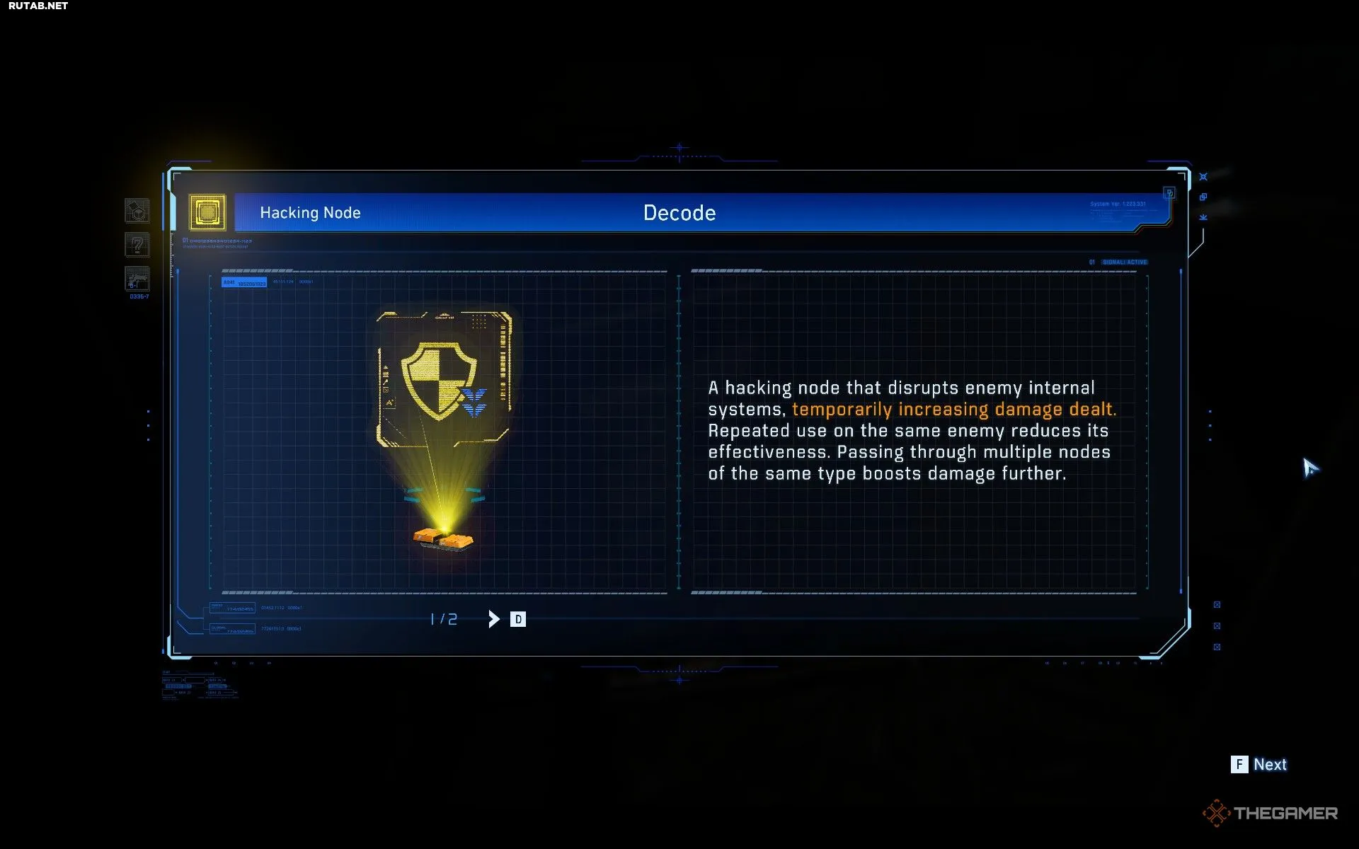 - Жёлтые узлы более специфичны, так как представляют собой взломы с экрана вашего снаряжения, которые вы решили взять в сектор. Они могут наносить дополнительный урон или распространять этот урон на нескольких врагов при взломе одного, поэтому их стоит по возможности экипировать.