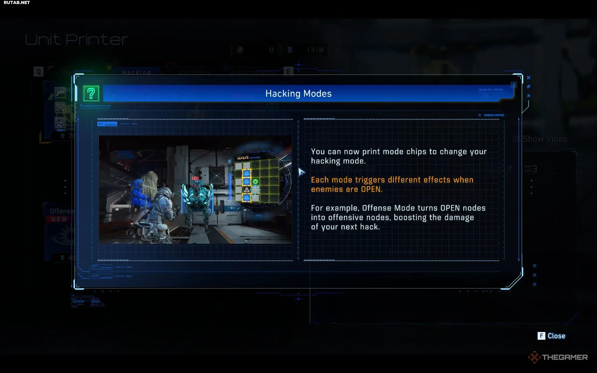 Интерфейс 3D-принтера разделён на несколько категорий: в разделе «Оружие» печатаются найденные вами образцы огнестрельного оружия, «Взлом» позволяет добавлять различные хаки для Дианы, которые она использует в бою на своей сетке взлома, «Способности» дают Хью впечатляющие физические улучшения, а «Модули» повышают эффективность других способностей или расширяют слоты экипировки для исследований.