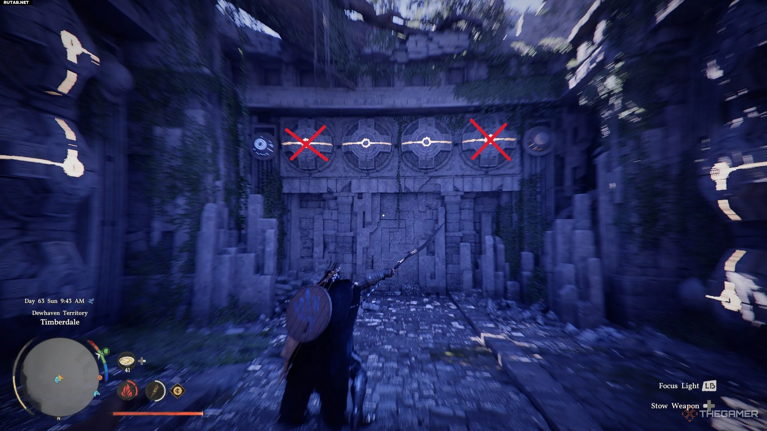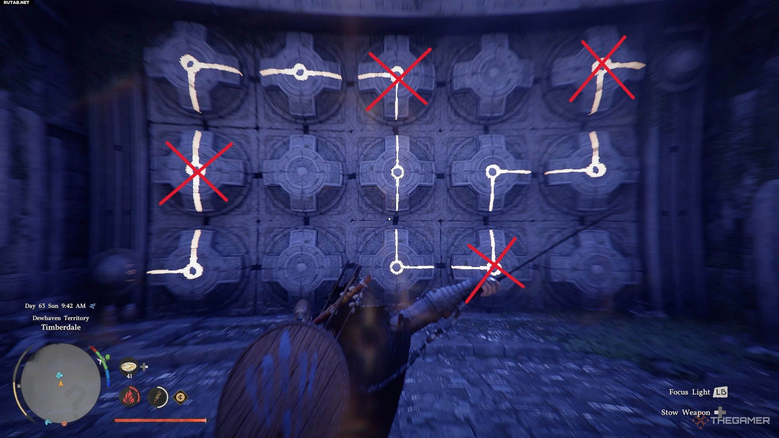 Если вы ошиблись, в самой головоломке нет механизма сброса. Рекомендуем сначала активировать Врата Бездны прямо к югу от руин, за рекой. В случае ошибки вы сможете быстро переместиться к этим Вратам — это сбросит головоломку и позволит начать заново, а не тыкать кнопки наугад.