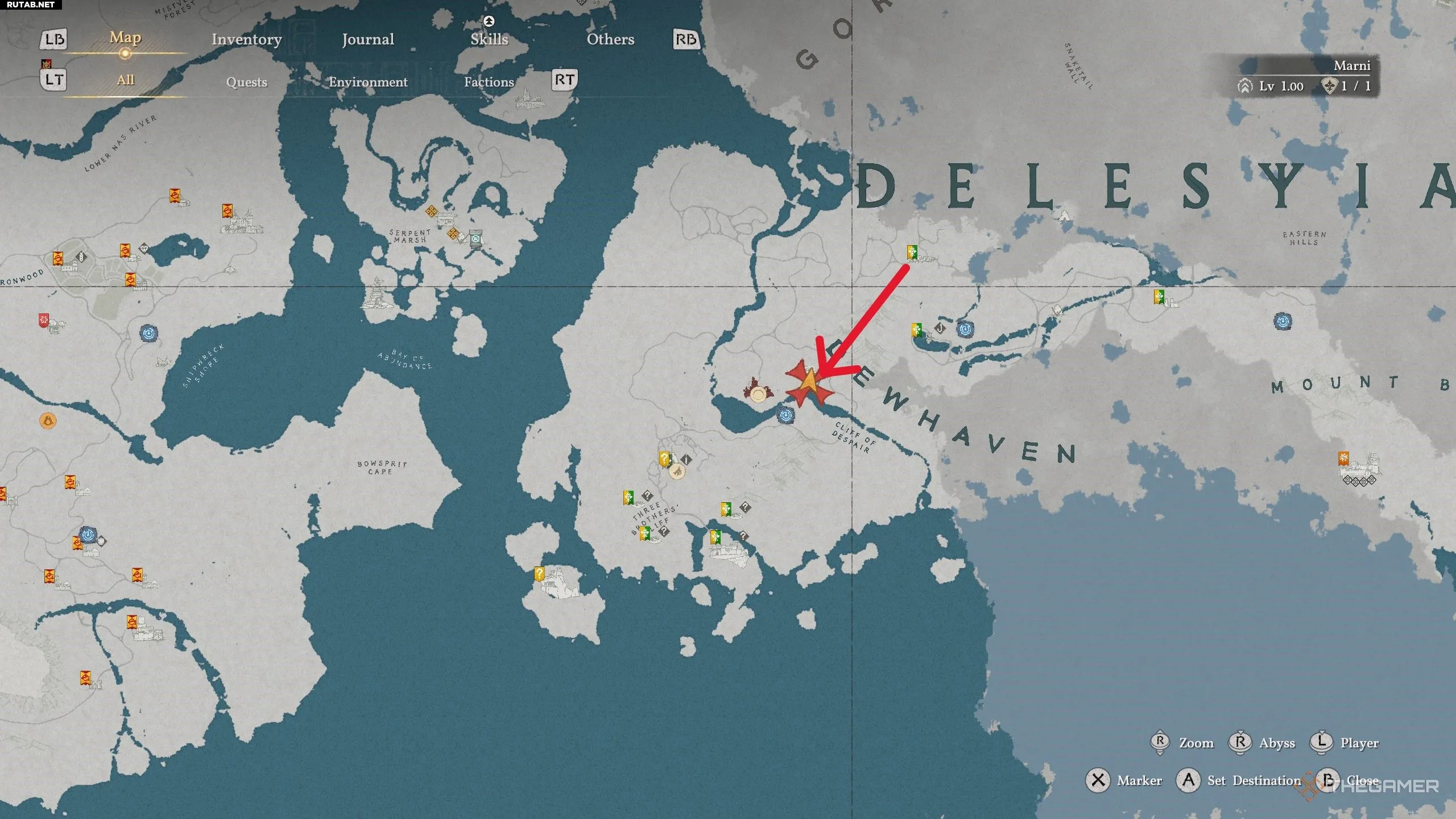 Чтобы найти Древние руины Тимбердейла, отправляйтесь в регион Делесия на юго-востоке карты. Точное расположение — западная часть региона, к югу от поселения Дьюхейвен (буква «D» на карте).