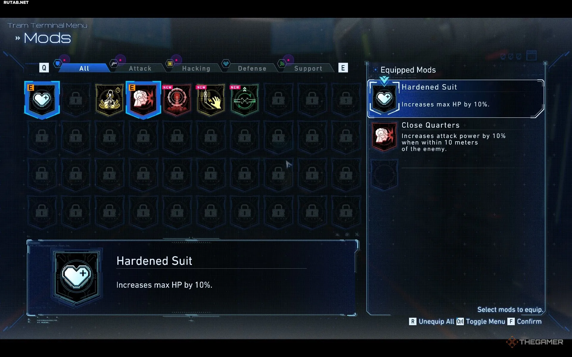 Следующий раздел главного экрана снаряжения, расположенный между оружием/узлами взлома и кнопкой подтверждения посадки на трамвай, предназначен для установки модулей, дающих Хью различные статические бонусы. Существует четыре типа модулей: Атака, Взлом, Защита и Поддержка. Взвесьте, какие бонусы вам пригодятся в предстоящей области. Доступны десятки модулей, так что экспериментируйте с комбинациями, чтобы найти наиболее эффективные для вашего стиля игры.