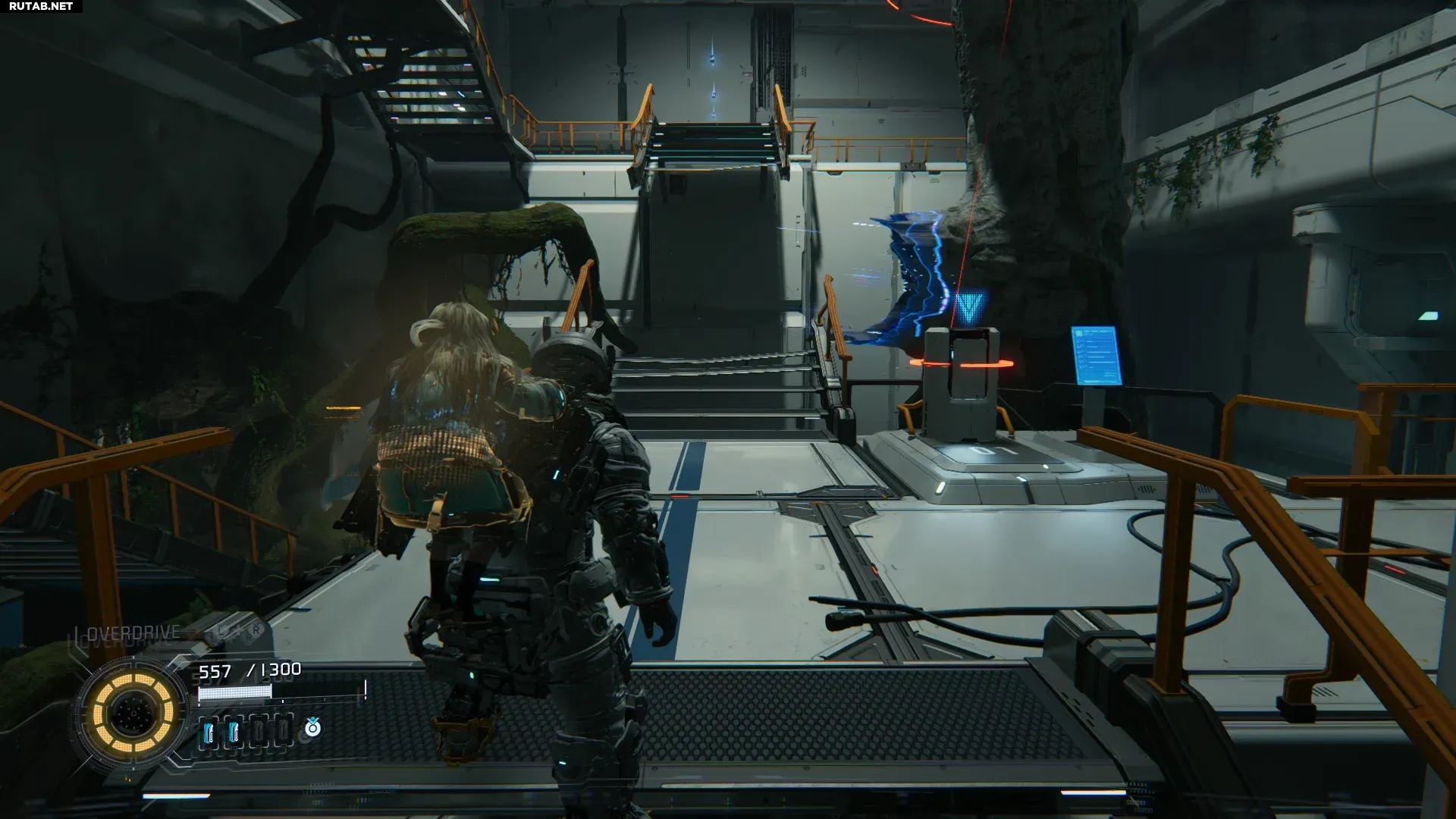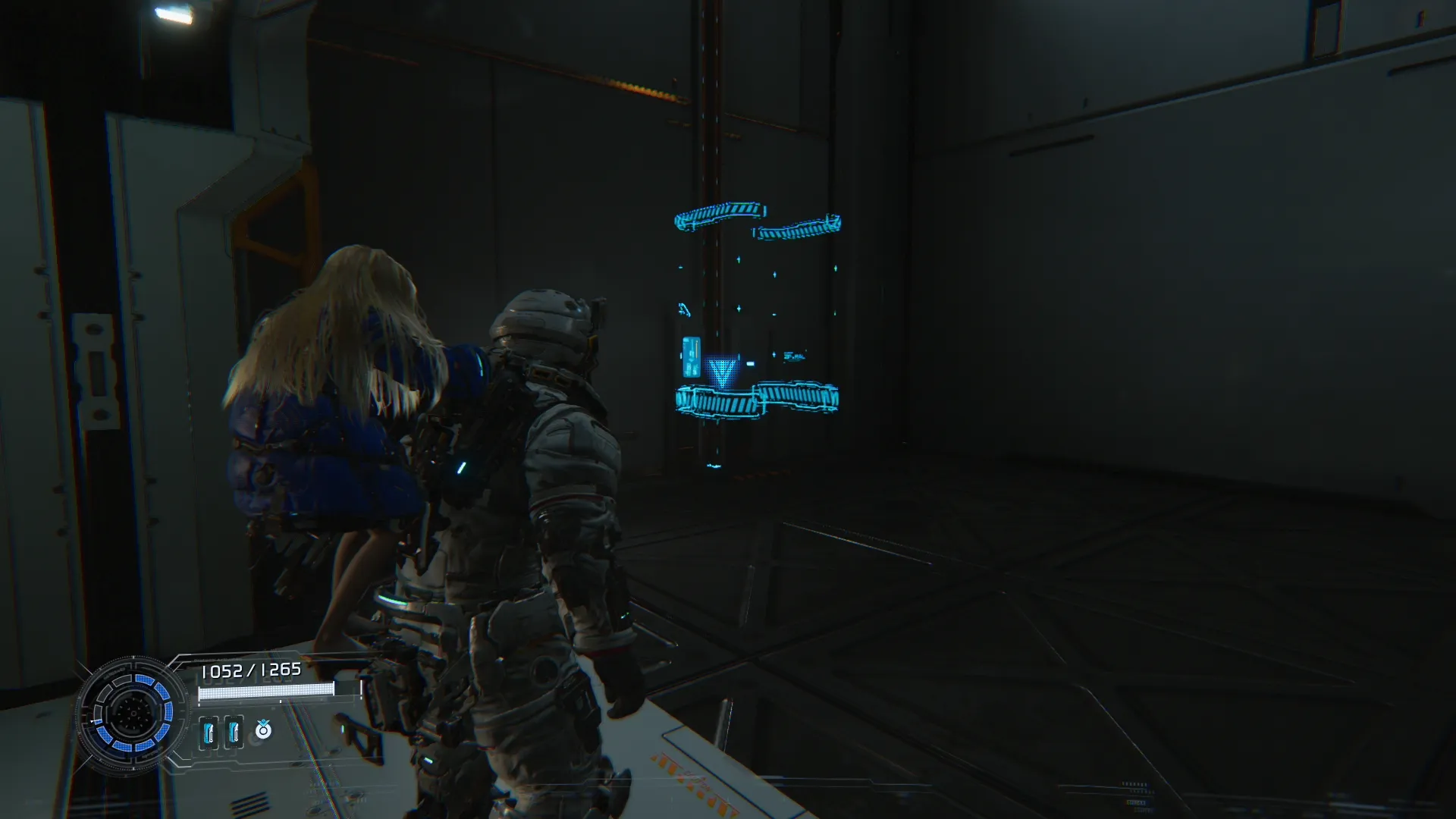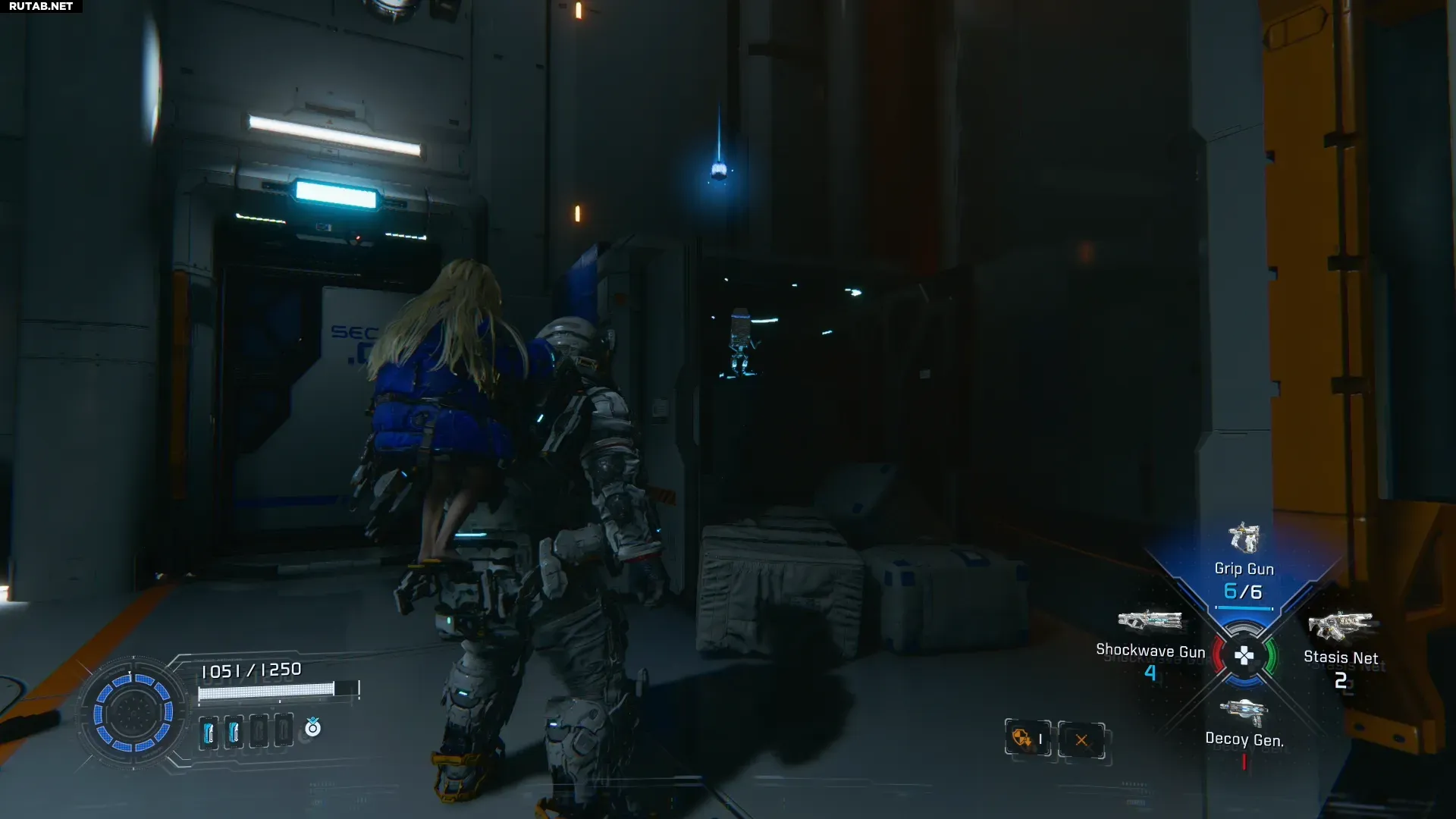 Прежде чем подняться на гигантском лифте к первому боссу, воспользуйтесь настенным подъёмником напротив, который ведёт к вертикальной шахте с голо-стеной наверху. Не проходите сквозь стену, а встаньте напротив и загляните вниз по шахте. Мини-Кабина будет стоять на вентиляционной решётке примерно на середине высоты.