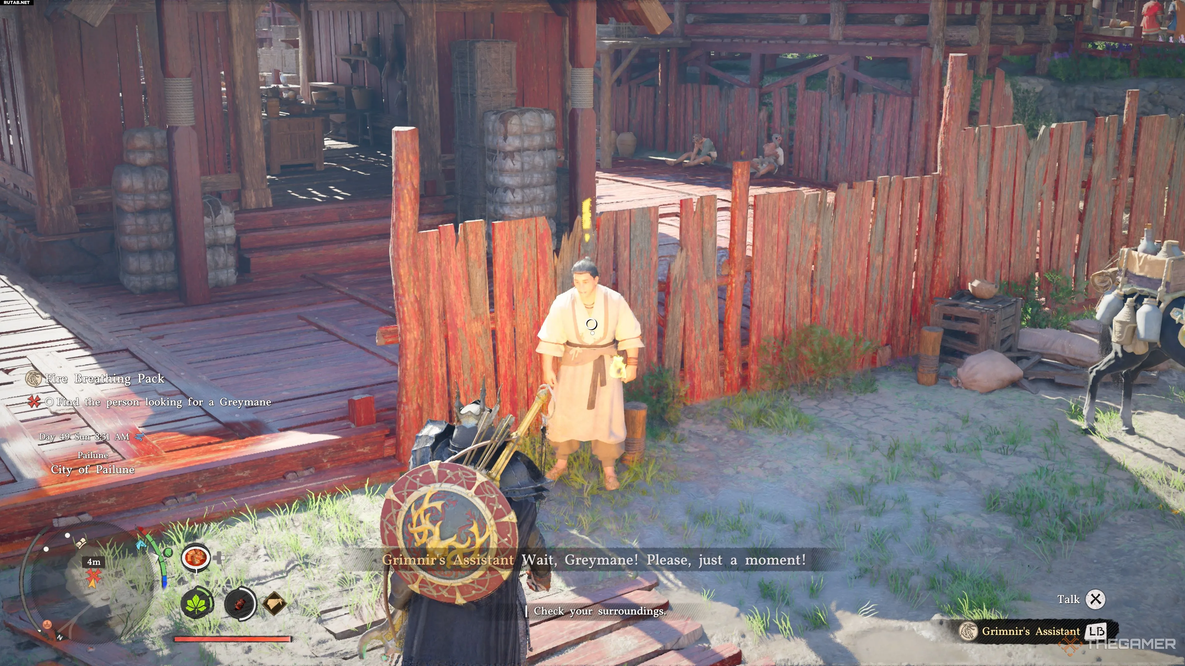 Отправляйтесь на южную окраину города, где будет отмечена область. Найдите Помощника Гримнира, которого в задании «Огненный ранец» называют «человеком, ищущим Серогривую».