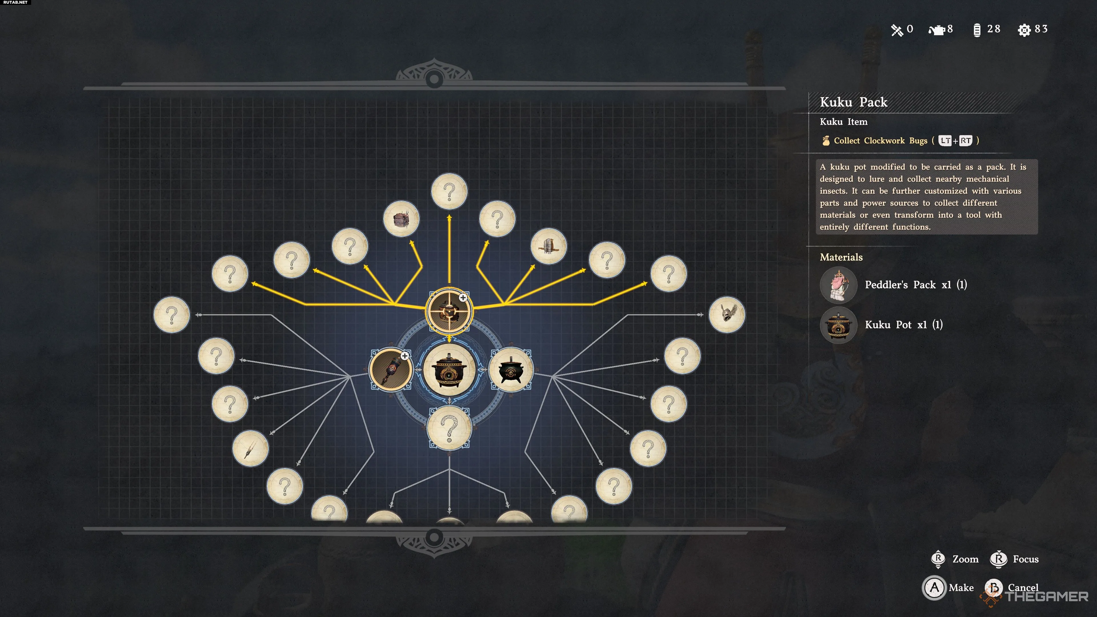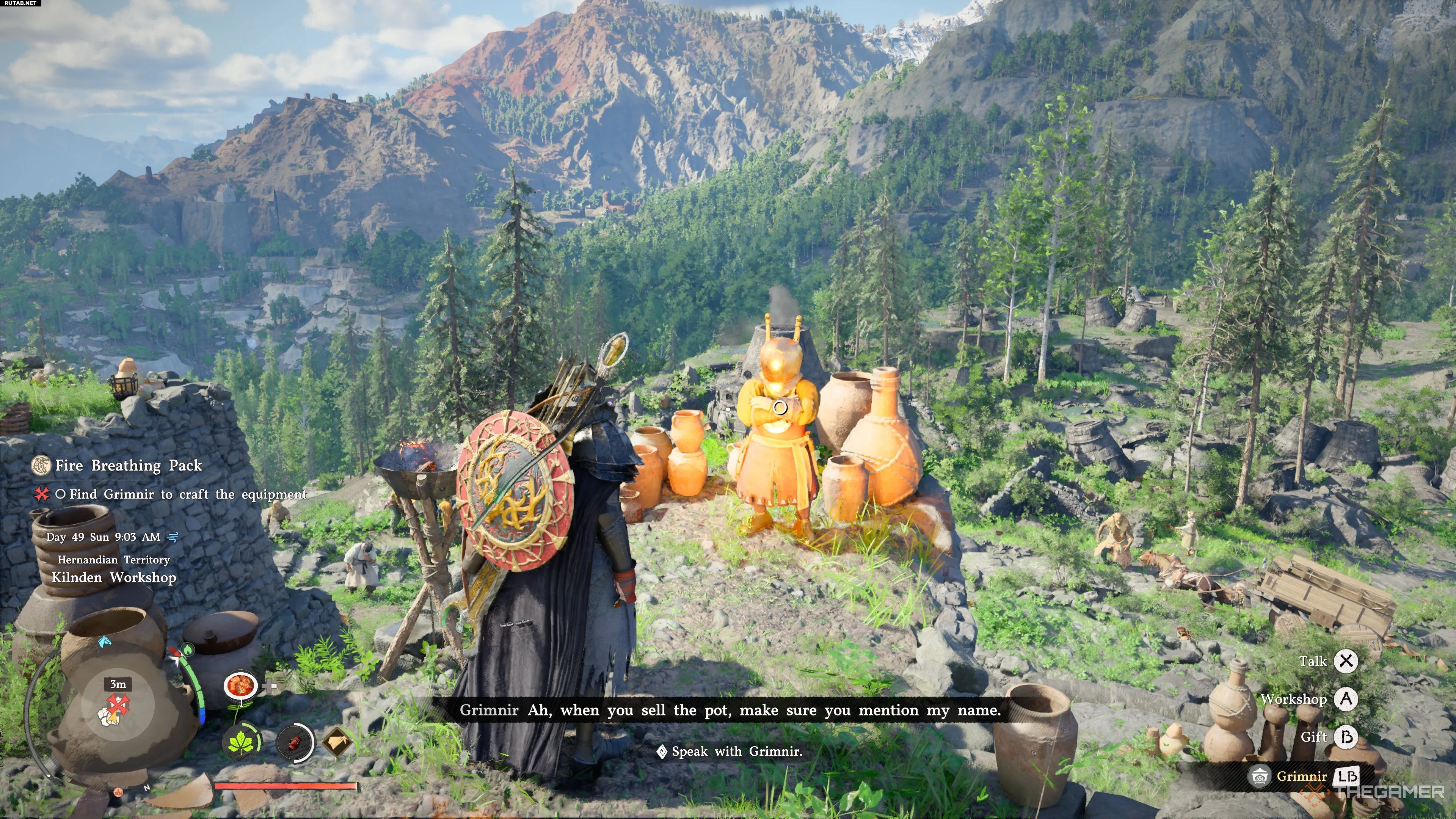 Чтобы изготовить базовую Сумку Желтоклюва, выберите опцию «Мастерская» в диалоге с Гримниром. После создания выйдите из меню и поговорите с ним о Реактивном ранце Желтоклюва.