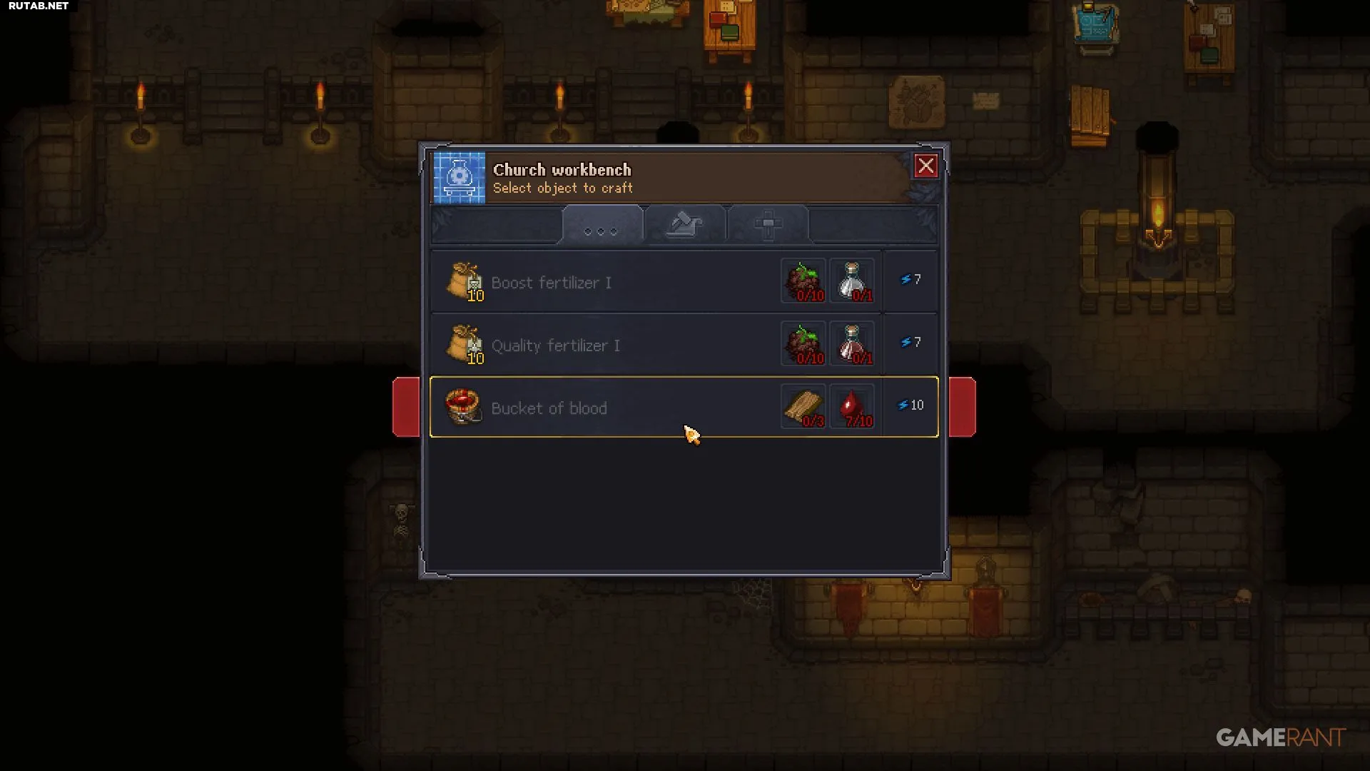 Ведро крови можно скрафтить на церковном верстаке в Алхимической лаборатории под церковью. Для этого понадобятся: