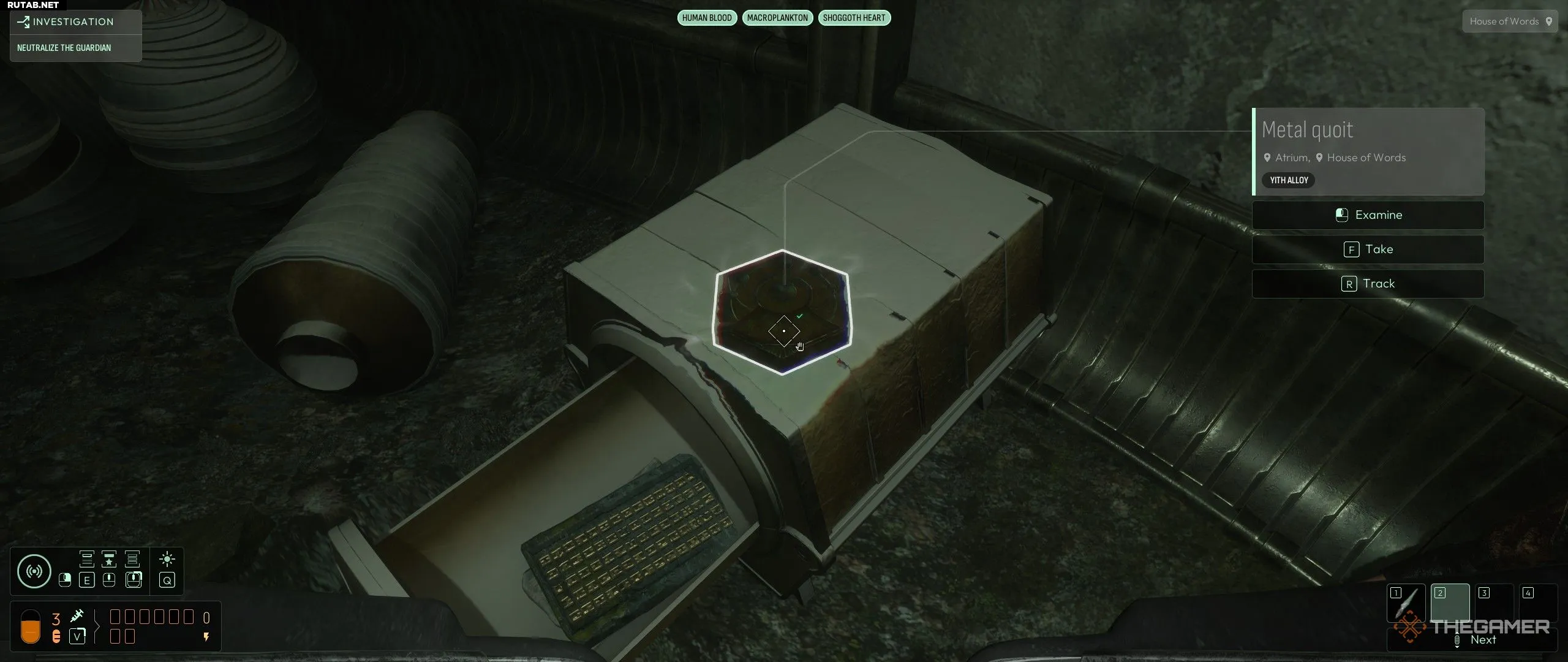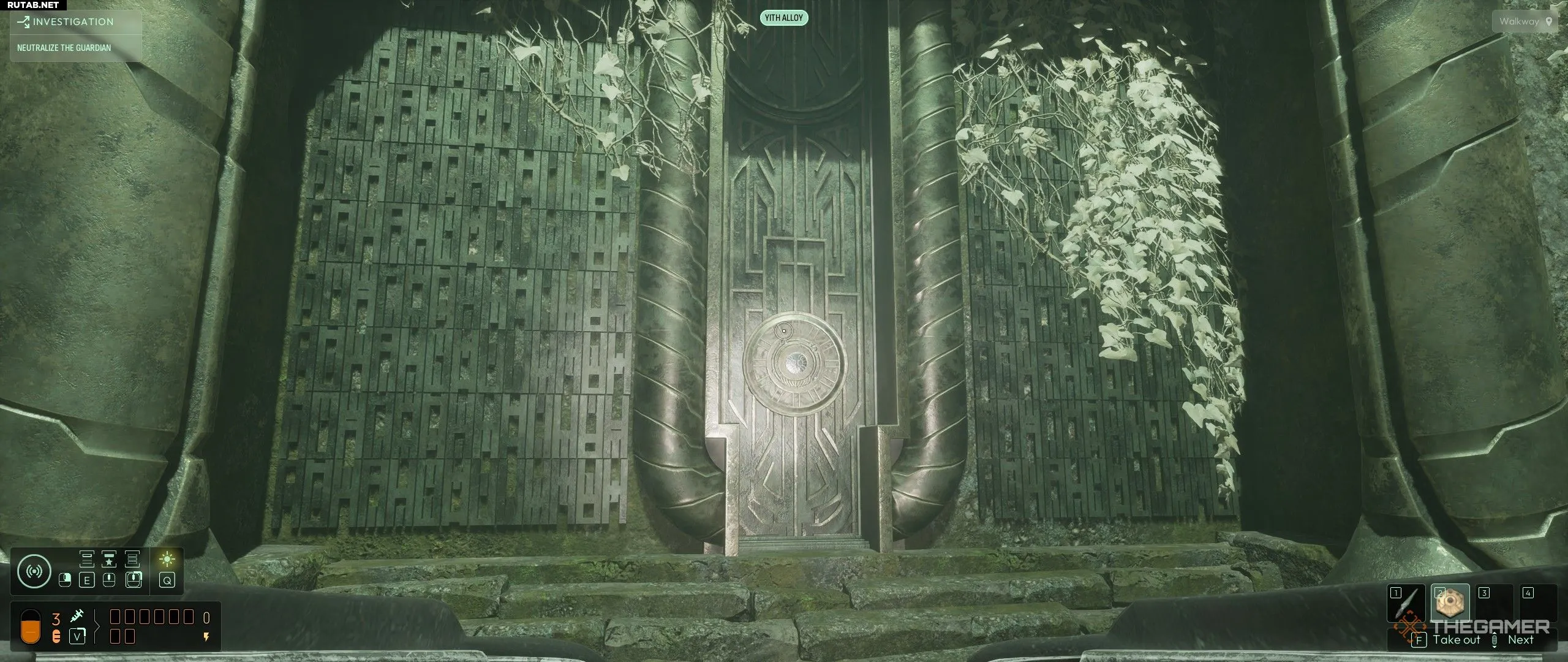 Оказавшись внутри, используйте частоту Йитского сплава, чтобы найти третье металлическое кольцо, спрятанное в комнате. Оно понадобится, чтобы открыть металлический ящик в правой части помещения. Взаимодействие со стелой внутри этого ящика открывает новую дедукцию: «Как определить металл принятия?»