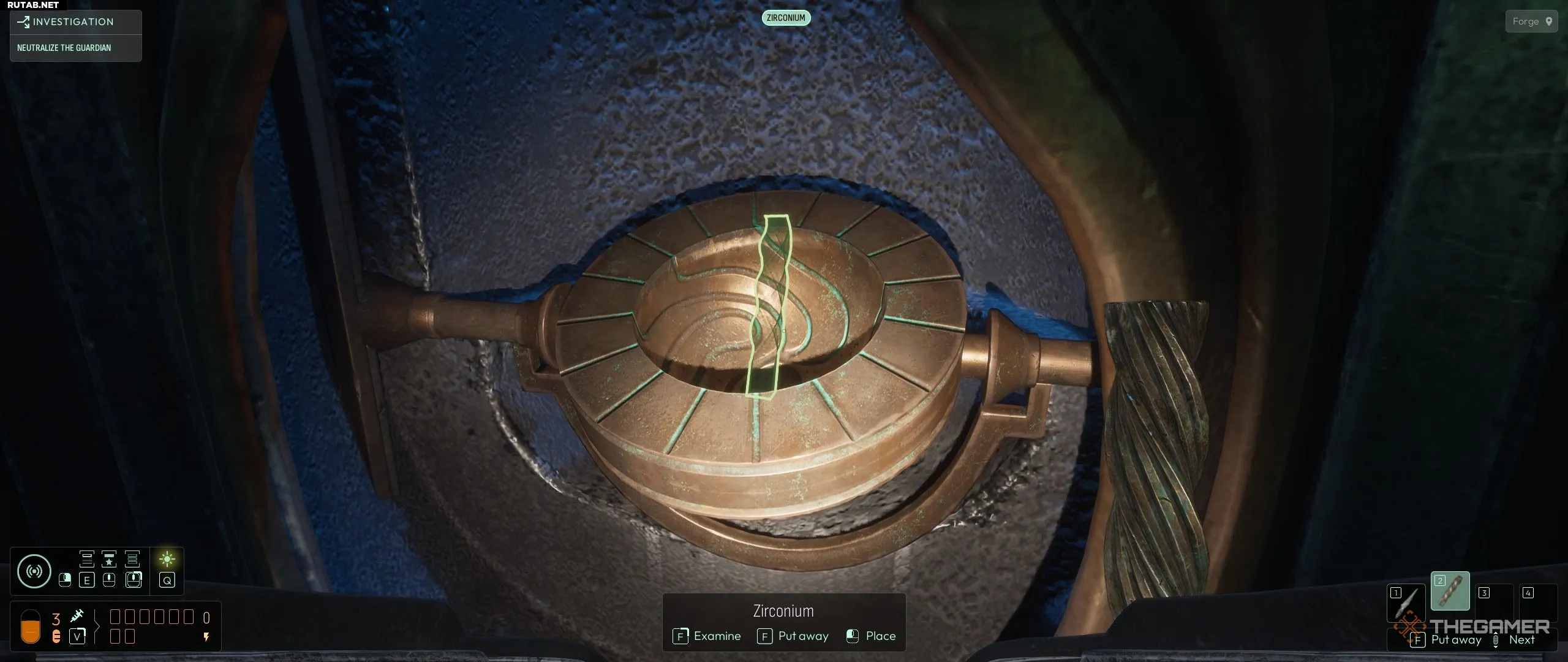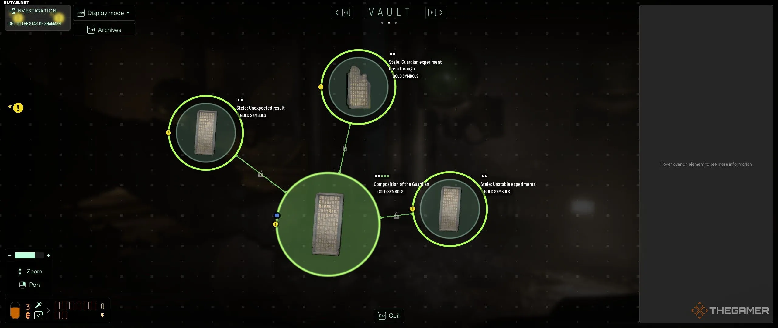 Чтобы её решить, отправляйтесь в Хранилище и свяжите подсказку Плита: Реестр материи с дедукцией. Это откроет, что для гипноза Стража необходим элемент цирконий.