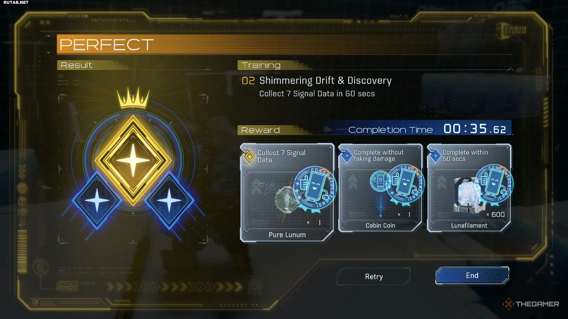 | Win - Collect seven signal data in 60 secs Lose - Out of time. | Collect all signal data - Pure Lunum Take no damage - Cabin Coin Complete in 50 secs - Lunafilament |