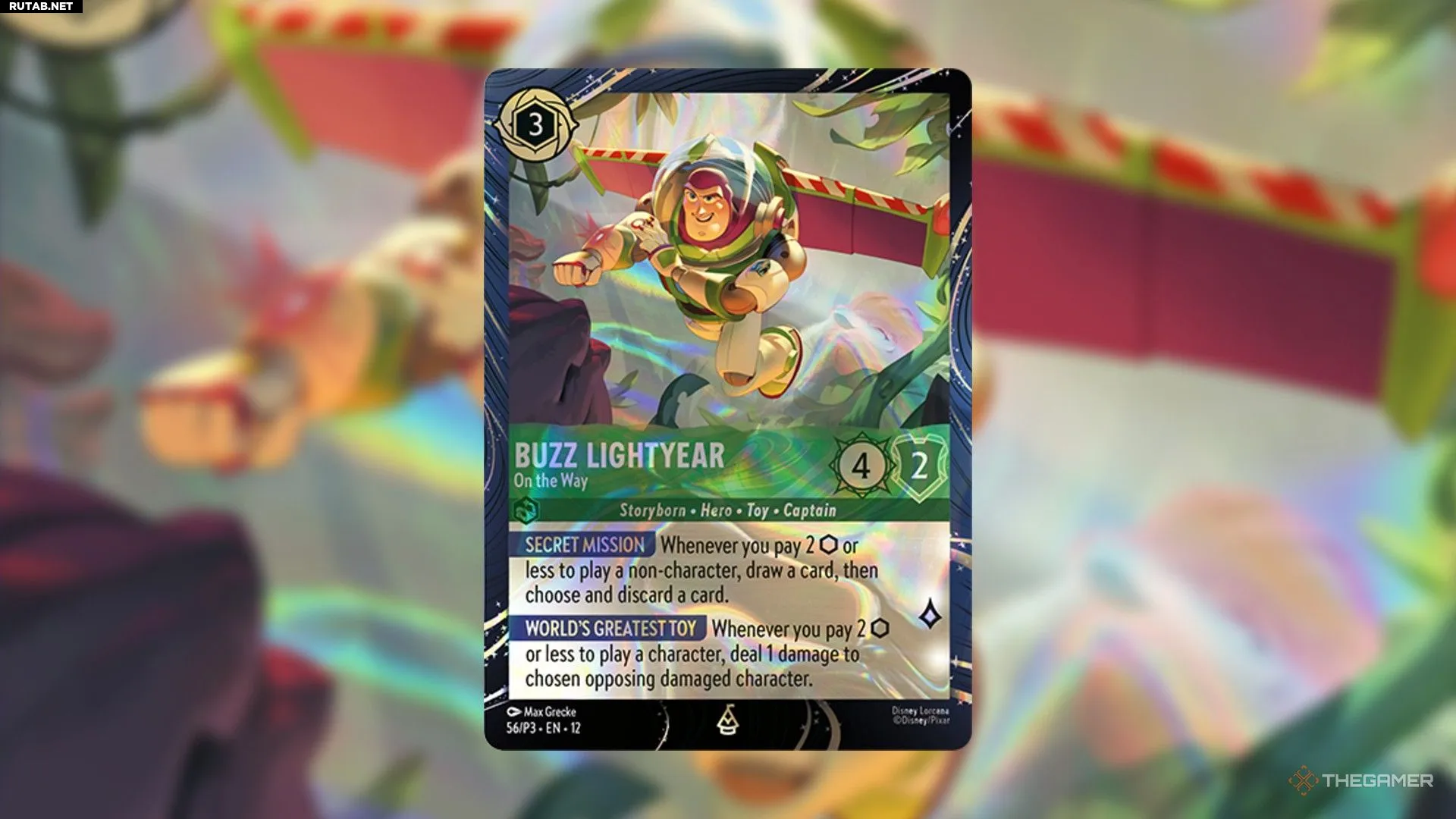 Наконец, у нас есть промокарта «Волшебные места» — Базз Лайтер, На пути. Чтобы заполучить её, вам нужно посетить парк Disney. Промокарты «Волшебные места» имеют специальное фольгирование и иконку редкости в виде башни замка Disney. Они редко бывают ценными с игровой точки зрения, но с точки зрения коллекционирования — это фантастические экземпляры для вашей коллекции.