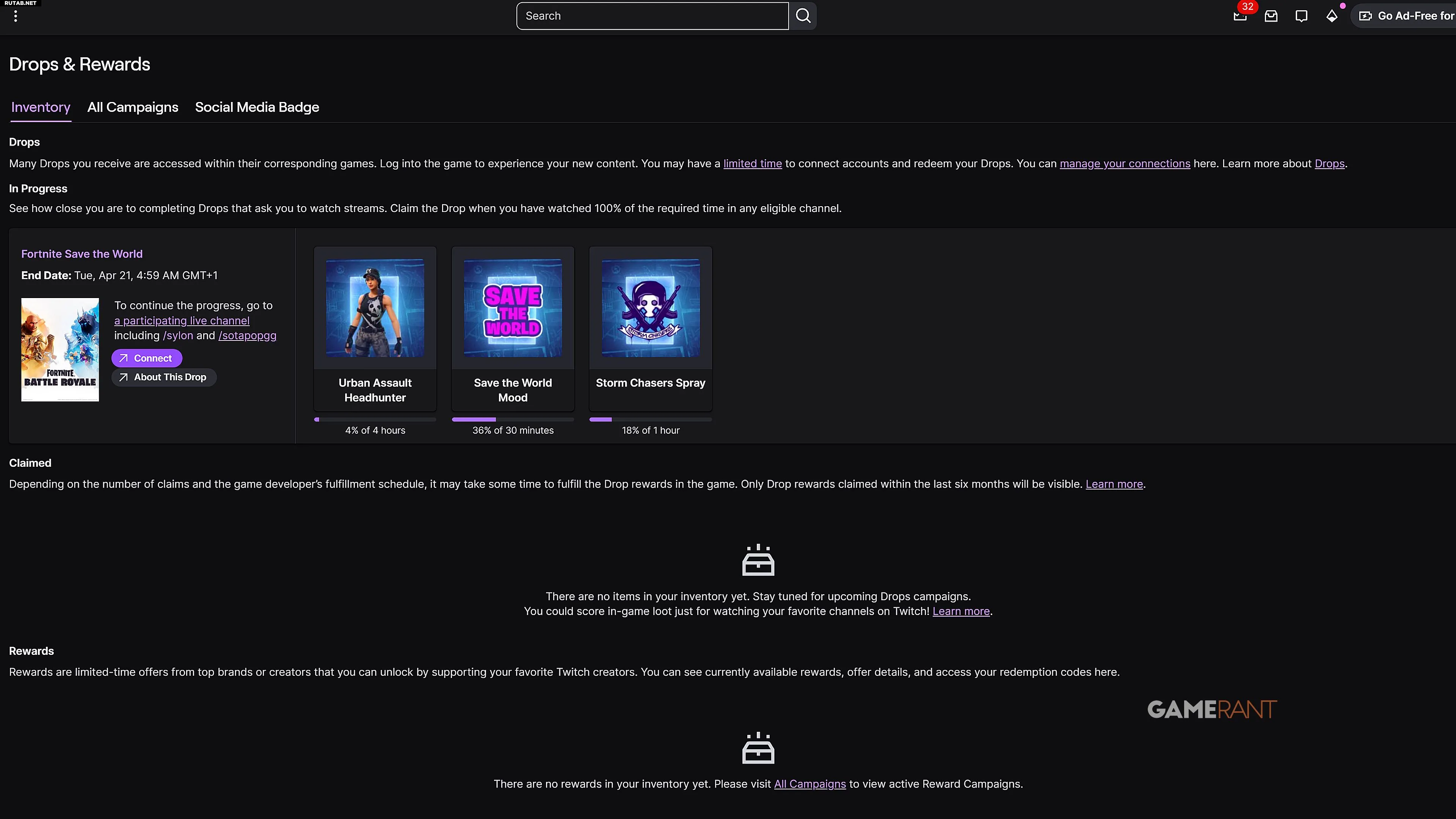 Выполнив указанные выше требования, вы можете забрать каждую из своих наград через инвентарь Drops. После этого предметы будут начислены в Fortnite, обычно сразу. Однако в некоторых случаях это может занять больше времени. Все награды Twitch Drops для Save the World можно получить с настоящего момента до 21 апреля, 00:00. Сами награды можно будет забрать до 28 апреля.