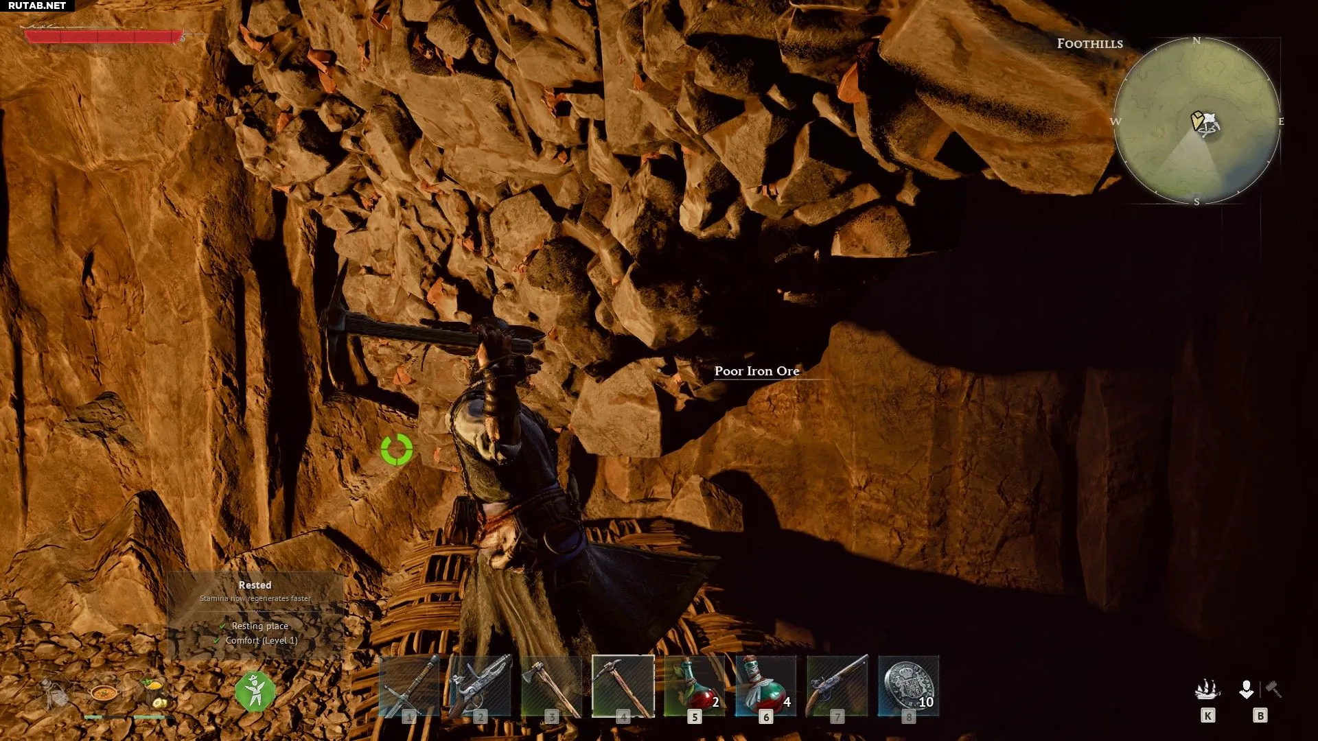 Во-вторых, найдя пещеру с железной рудой, поставьте ещё один Костёр рядом с жилами. Это не только осветит пещеру, но и предотвратит спад баффа «Бодрость», позволяя вам добывать руду сколько угодно.