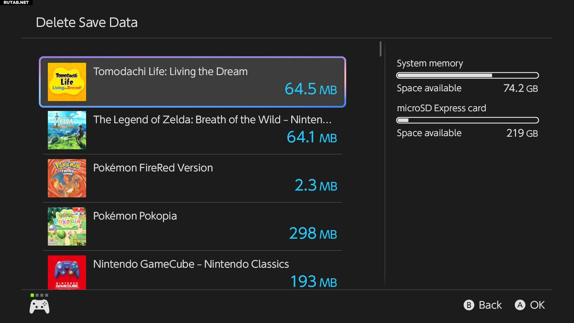 - Подтвердите действие на следующем экране, нажав A в красном окне с надписью «Удалить сохранённые данные».