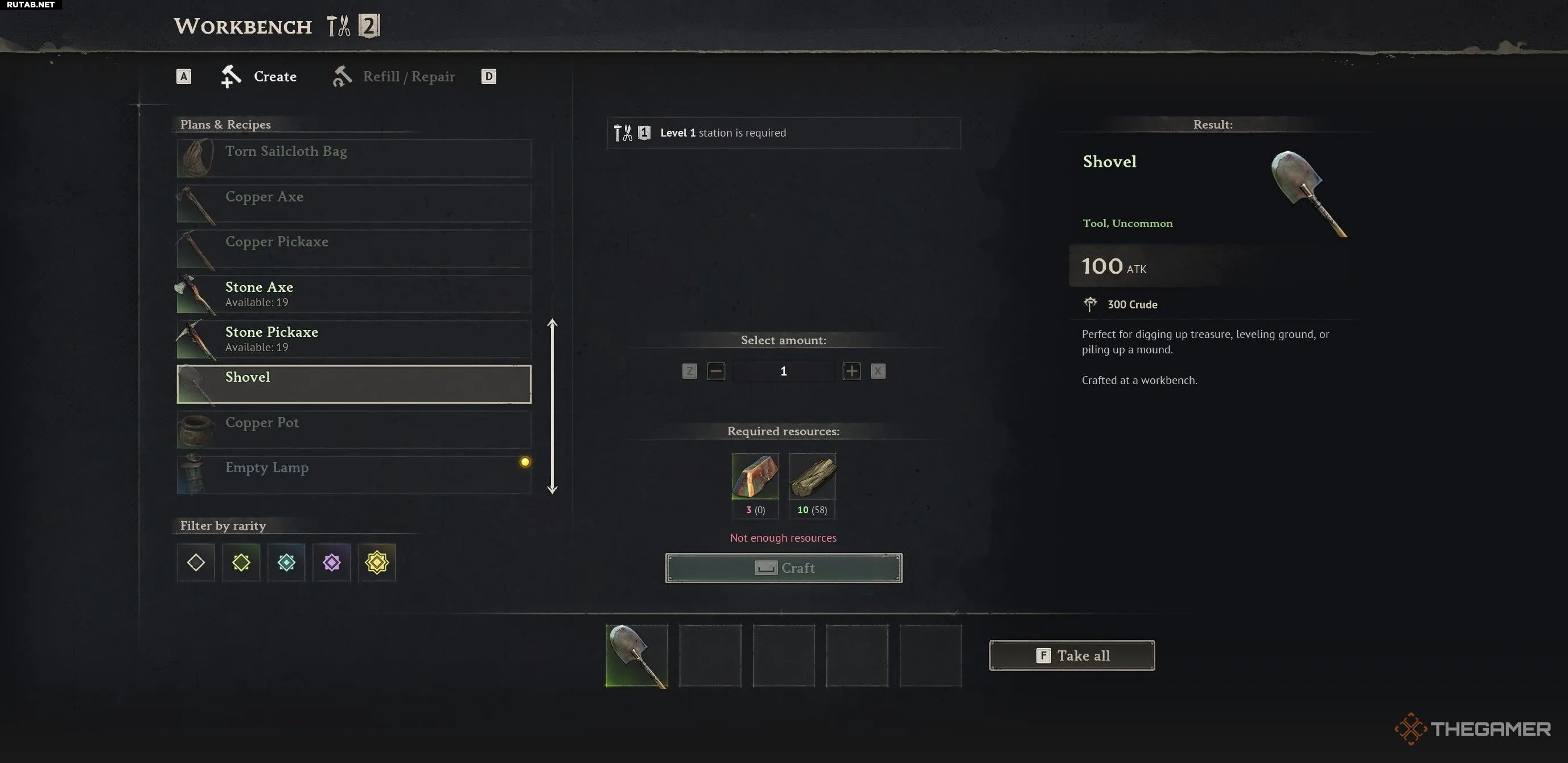 Вам понадобится три медных слитка, прежде чем чертёж лопаты станет доступен на верстаке. Одного или двух слитков недостаточно, так что придётся добыть и переплавить нужное количество меди.