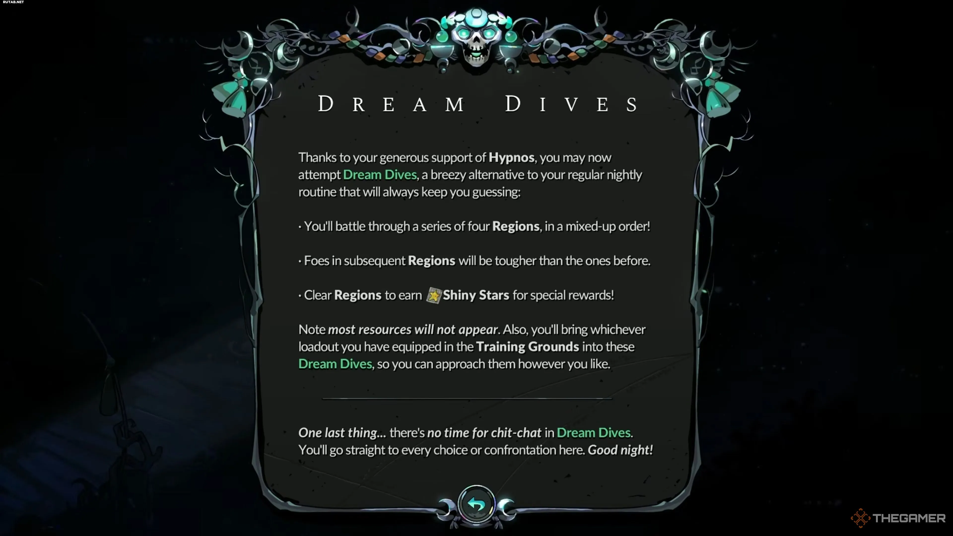 В Погружениях в сны почти не будет ресурсов или материалов для сбора, и вы не сможете общаться с богами при выборе их Даров. Этот режим строго сфокусирован на боях, так что если вы хотите фармить материалы или развивать отношения с определёнными персонажами, вам придётся делать это в другом месте!