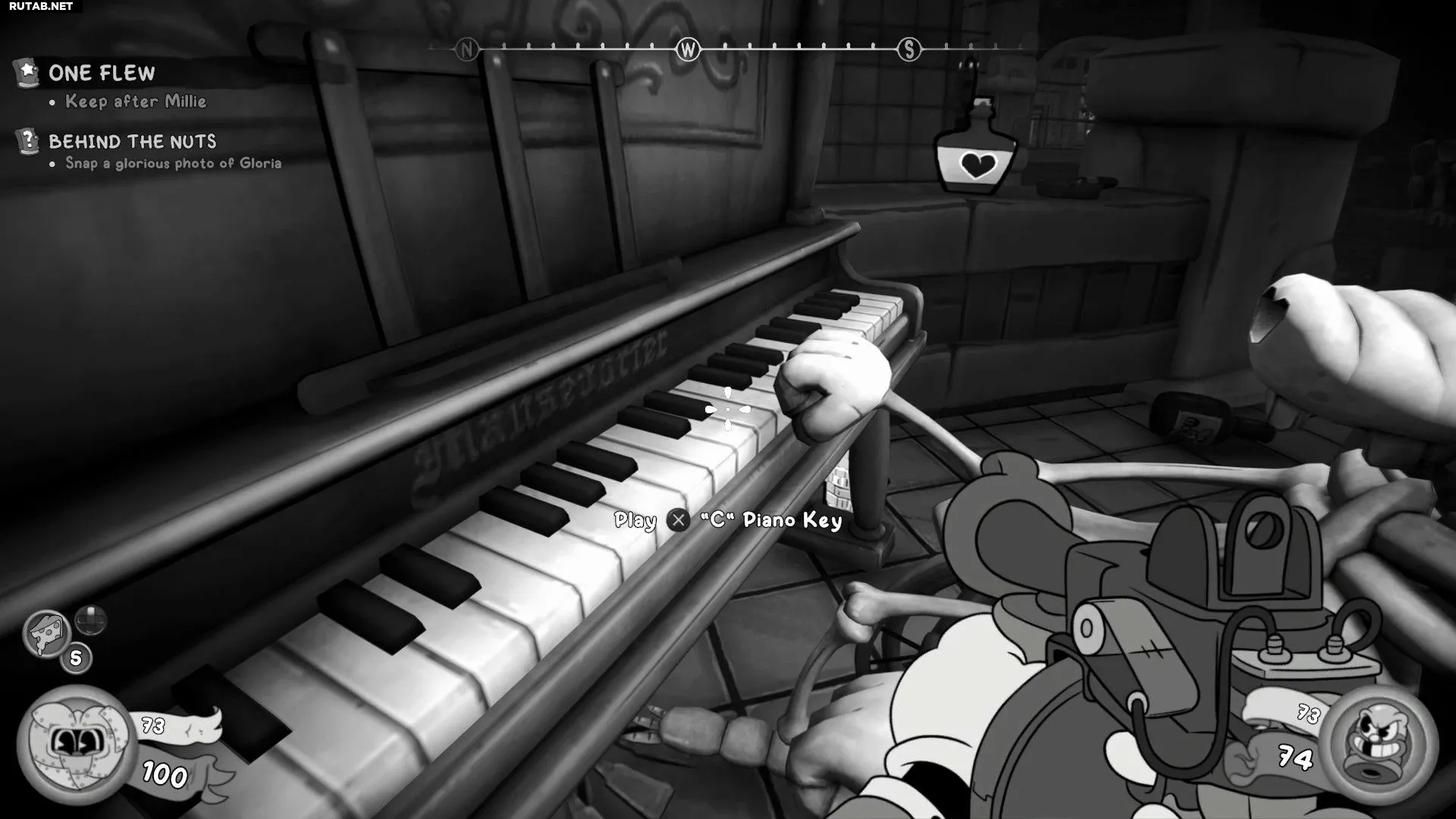 - Перейдите мост и посмотрите налево — вы увидите пианино.