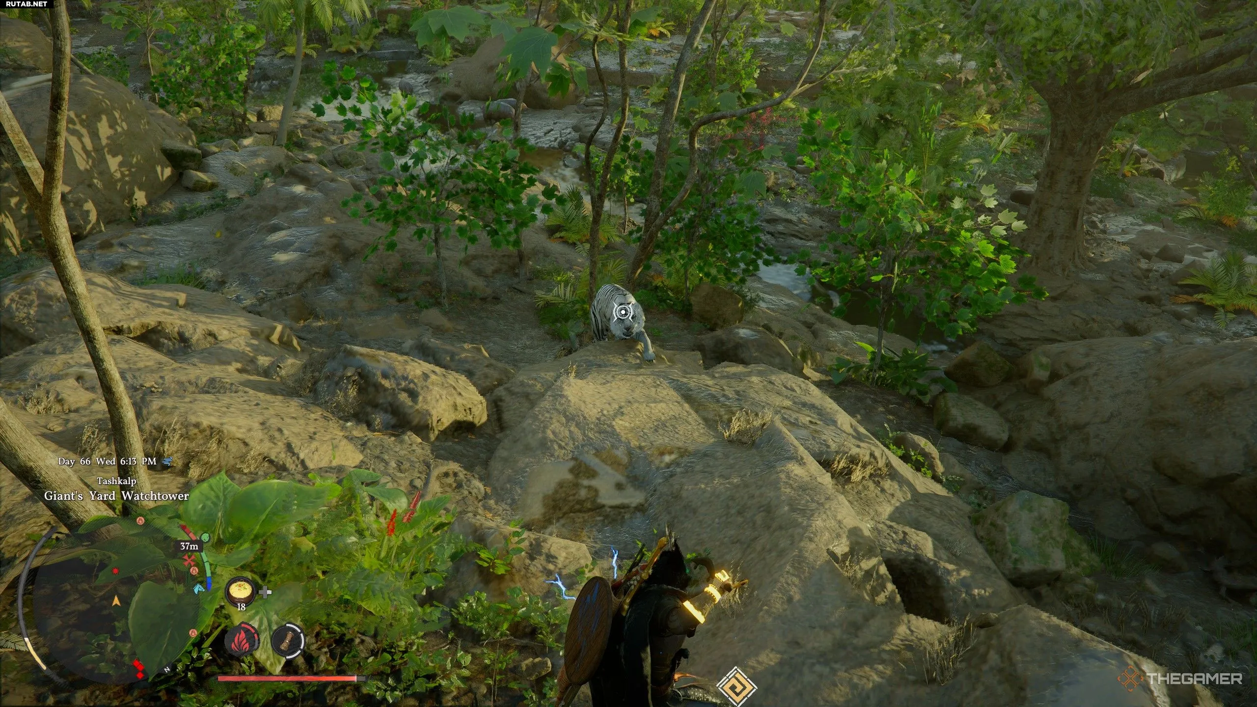 Очистив территорию, направляйтесь прямо на юг от Долины Змеиной Головы, пока не найдёте небольшой пруд у скалы. Там вы обнаружите не только Белого тигра, но и нескольких обычных тигров, которые бродят вместе с ним.