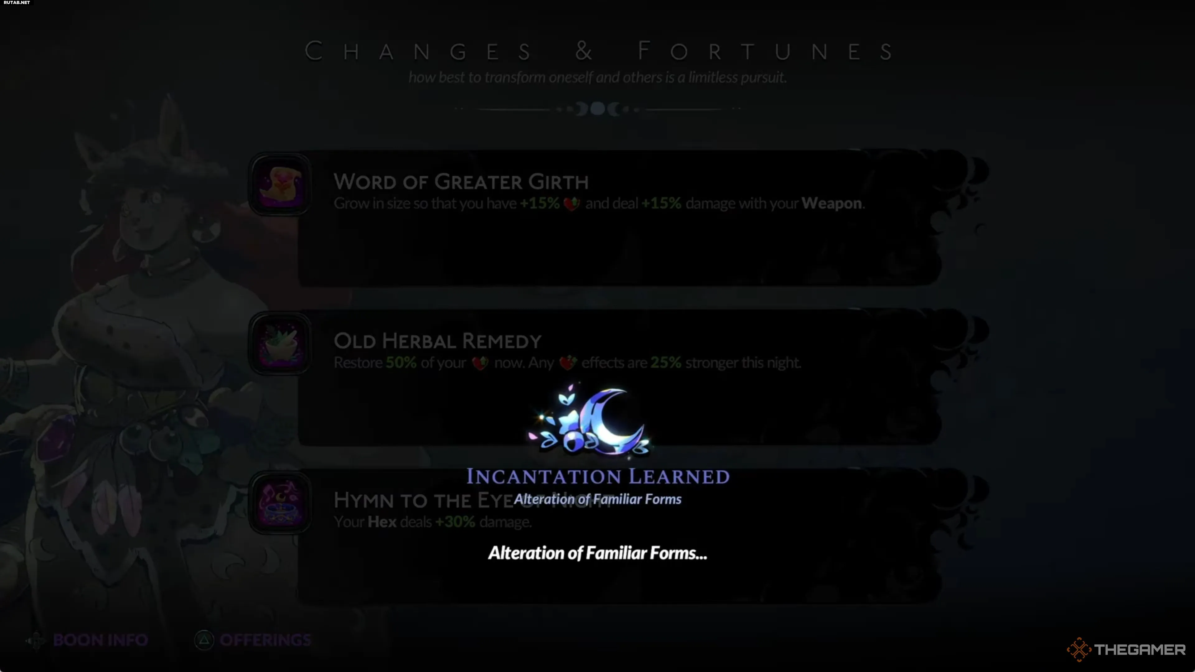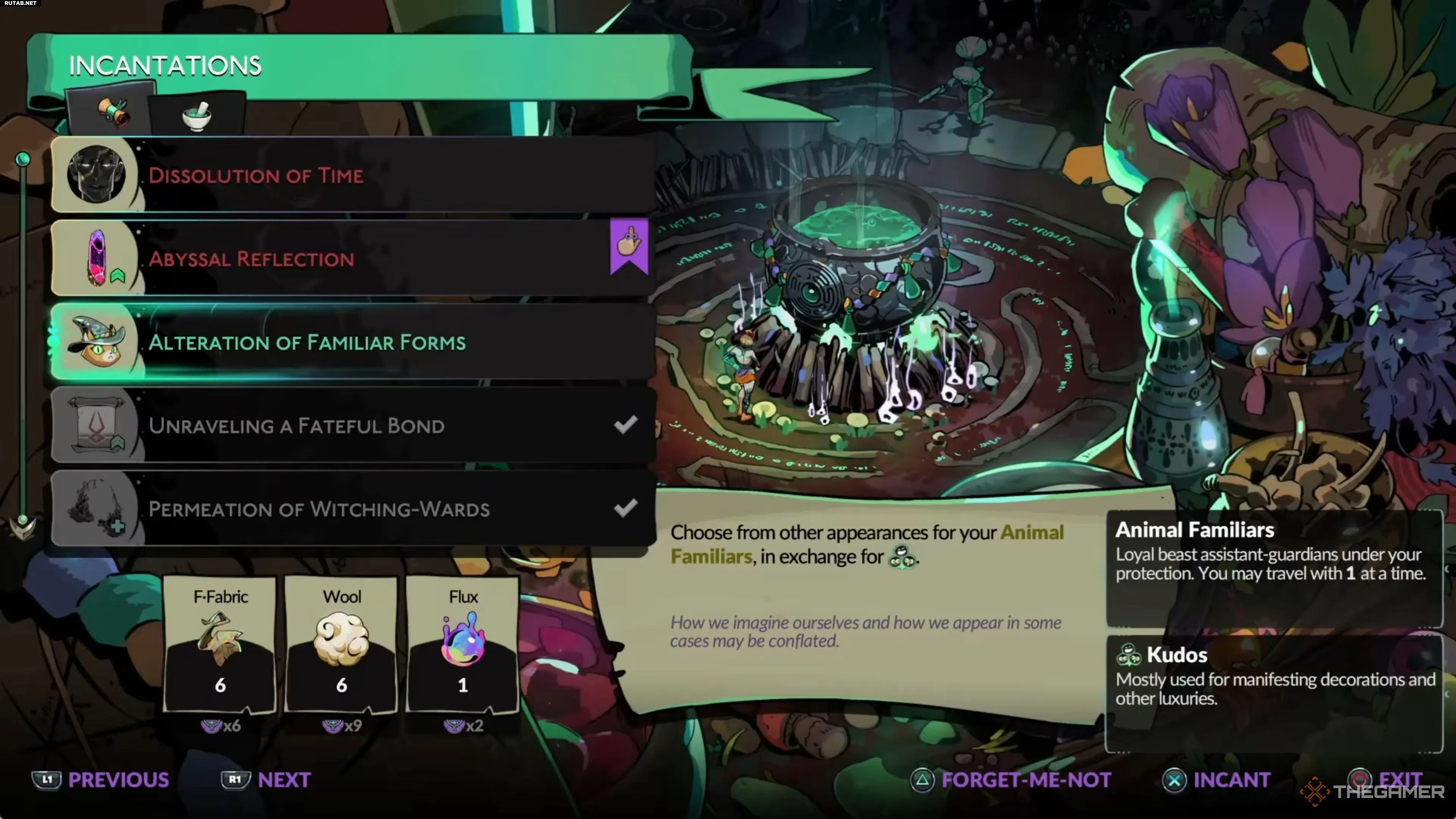 Как только вы получите от Цирцеи заклинание «Изменение форм фамильяров», завершите текущий забег и вернитесь НАЗАД к большому котлу На Распутье. Здесь вы сможете создать заклинание, если у вас есть следующие предметы: