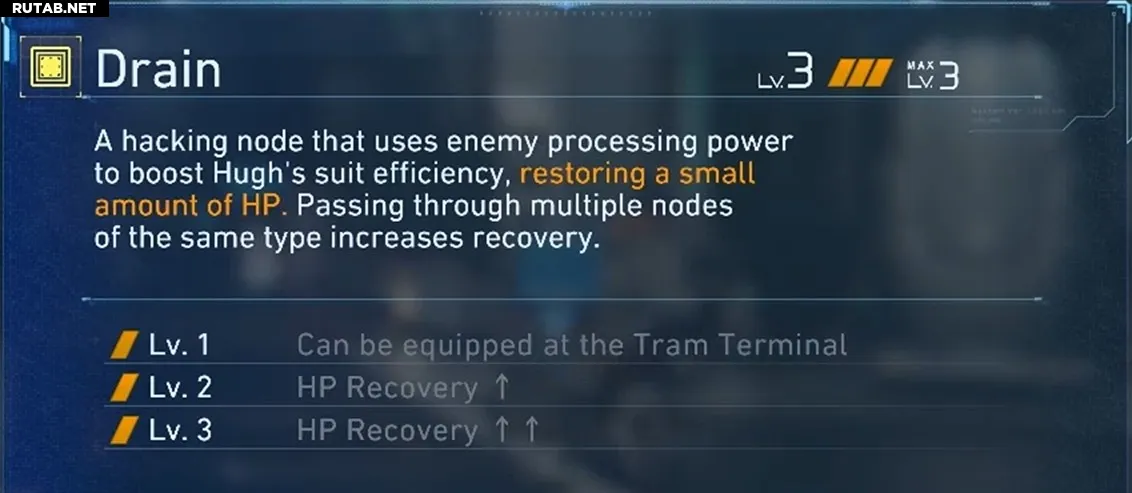 Дренажвосстанавливает вам здоровье за каждый взлом. И лечение не маленькое, так что на бумаге он должен быть выше. Проблема в экономии слота. Место для жёлтых узлов ограничено, и отказ от узла урона или контроля в пользу лечения имеет смысл только тогда, когда вы действительно испытываете трудности, или когда ваша сборка уже сильно завязана на маршрутизацию с Экспозом. Для большинства игроков, которые рано прокачивают характеристику костюма в Firmware Updater, лечение от Дренажа становится излишним, если просто получать меньше ударов.