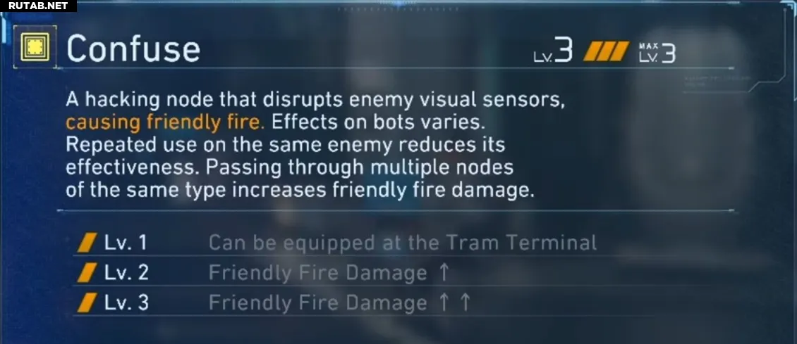 Конфьюзпревращает врагов в ваших решателей проблем. Активируйте узел Конфьюза, и связанные боты начнут атаковать ближайшую цель, которой обычно оказываются друг друга. На практике это забавнее, чем Заморозка, и часто полезнее, поскольку вы получаете контроль над толпой плюс бесплатный урон, пока перестраиваетесь. Единственный случай, когда Конфьюз бесполезен, — это сражение с одиночным элитным врагом, когда в комнате больше не с кем драться.