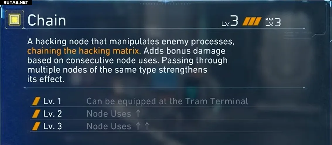 Чейн— это узел урона для игроков, которые относятся к сетке как к головоломке, а не к спринту. Каждый узел, через который вы проходите по маршруту, добавляет бонус к взлому, а прохождение через несколько узлов Чейна на одном маршруте усиливает этот бонус ещё больше. Это особенно ярко проявляется в боях с боссами. Сетки боссов раздуваются далеко за пределы стандартных 12–16 плиток, что даёт Чейну гораздо больше пространства для роста.