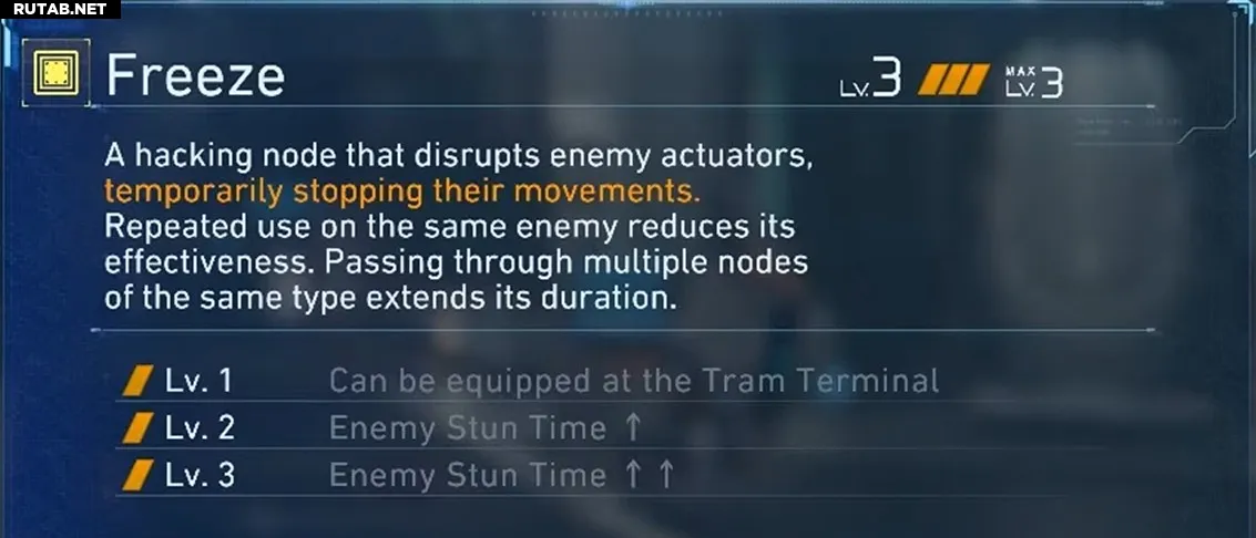 Заморозка— неплохой узел. Это, пожалуй, самое хорошее, что о ней можно сказать. Она обездвиживает врага, позволяя вам разрядить в него весь магазин, что звучит здорово, пока вы не осознаете, что Конфьюз решает ту же проблему, но с дополнительными преимуществами. Заморозка действительно находит своё применение против быстрых летающих врагов и ботов, которые перемещаются во время работы Глушителей, поскольку неподвижная цель даёт вам время попасть в узел EXE, не торопясь с построением маршрута.