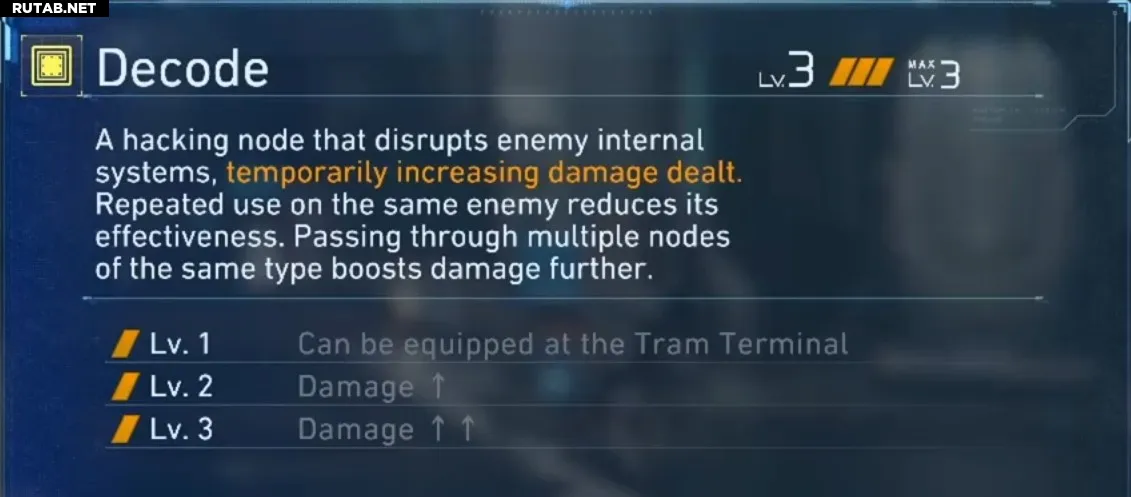 Декодер— это второй узел, который вы почти никогда не снимаете. Он просто заставляет цель получать больше урона. Точка. Никаких странных синергий, которые нужно запоминать. Никаких требований к сборке. Большой запас здоровья, бронирование, узкое окно для атаки — неважно. Декодер работает против всего этого. Объедините его с Charge Piercer, и вы будете пробивать мехов на Массиве Массового Производства гораздо быстрее, чем предполагают цифры на оружии.