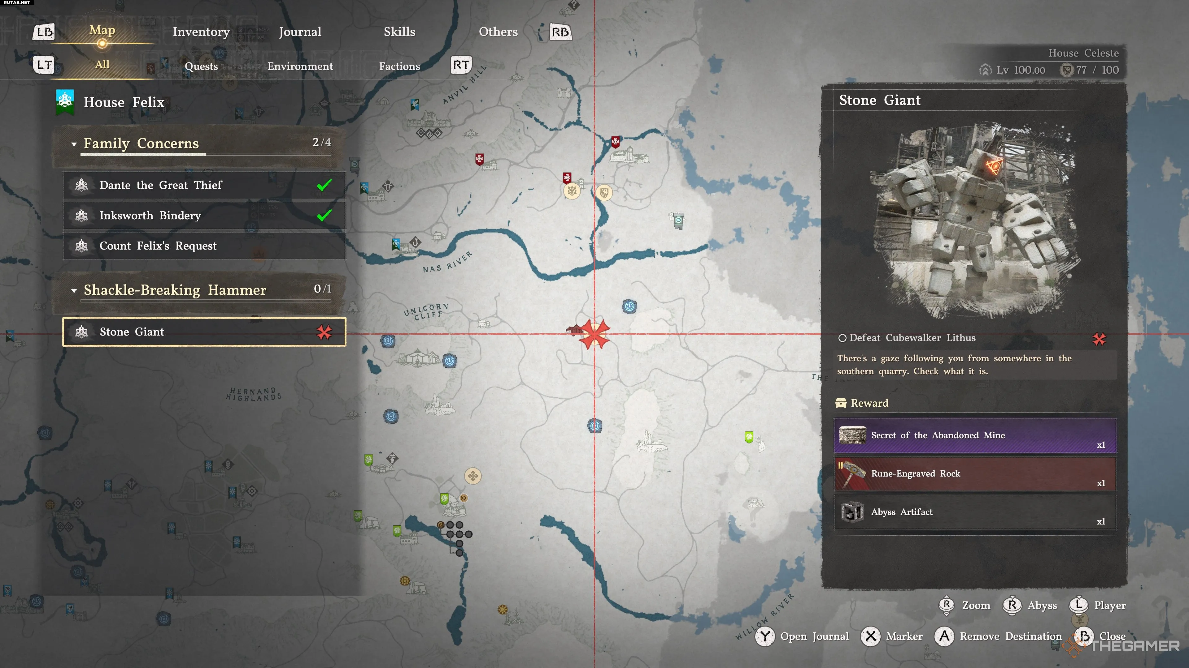 Квест «Каменный гигант» начинается в Южной каменоломне в регионе Эрнанд. Это место находится к востоку от Утеса Единорога, к юго-востоку от реки Нас.