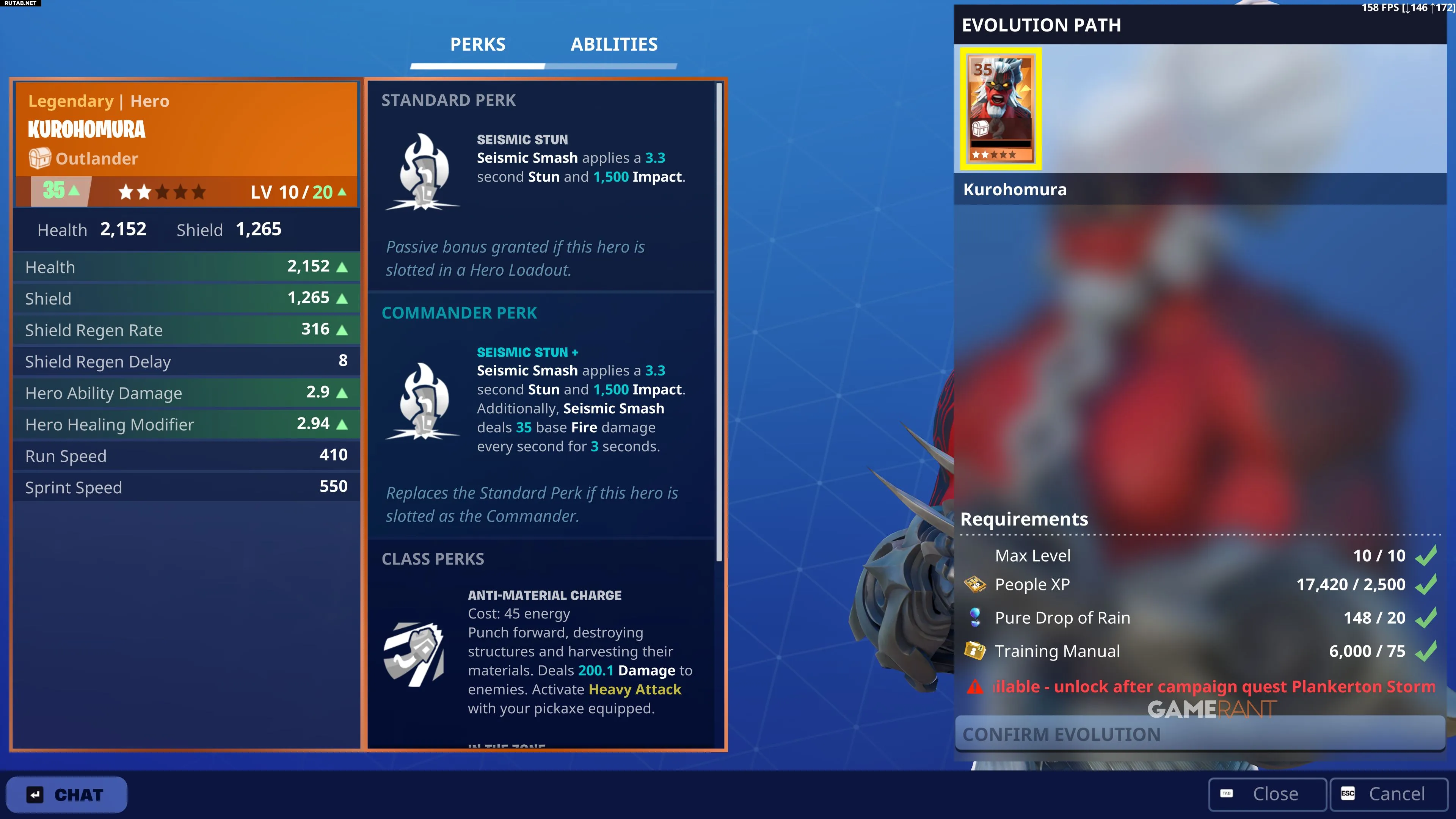 По умолчанию максимальный уровень для Героев ограничен 10. Однако игроки могут получить больше уровней, эволюционировав своих Героев. Чтобы эволюционировать Героя, выберите опцию «Просмотр эволюции» при осмотре Героя максимального уровня. Здесь вы сможете эволюционировать Героев, используя следующие материалы, при условии, что вы выполнили кампанийную миссию «Оборона Бурещита Планкертона 1»: