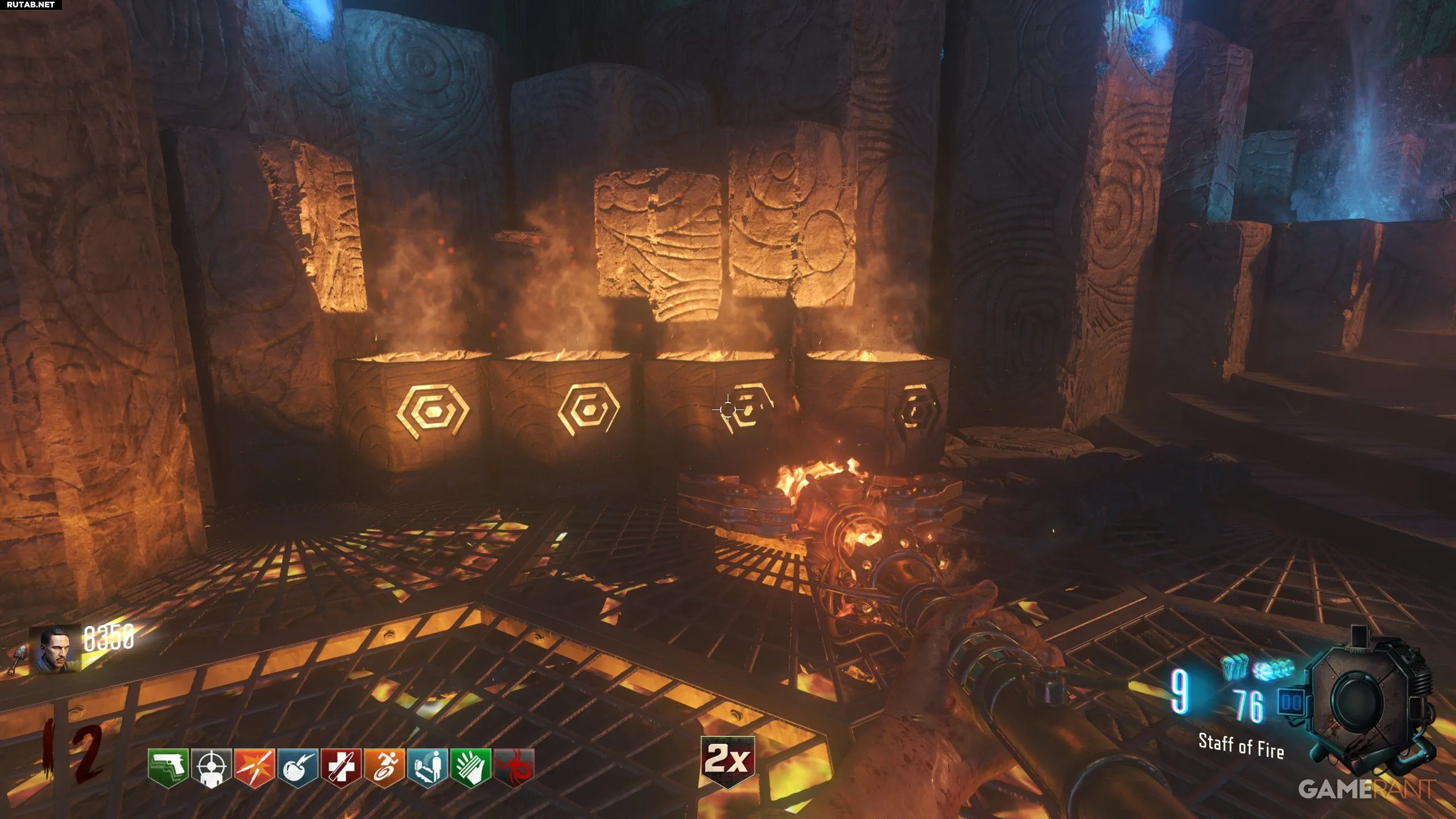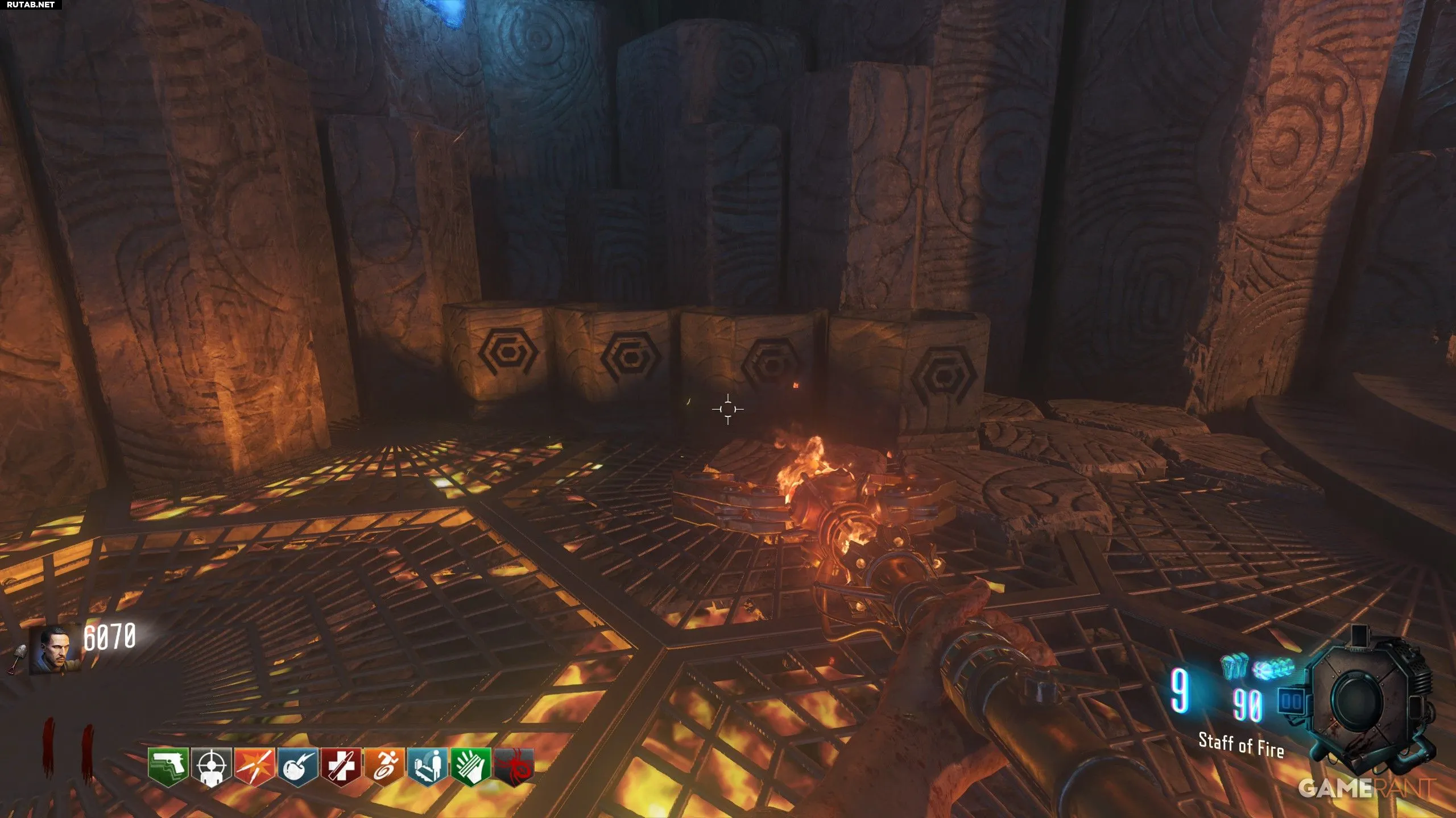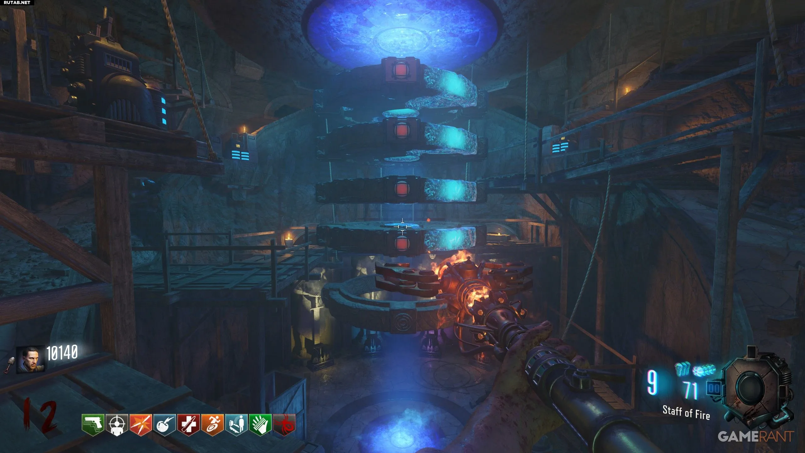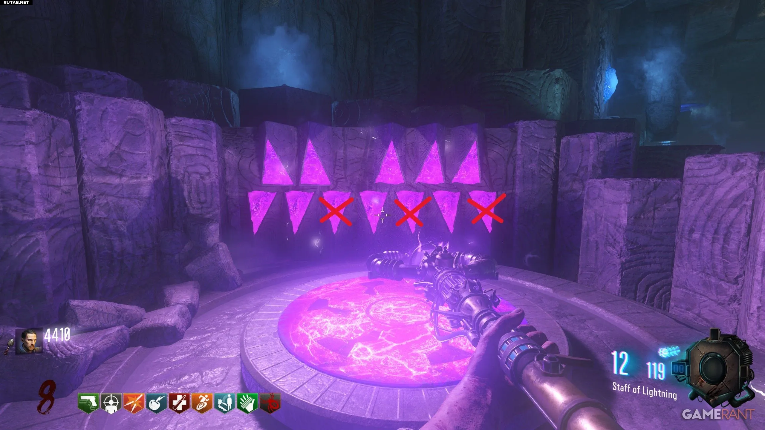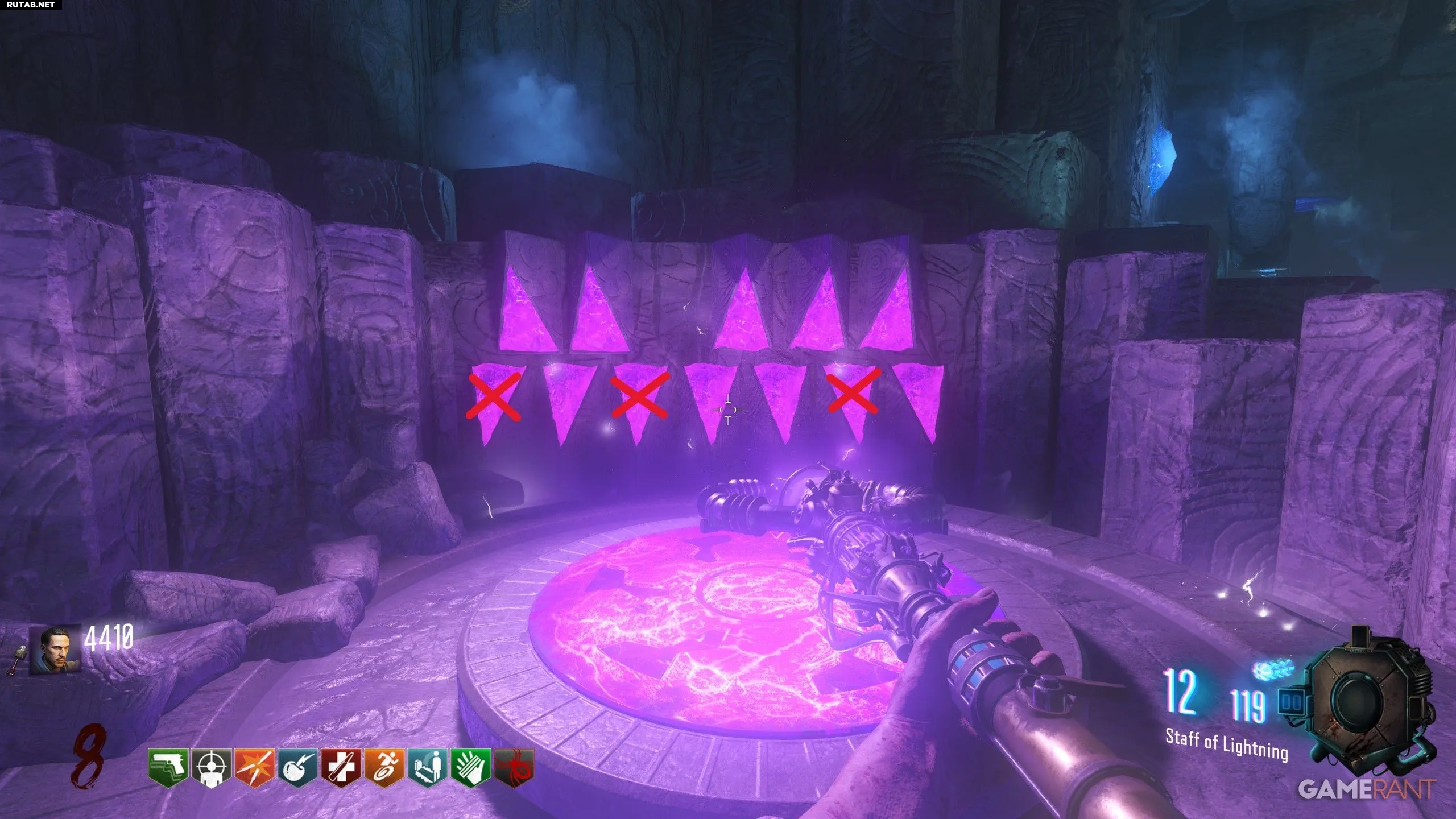 После этого вернитесь к кургану под Pack-a-Punch и потяните четыре рычага до тех пор, пока на каждом вращающемся циферблате не появится красный символ. Наконец, выстрелите в Красную Сферу из Посоха Огня и вернитесь в «Безумное место», чтобы поместить Посох Огня на красный алтарь и совершить более 20 убийств для его улучшения.