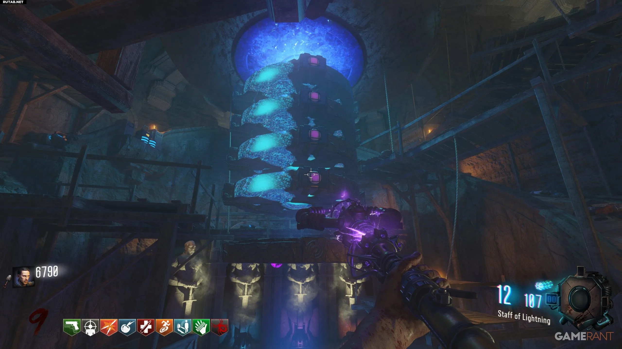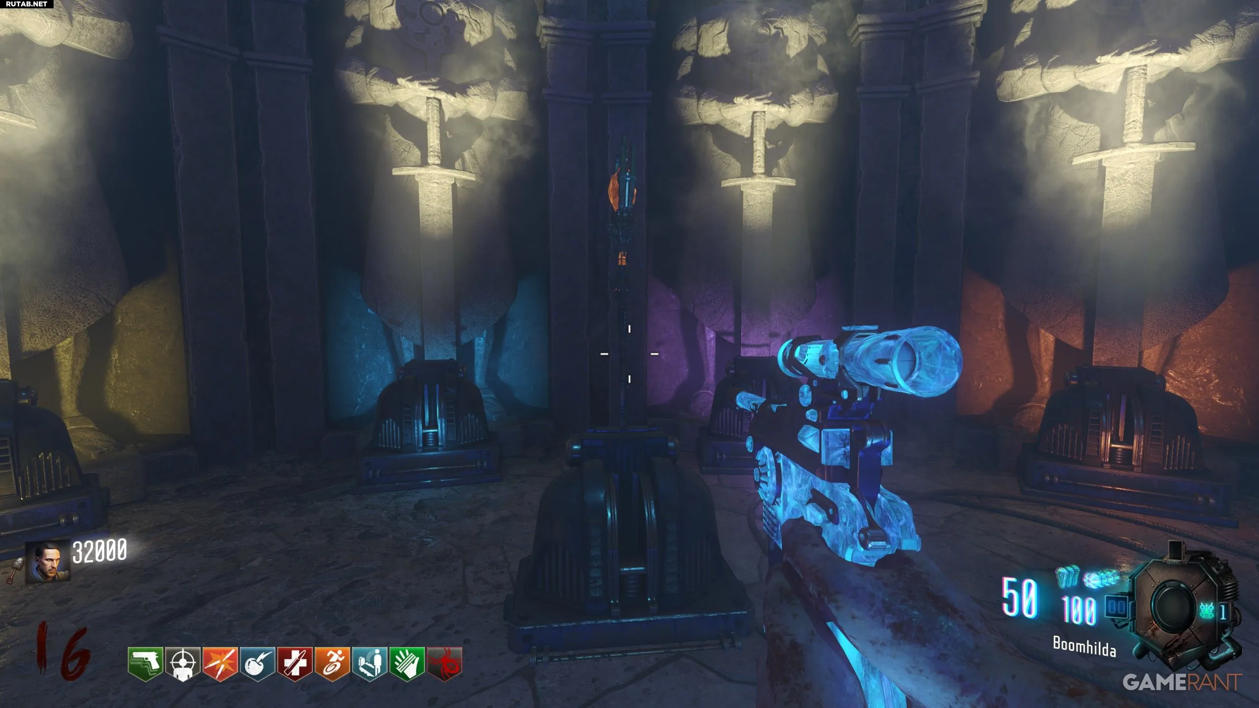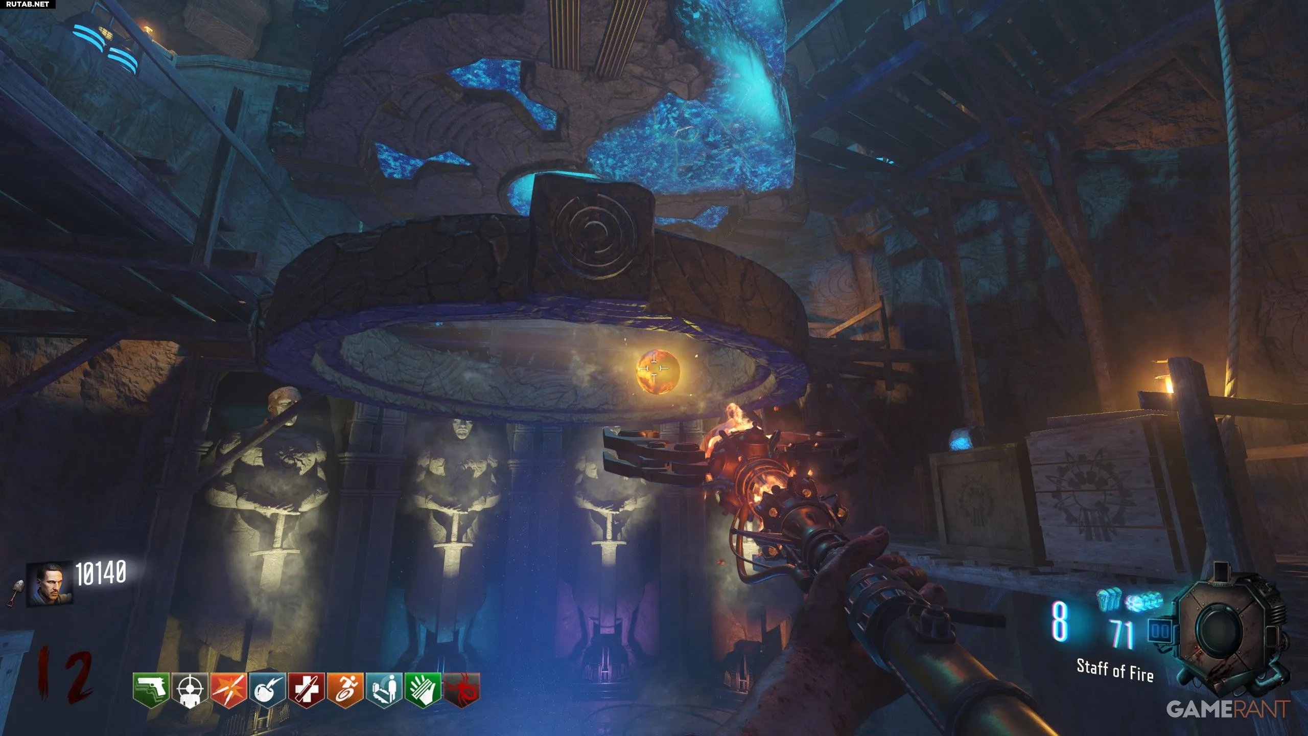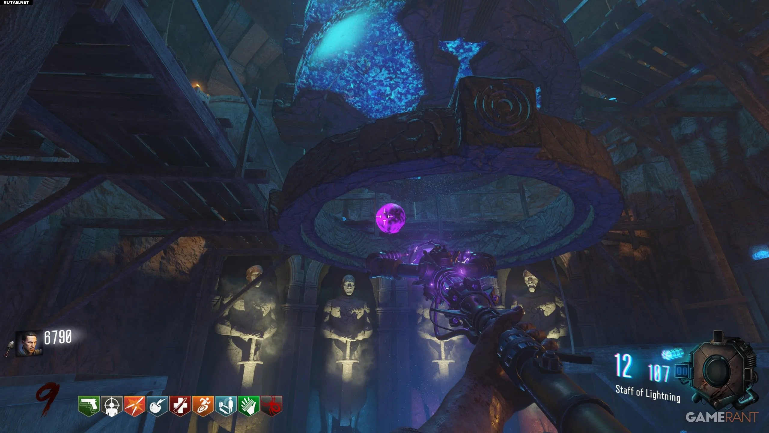 После этого вернитесь к кургану под Pack-a-Punch и потяните четыре рычага до тех пор, пока на каждом вращающемся циферблате не появится красный символ. Наконец, выстрелите в Красную Сферу из Посоха Огня и вернитесь в «Безумное место», чтобы поместить Посох Огня на красный алтарь и совершить более 20 убийств для его улучшения.